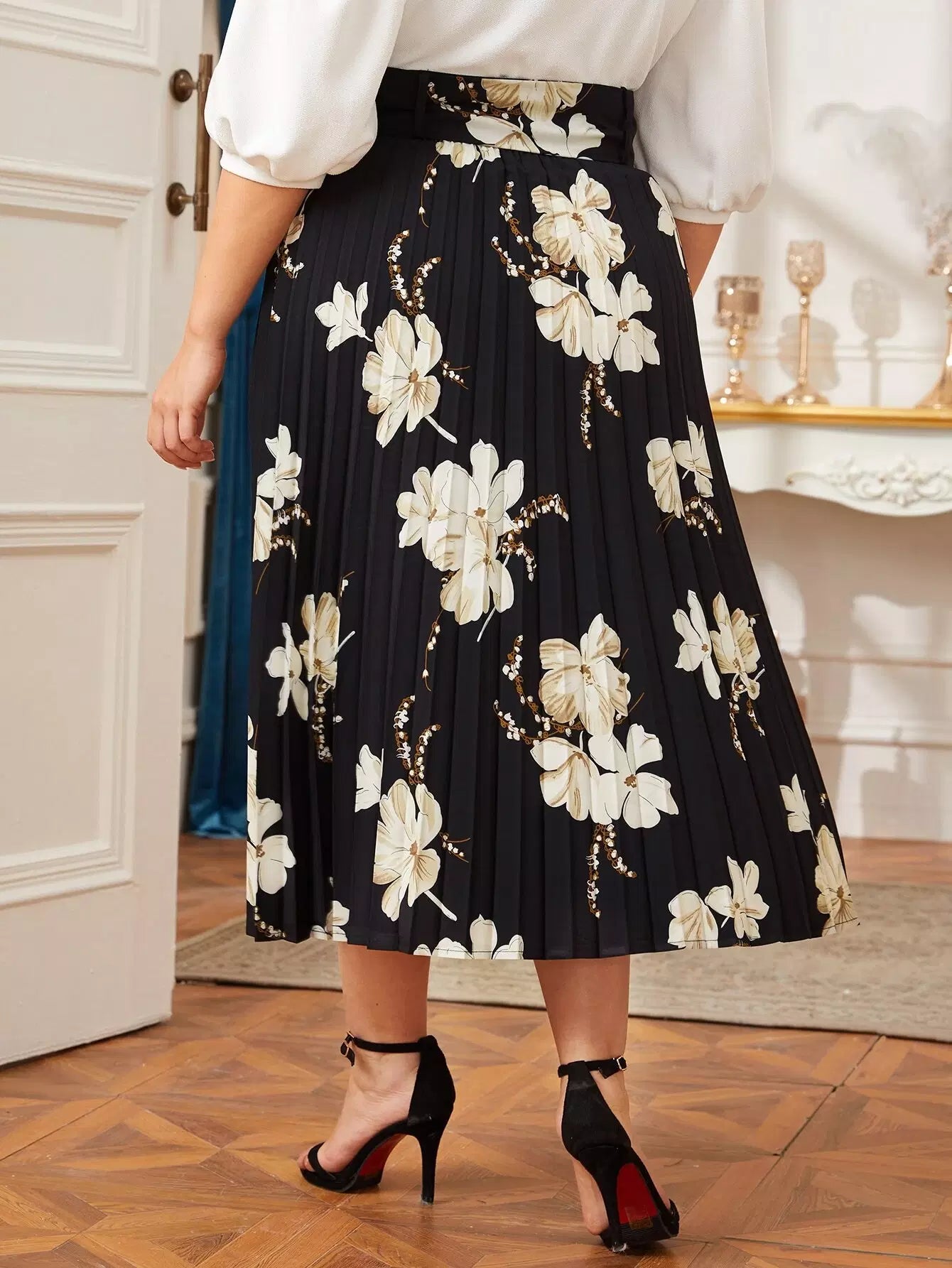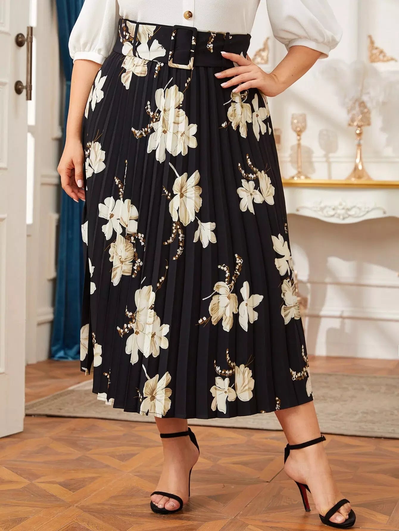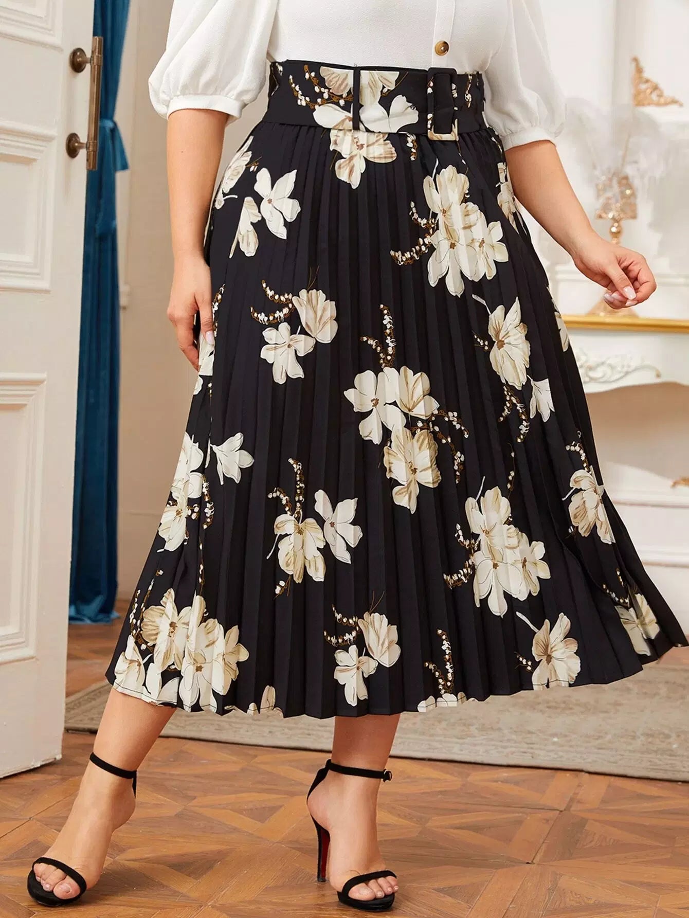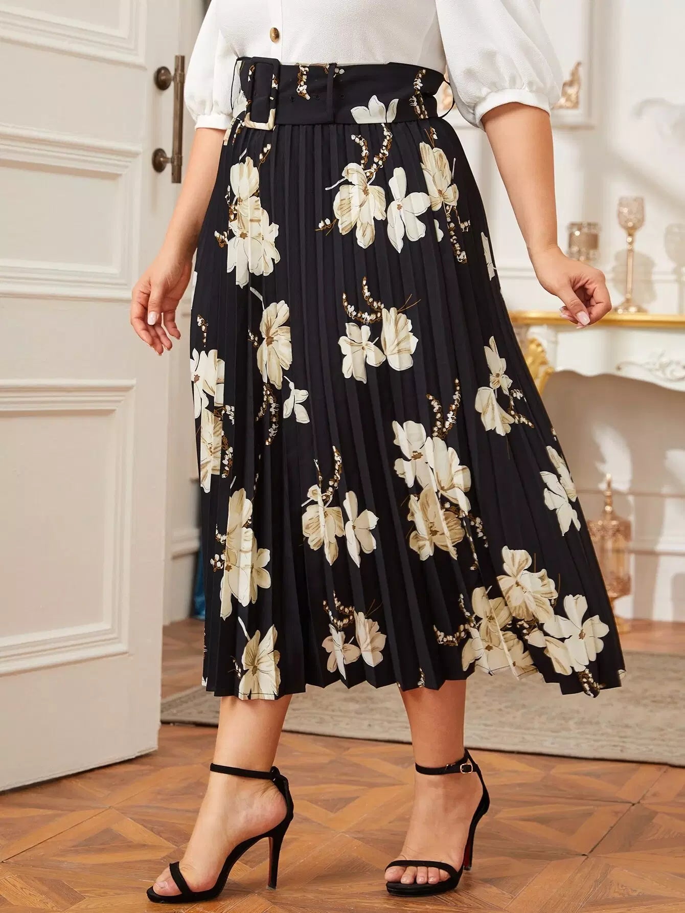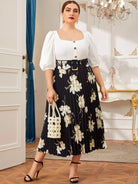Plus Floral Print Buckle Pleated Skirt Without Belt