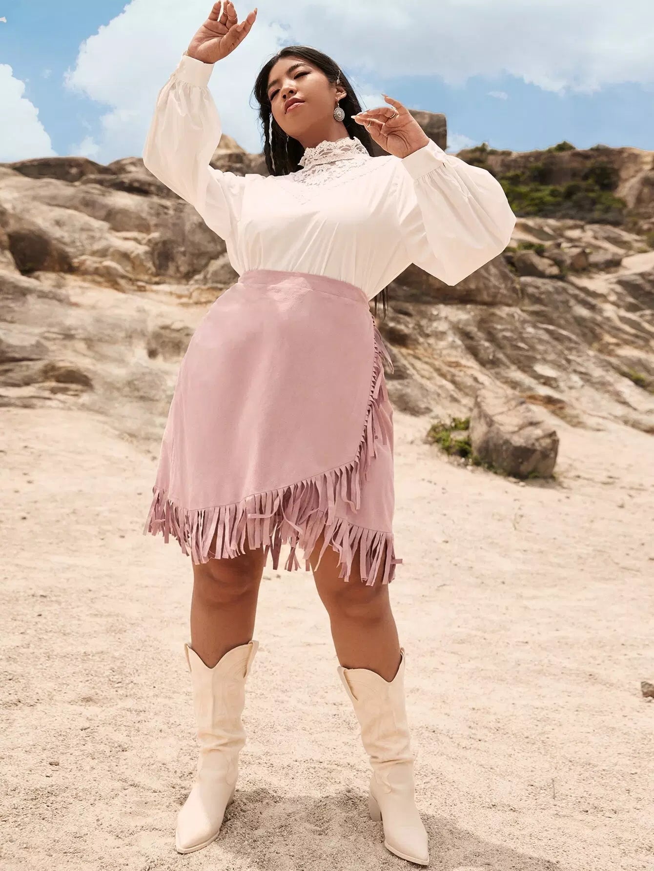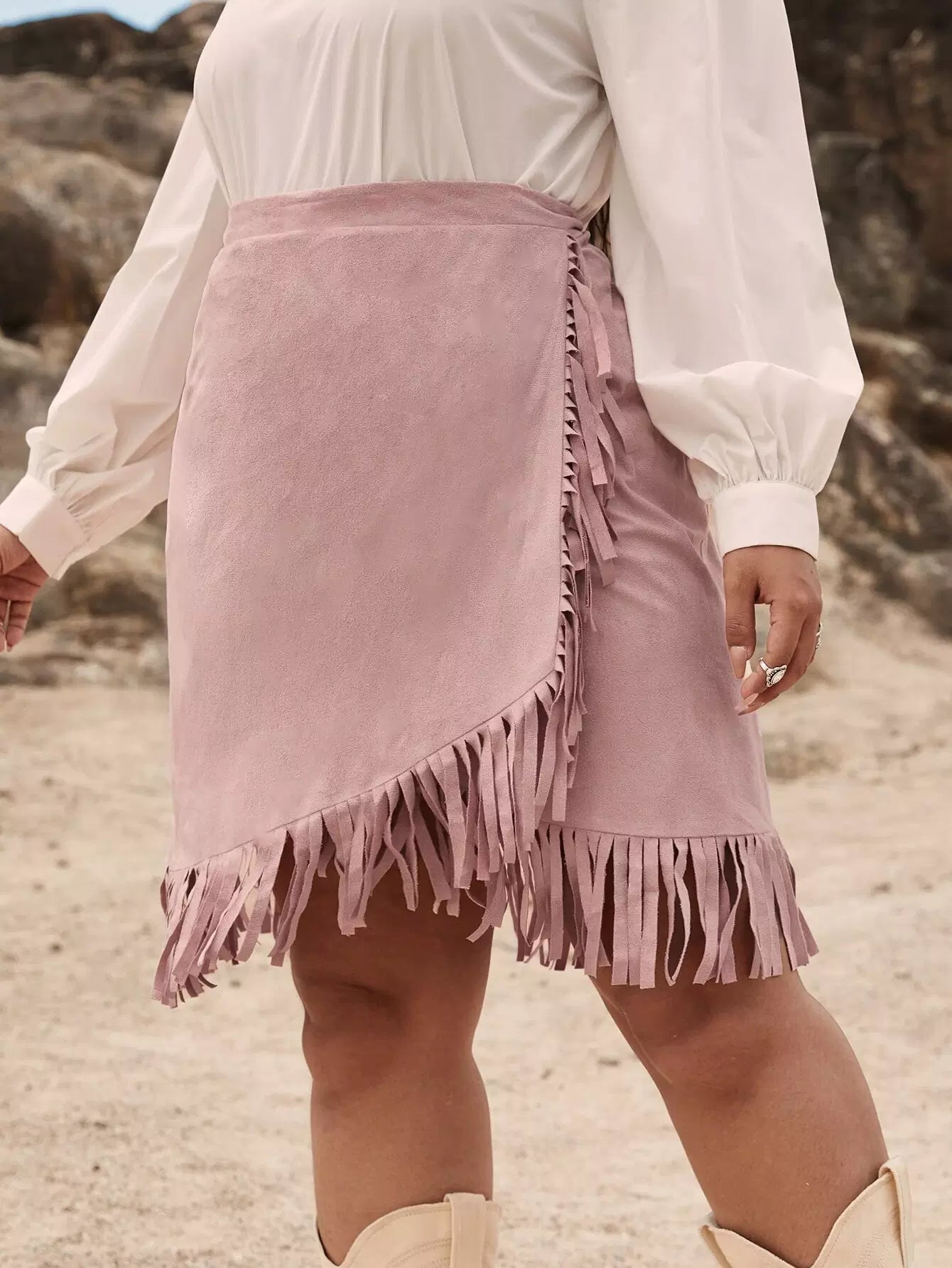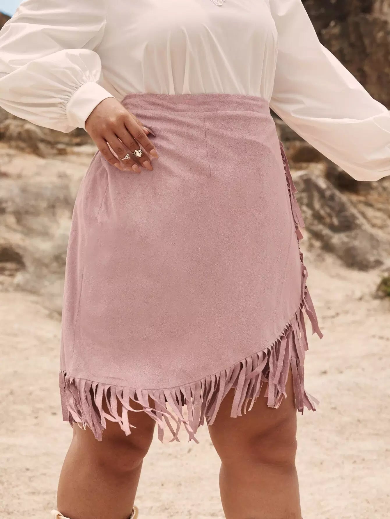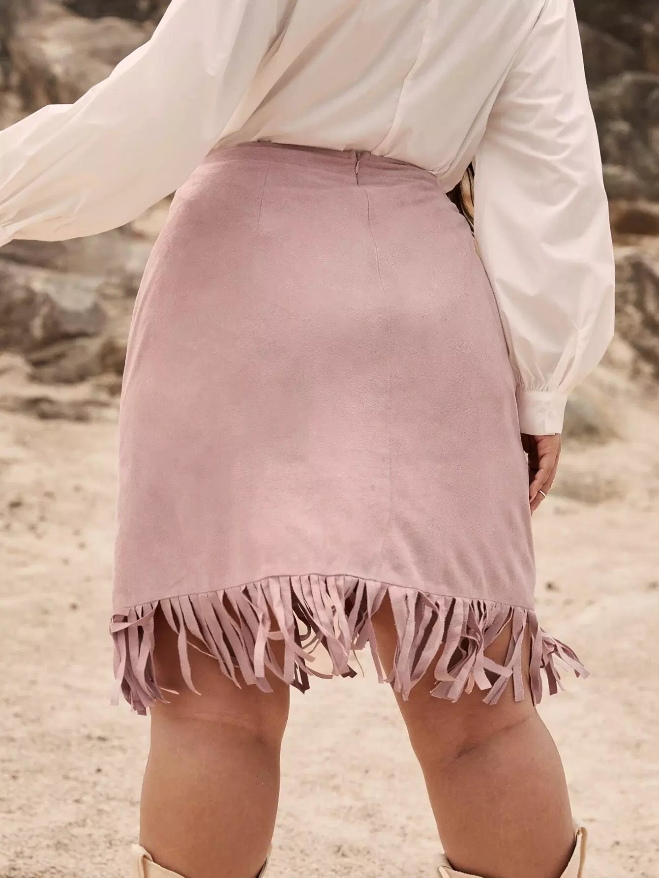 Plus Fringe Hem Tulip Hem Suedette Skirt