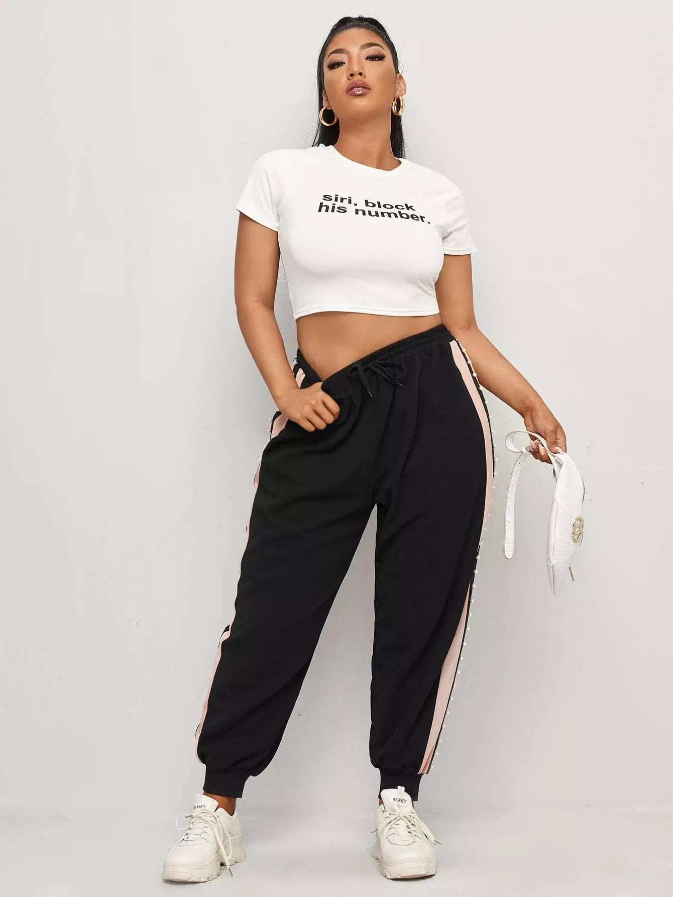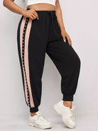 Plus Contrast Panel Pearls Beaded Drawstring Waist Sweatpants