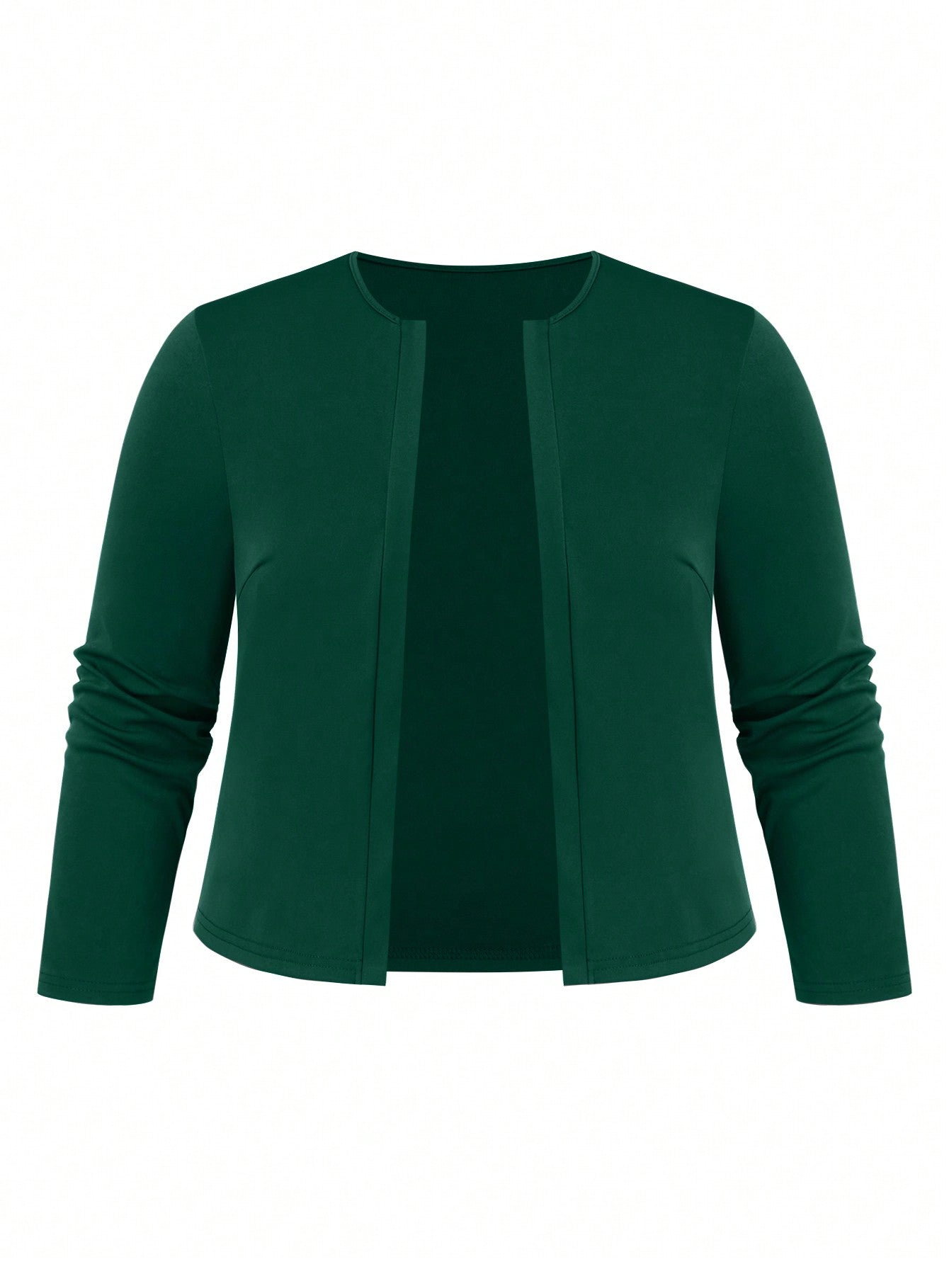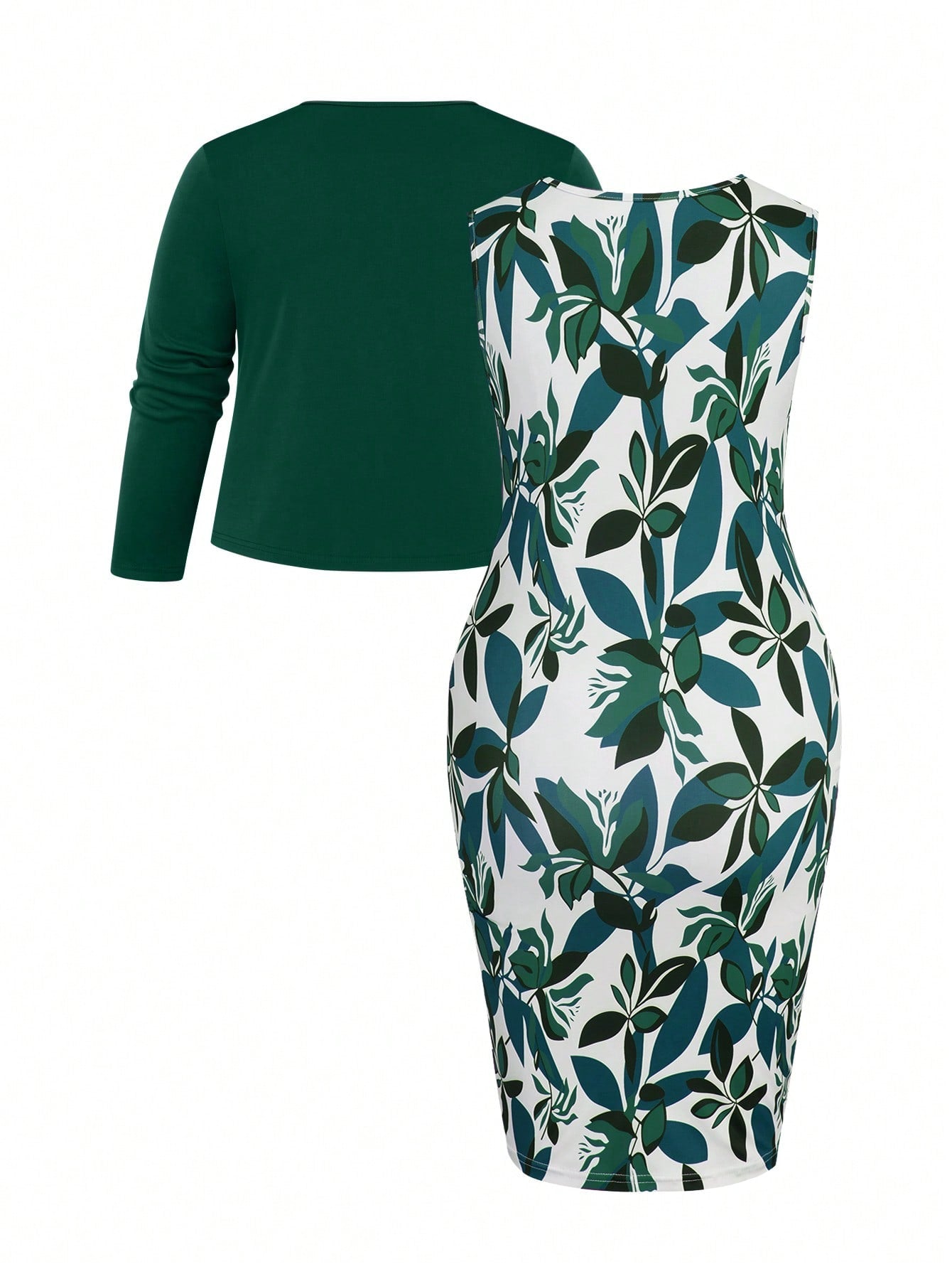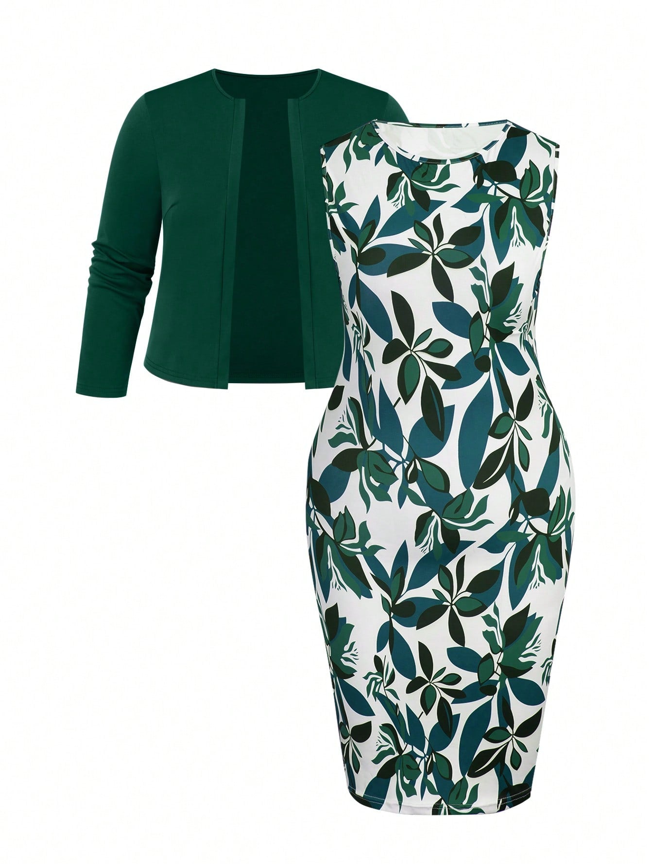 Clasi Plus Size Women 2pcs Set: Solid Long Sleeve Open Front Jacket & Floral Print Round Neck Sleeveless