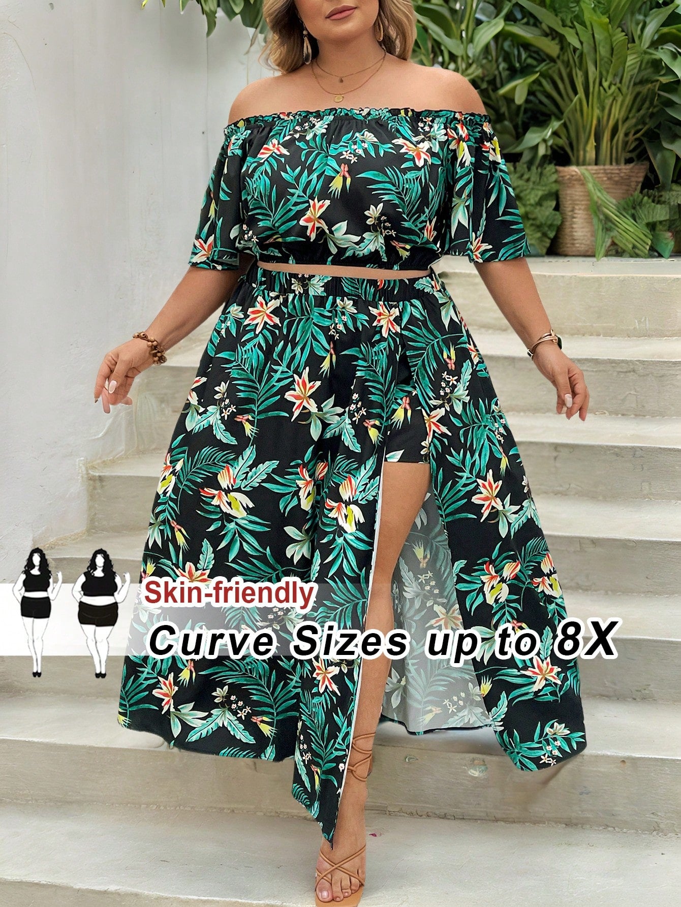 CURVE+ Plus Size Tropical Print Off-Shoulder Cropped Top And Skirt Set,Beach Vacation Two-Piece Set,