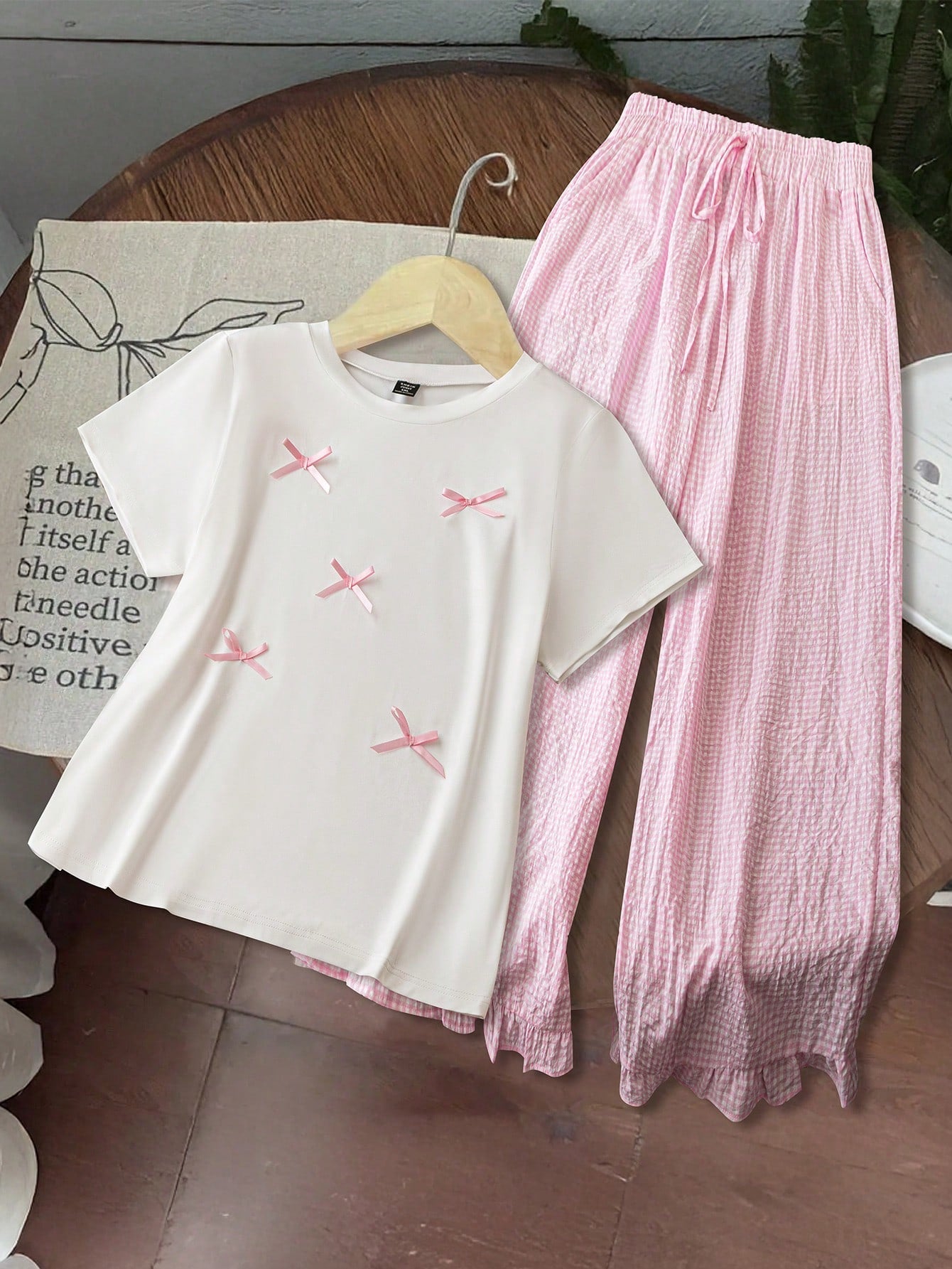 Flirla 2pcs/Set Spring & Summer High-Waist Cute Bow Ruffle T-Shirt And Loose Plaid Pants, Plus Size