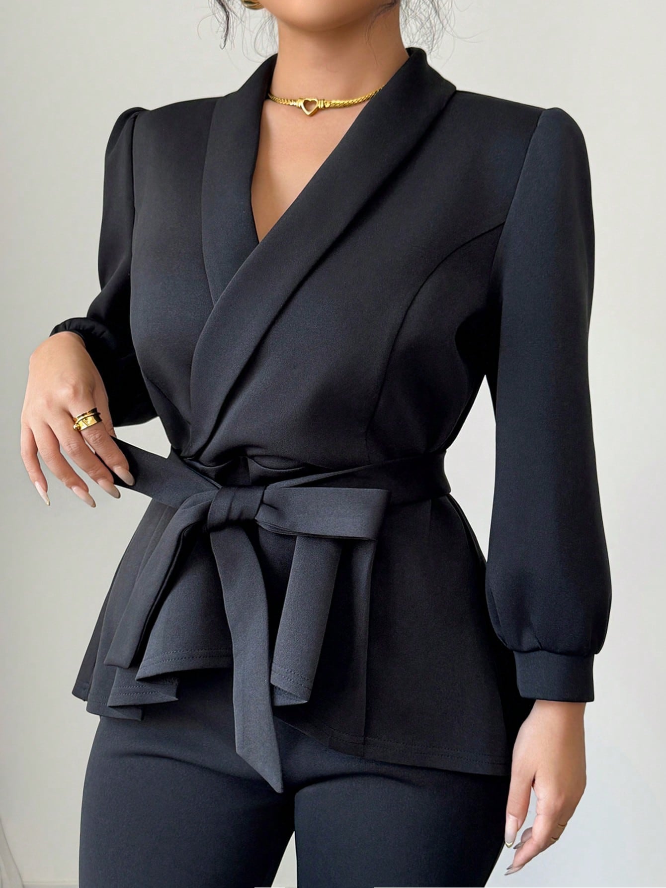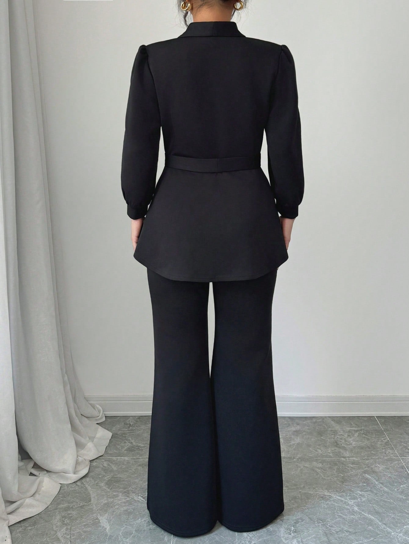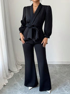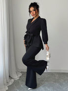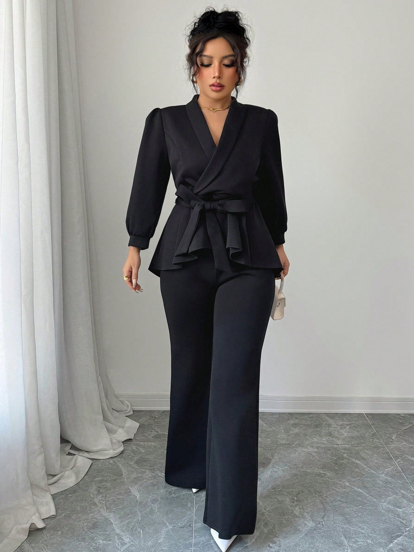 INAWLY 2pcs Plus Size Women Elegant Long Sleeve Ruffle Trim Jacket And Pants Set