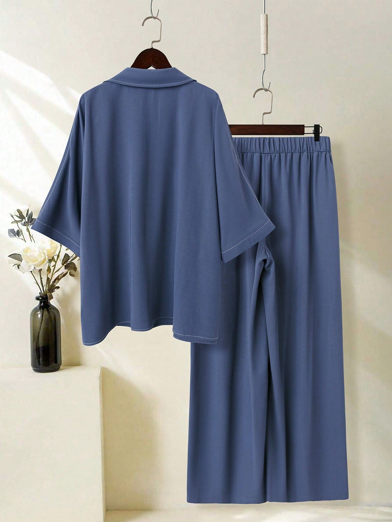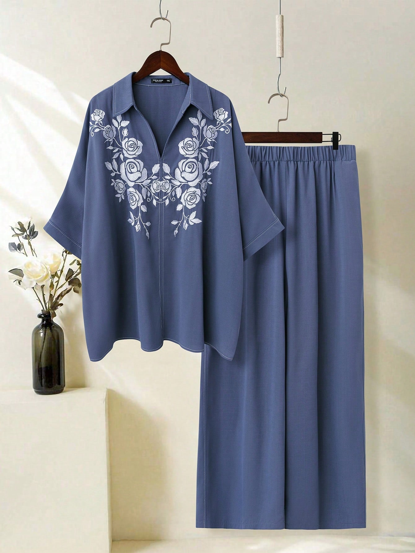 Lacomfia Plus Size Floral Print Batwing Blouse & Pants 2 Pieces Set