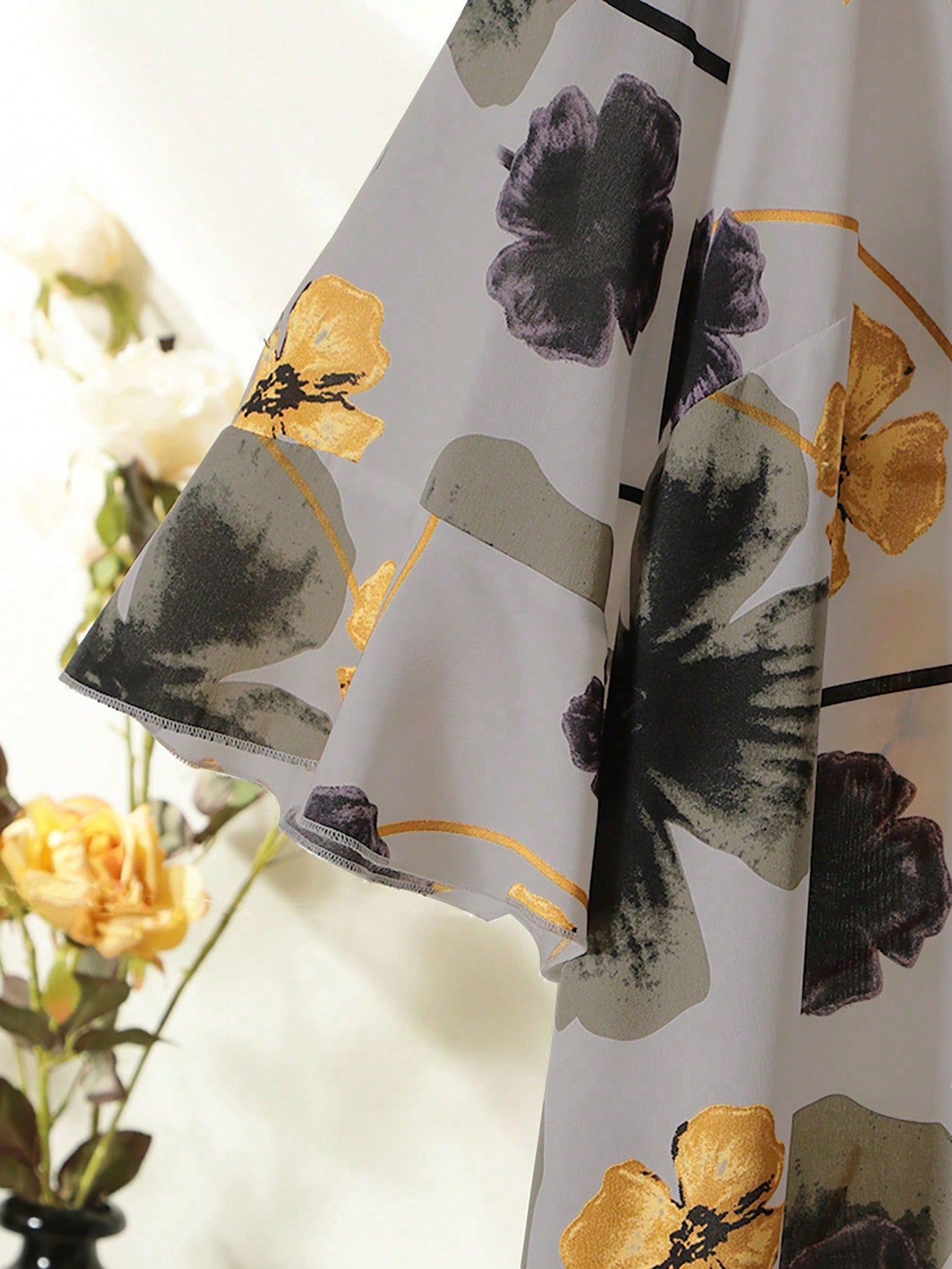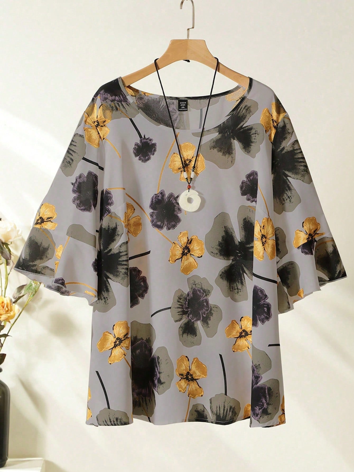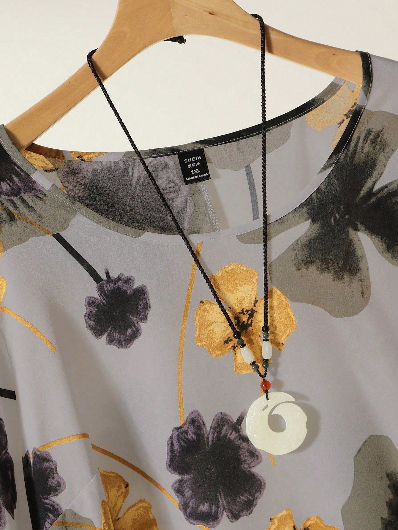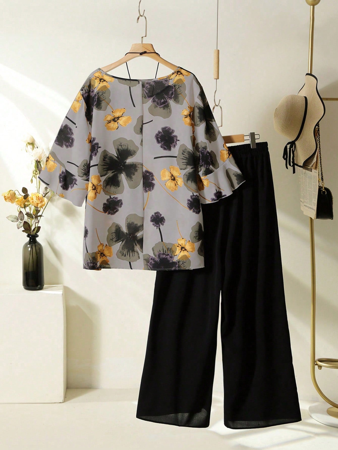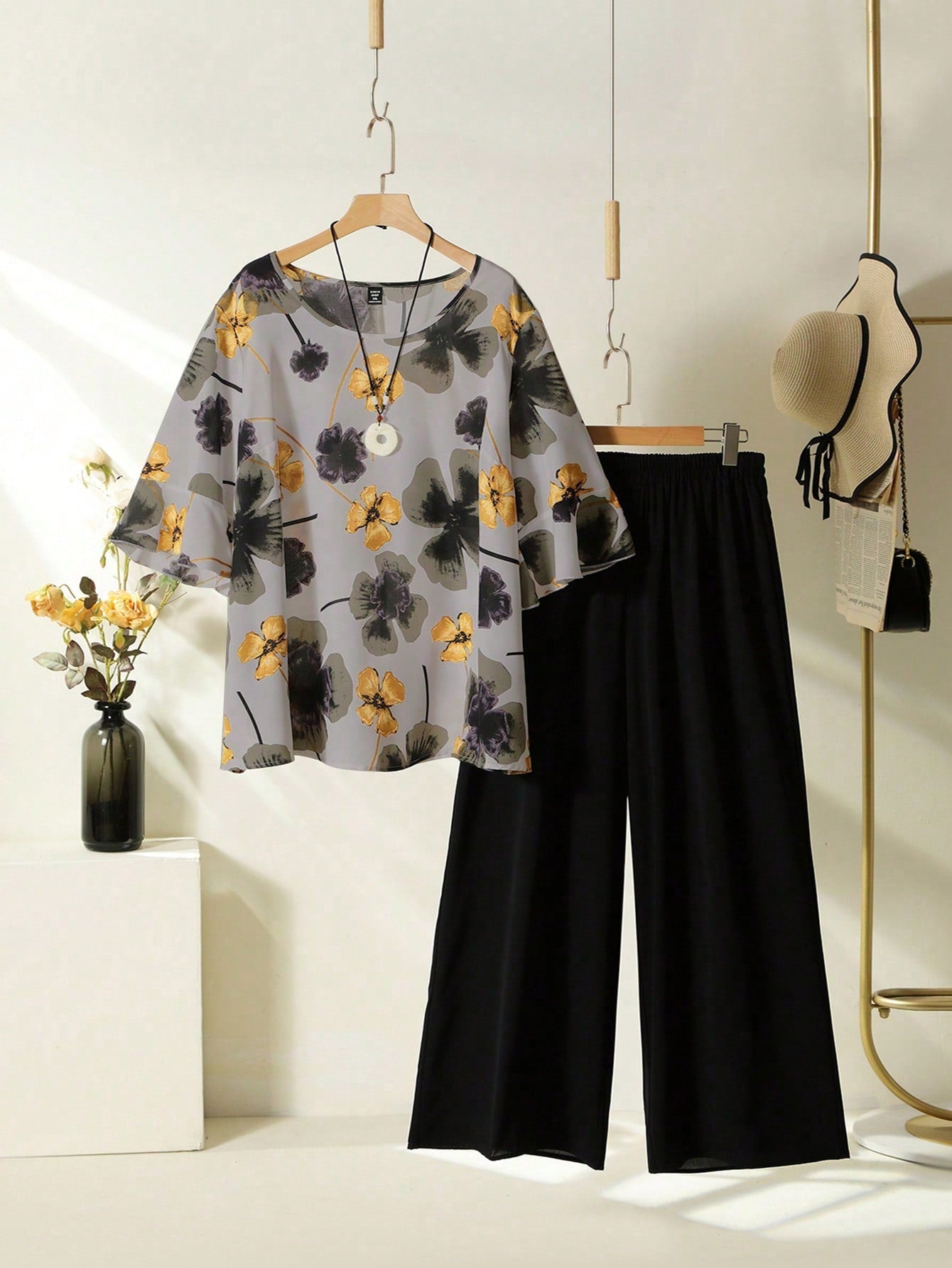 Lacomfia Plus Size Round Neck Short Sleeve Allover Print Top And Pants Casual 2pcs Set, Random Print