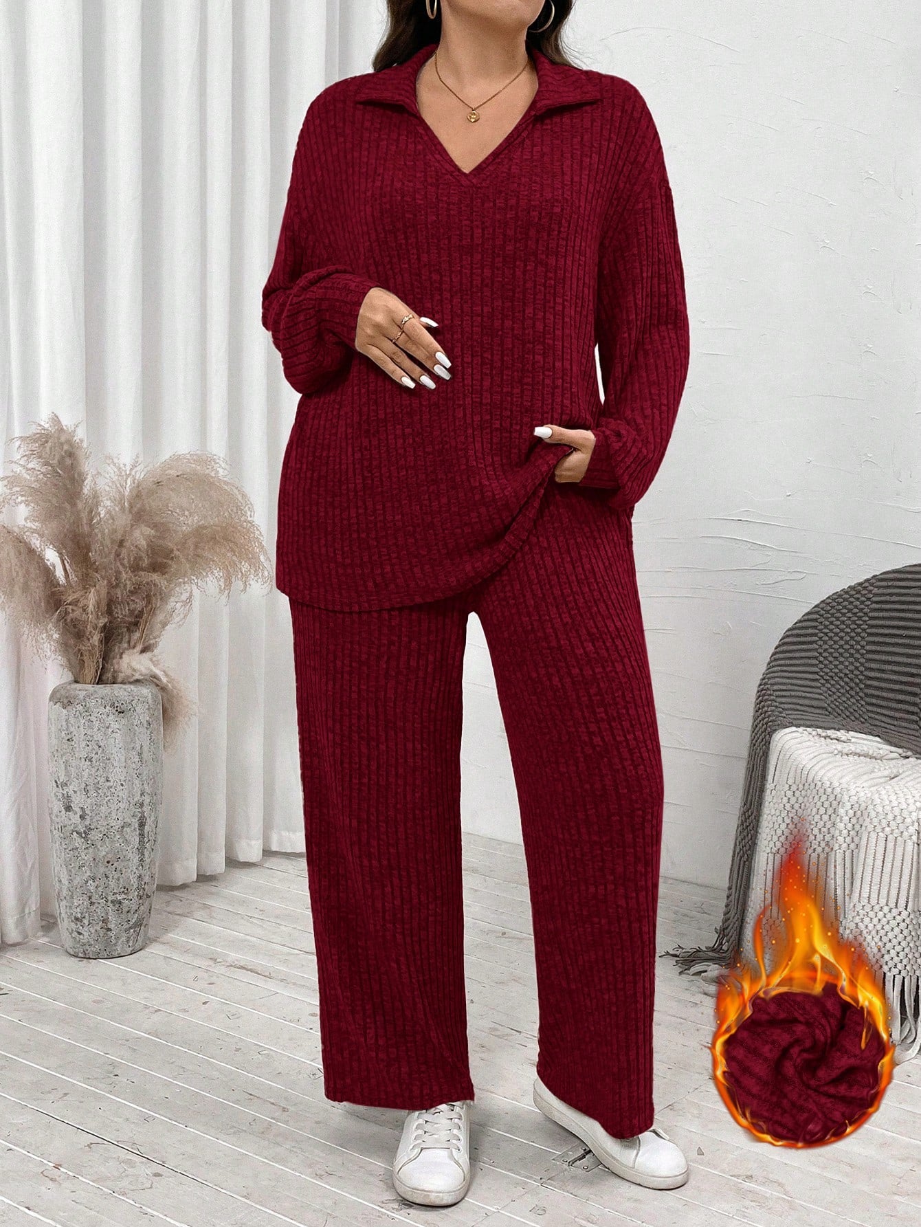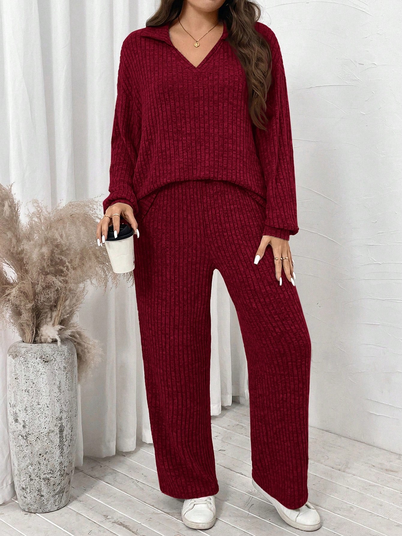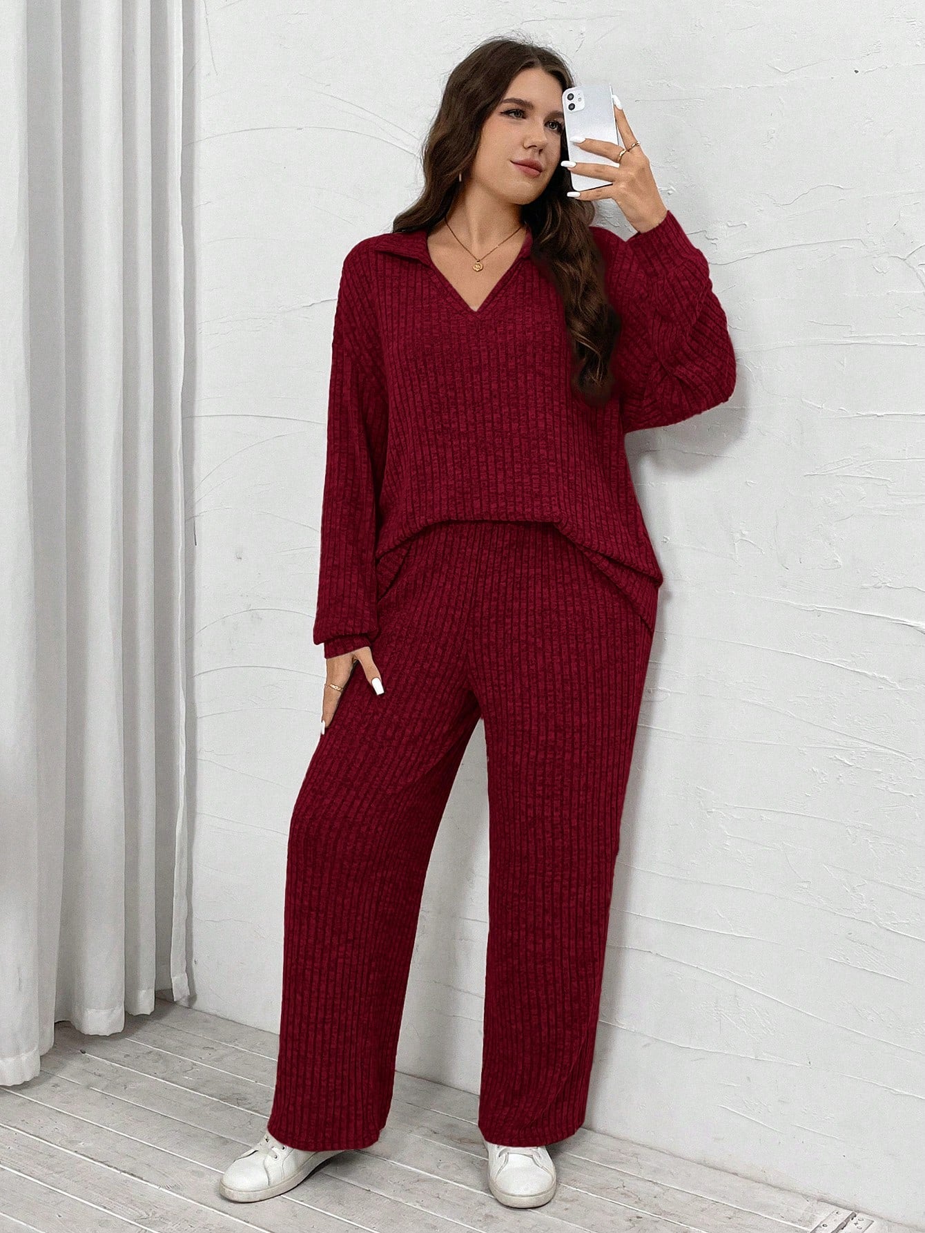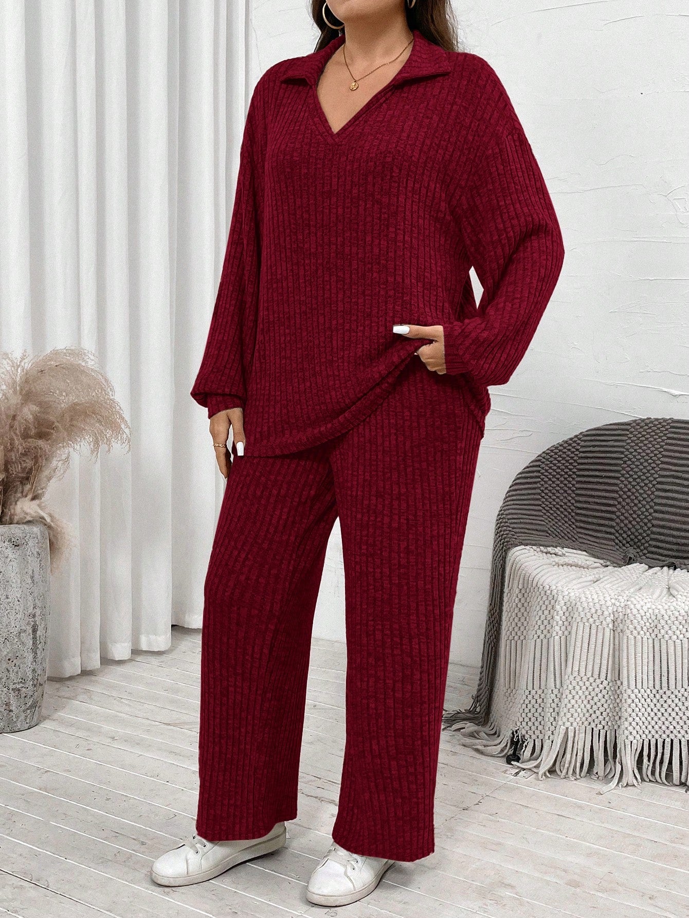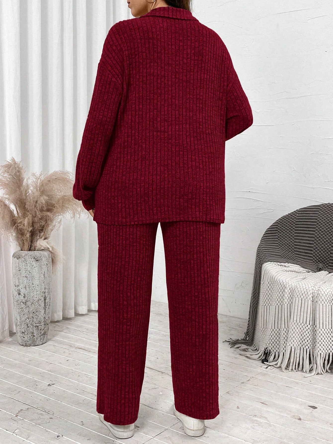 LUNE 2pcs Plus Size Women's Plain Drop Shoulder Long Sleeve Ribbed T-Shirt And Pants Casual Set, Spring