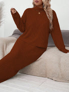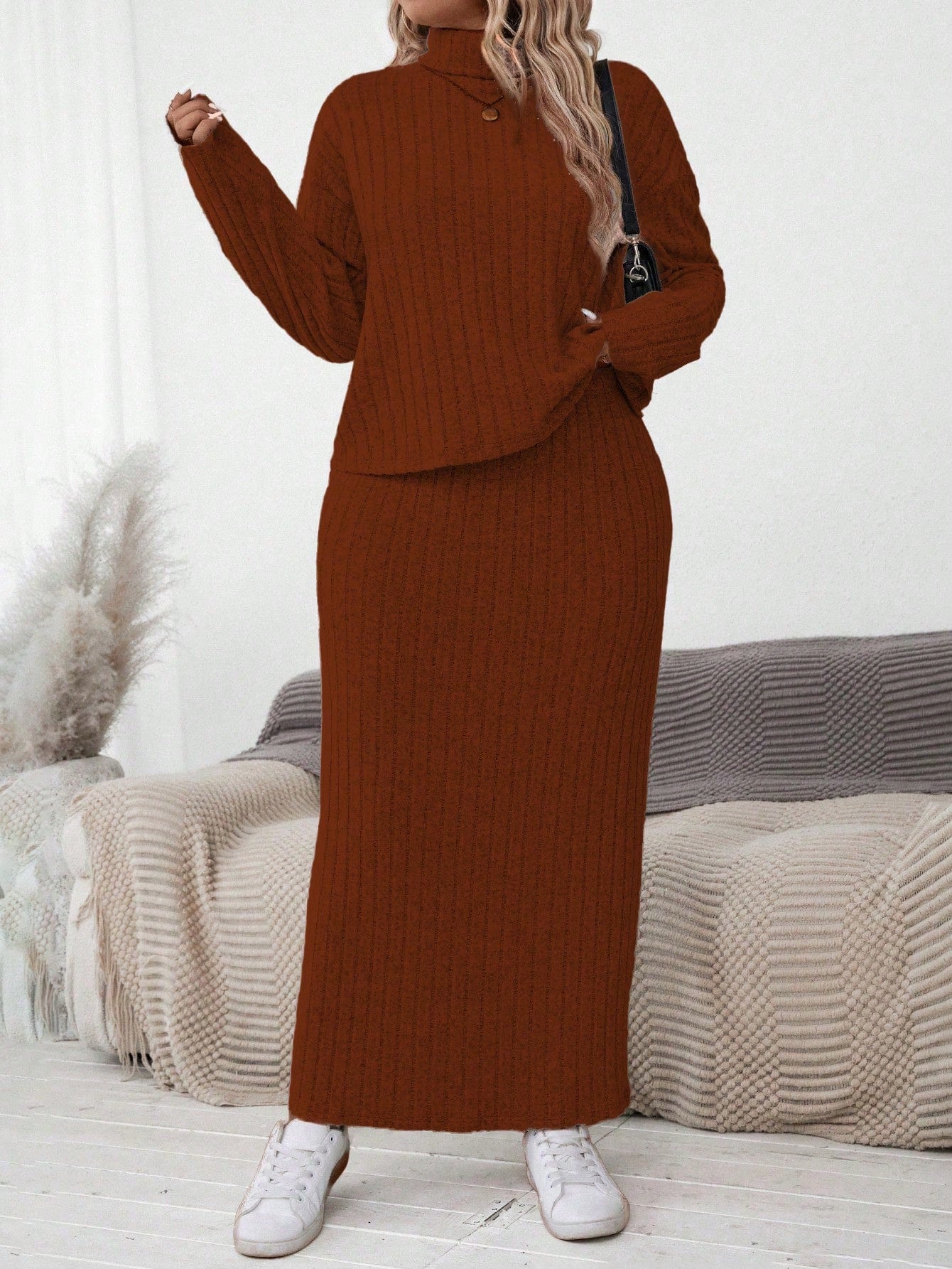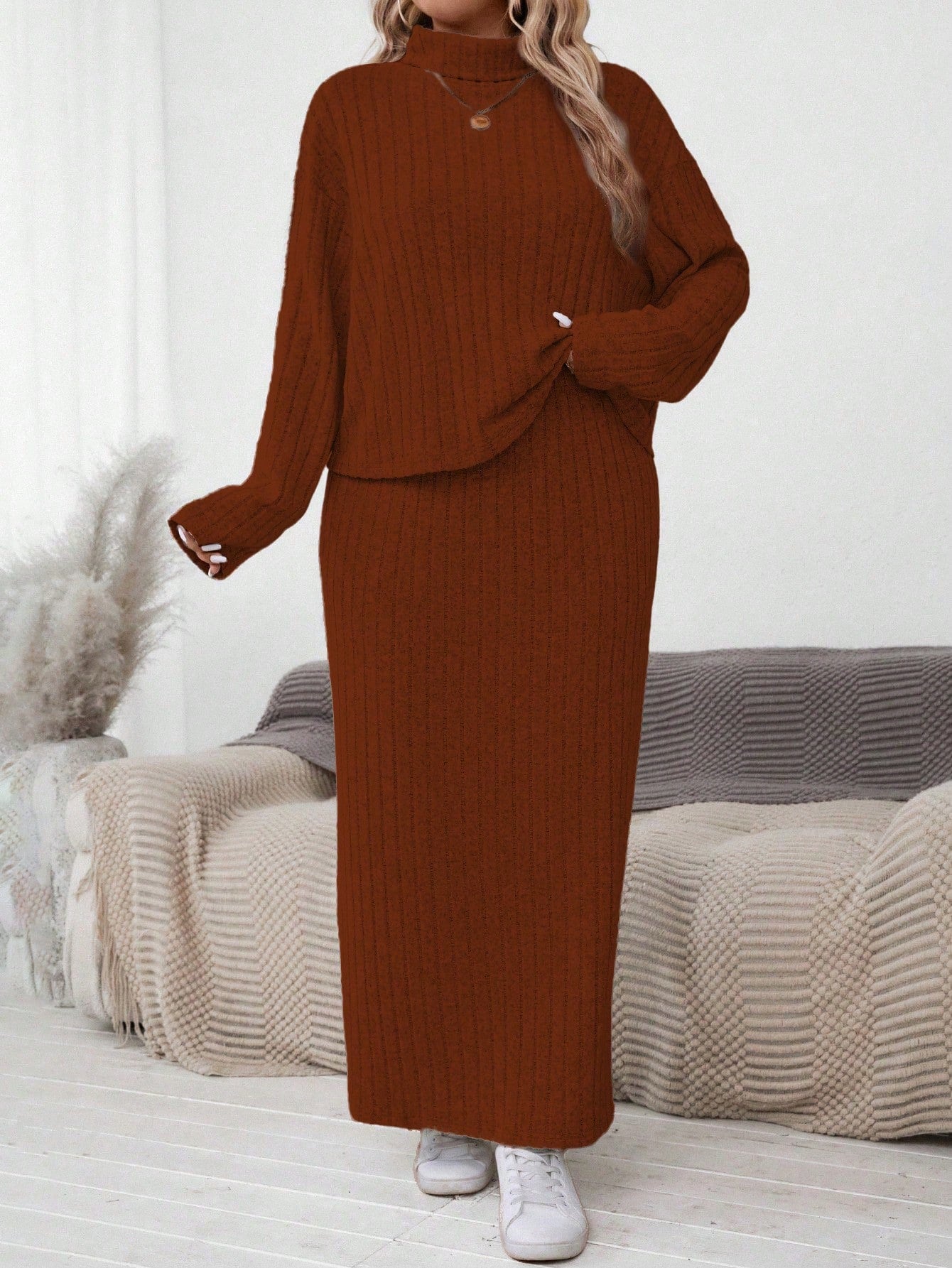 LUNE Plus Size Women High Neck Dropped Shoulder Long Sleeve T-Shirt And Maxi Skirt 2 Pieces Set For Autumn