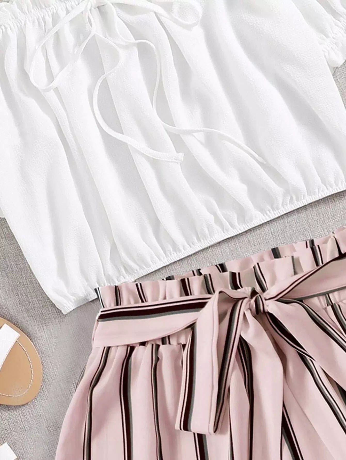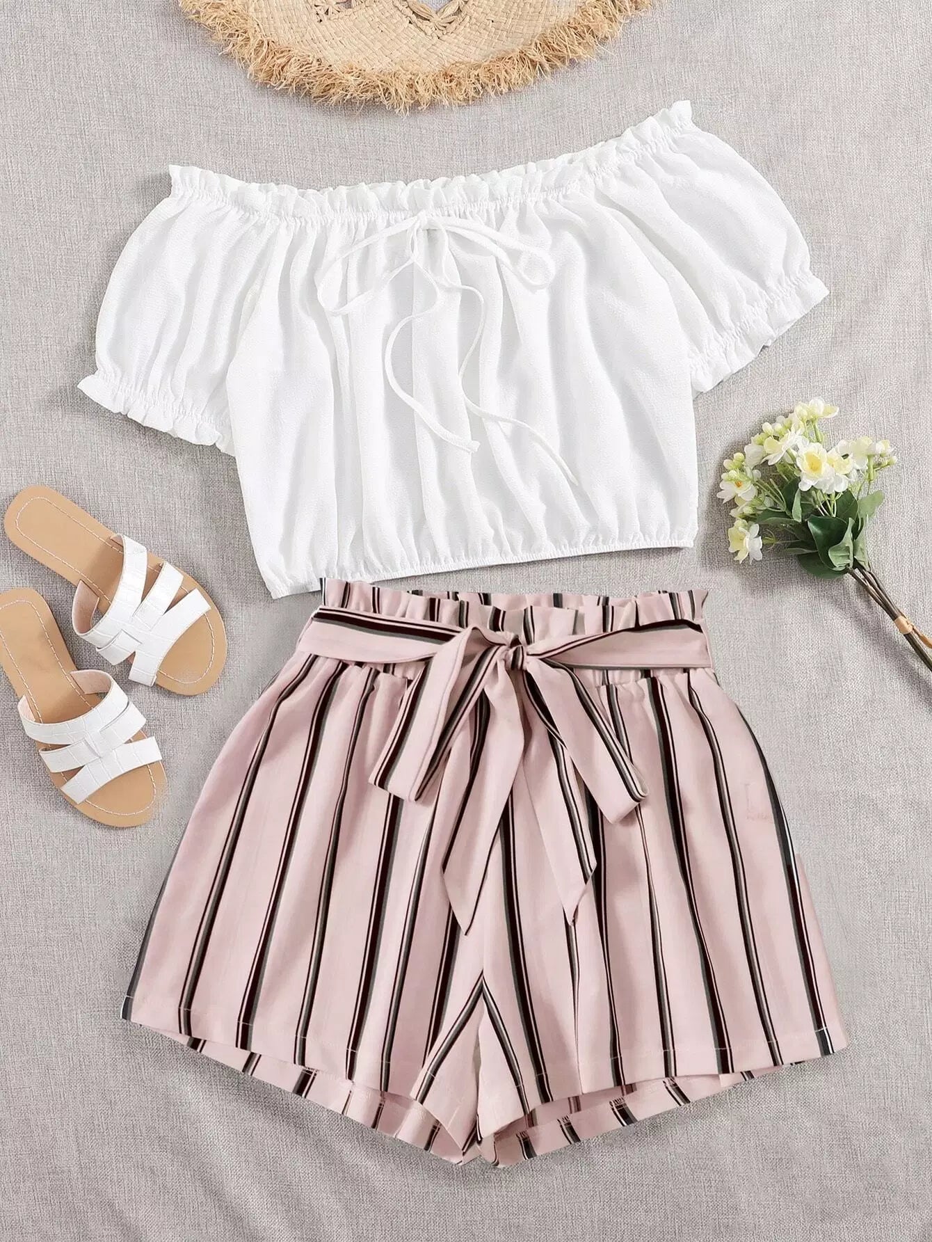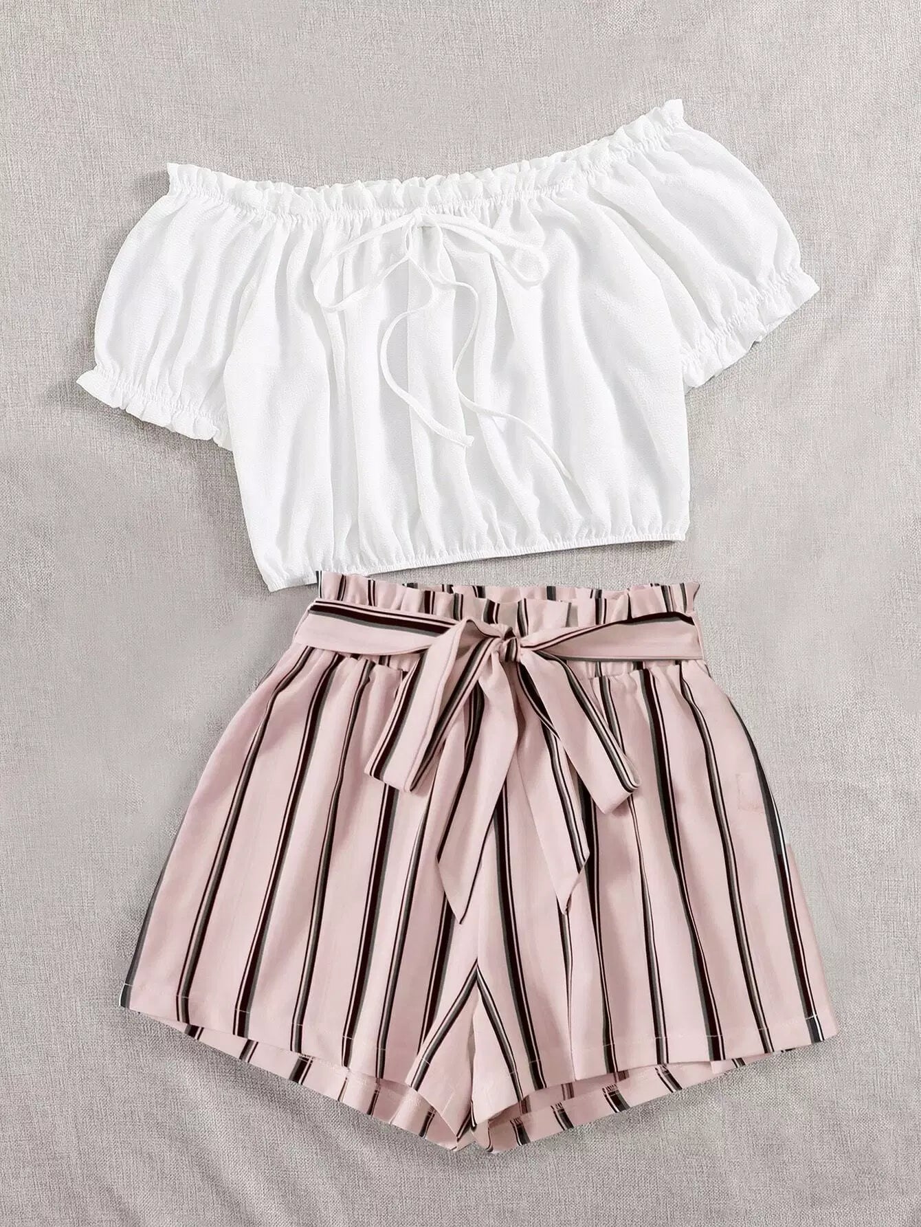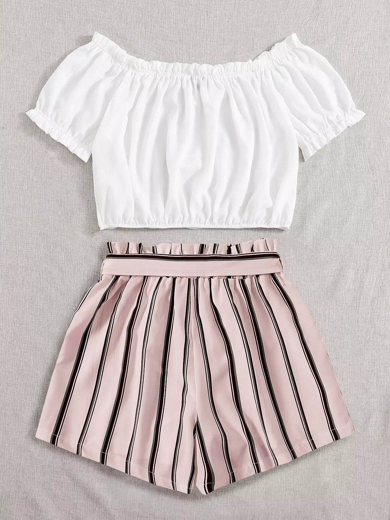 Plus Bardot Frill Trim Crop Top & Striped Shorts Without Belt