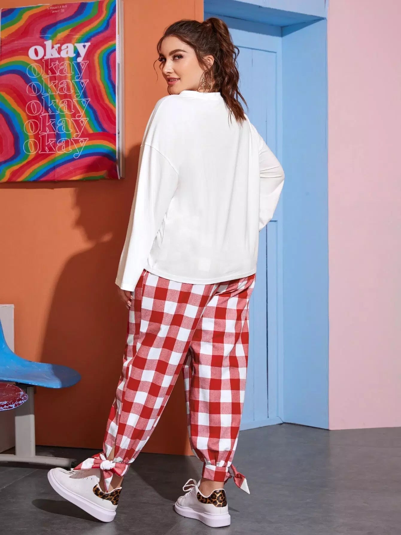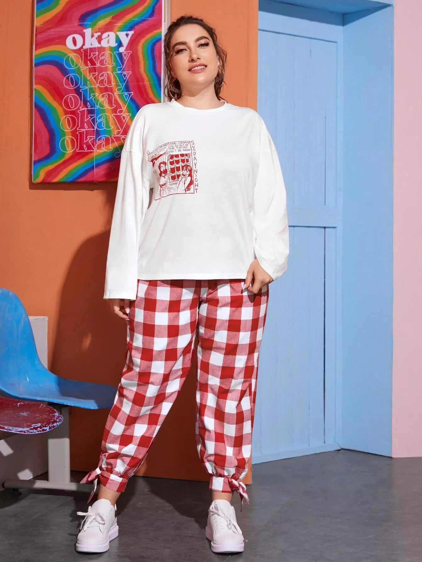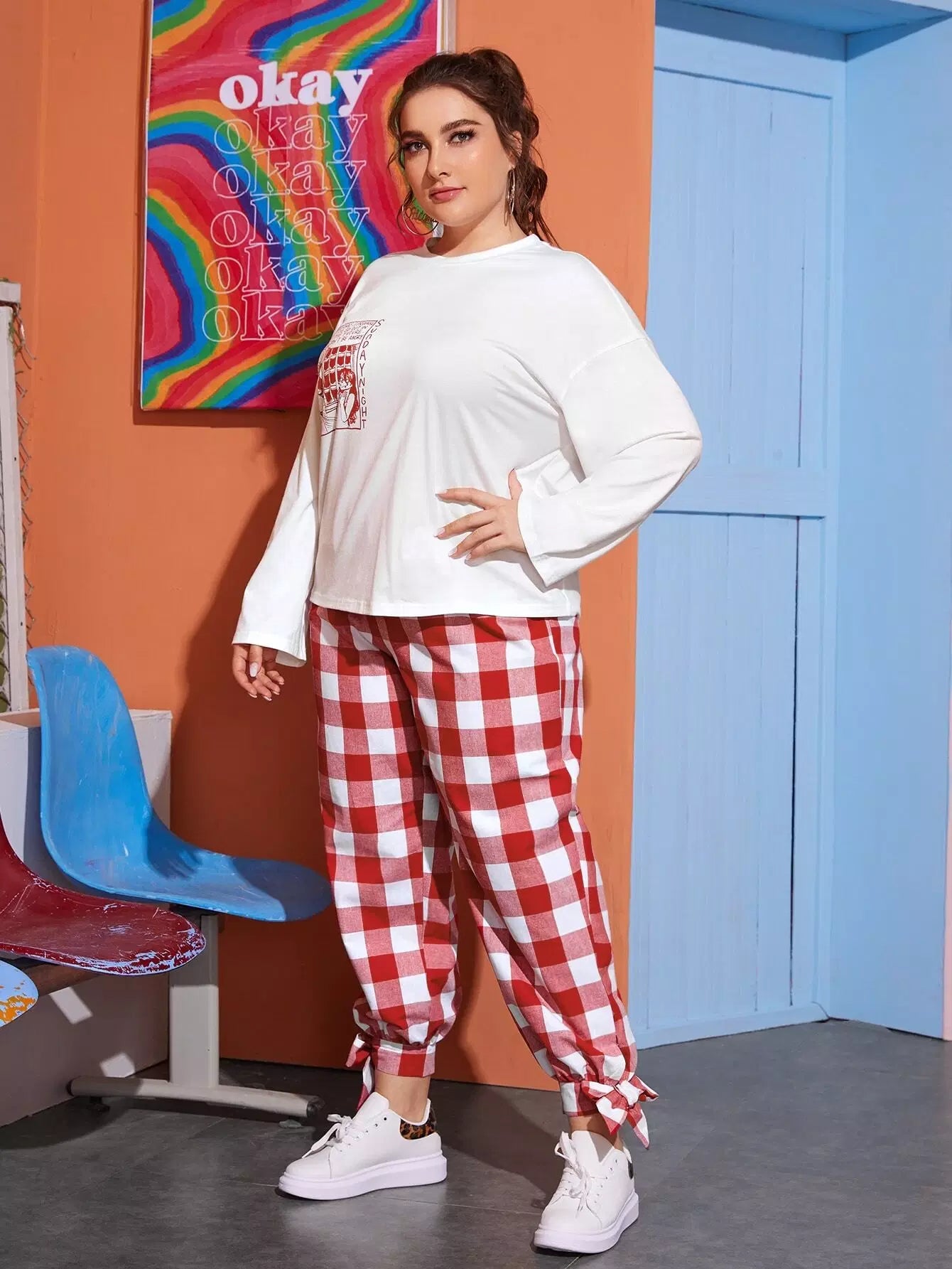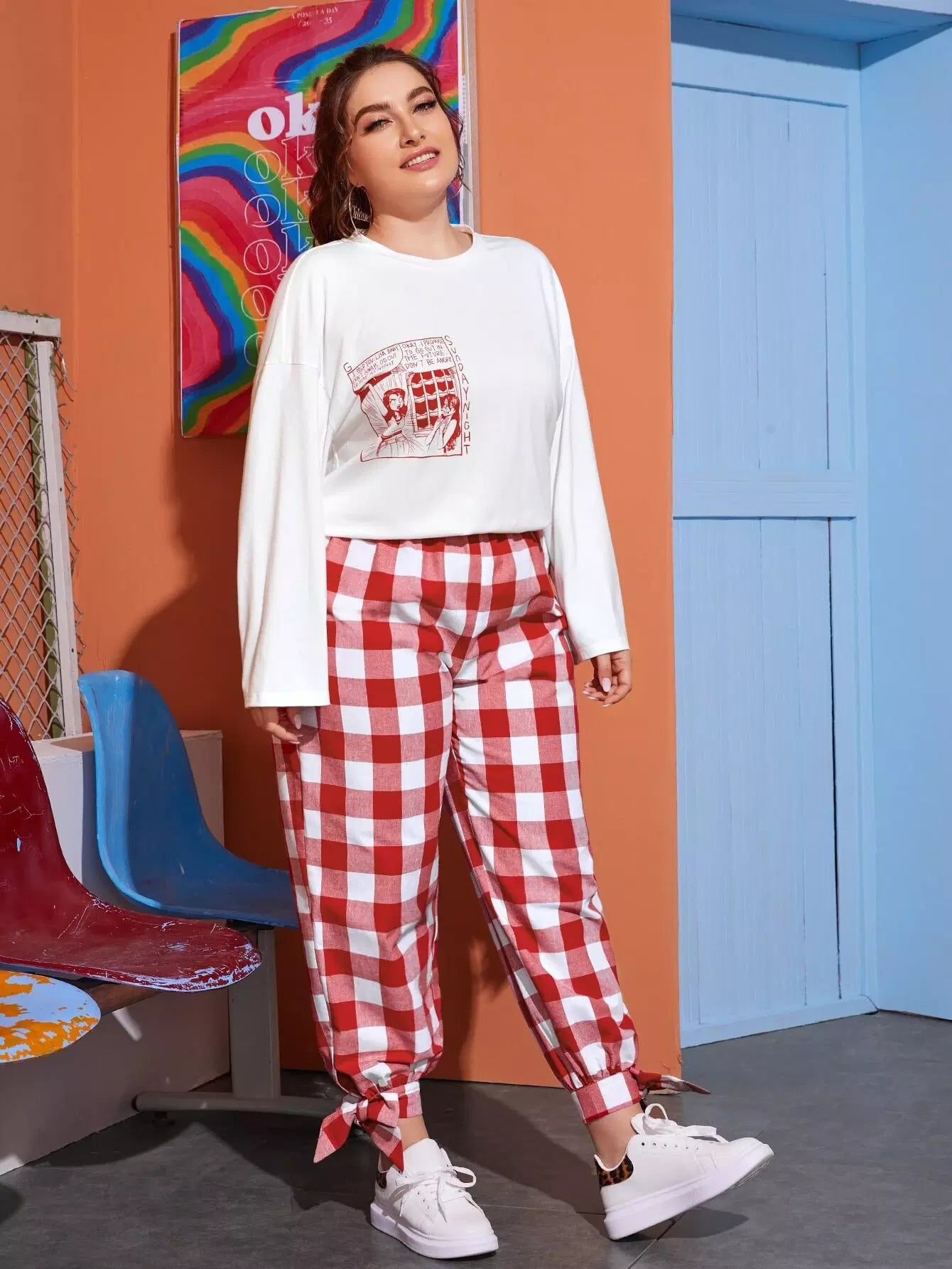 Plus Figure Graphic Top & Knot Hem Buffalo Plaid Pants Set