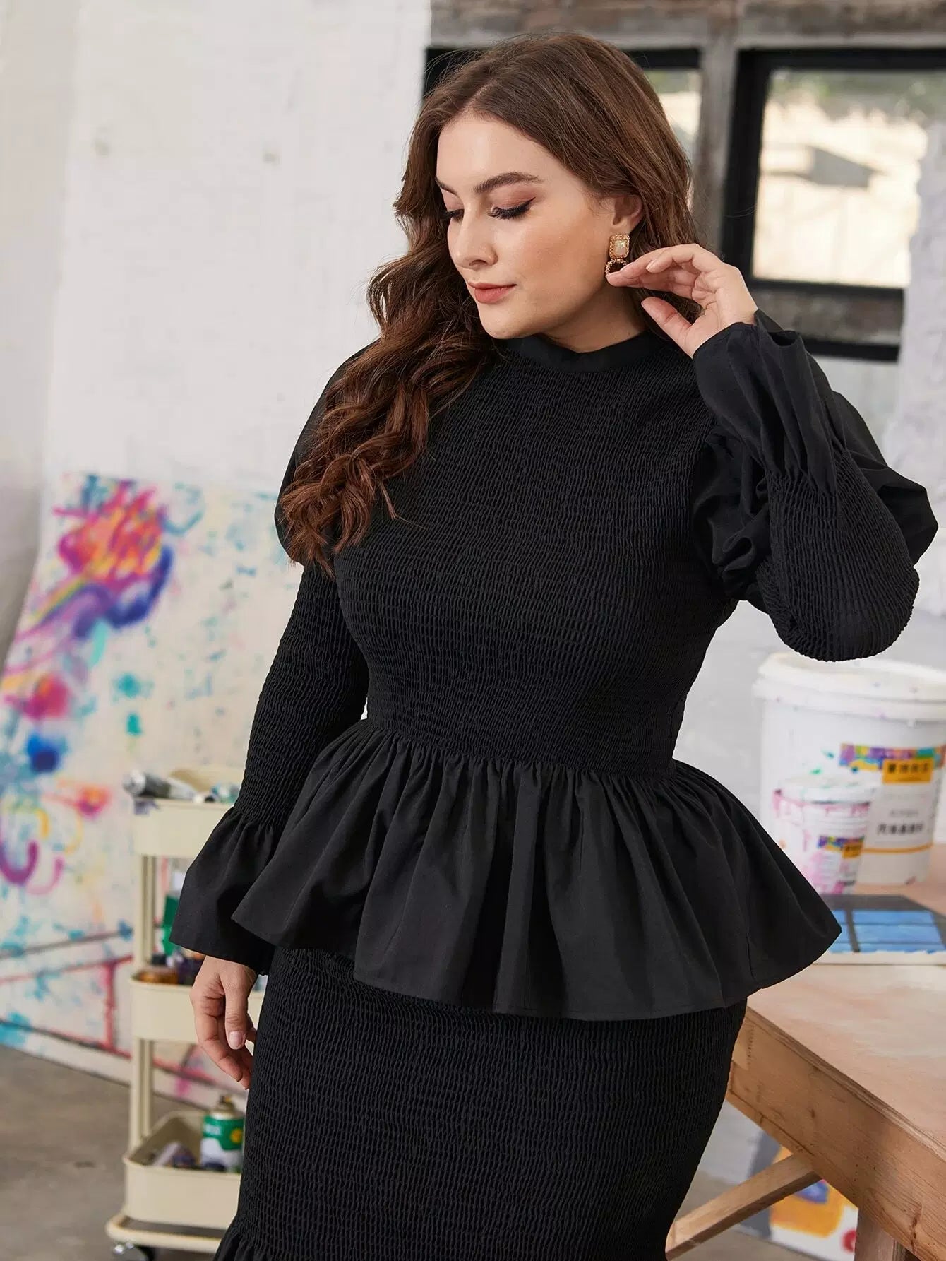 Plus Gigot Sleeve Shirred Peplum Top & Fishtail Hem Skirt Set