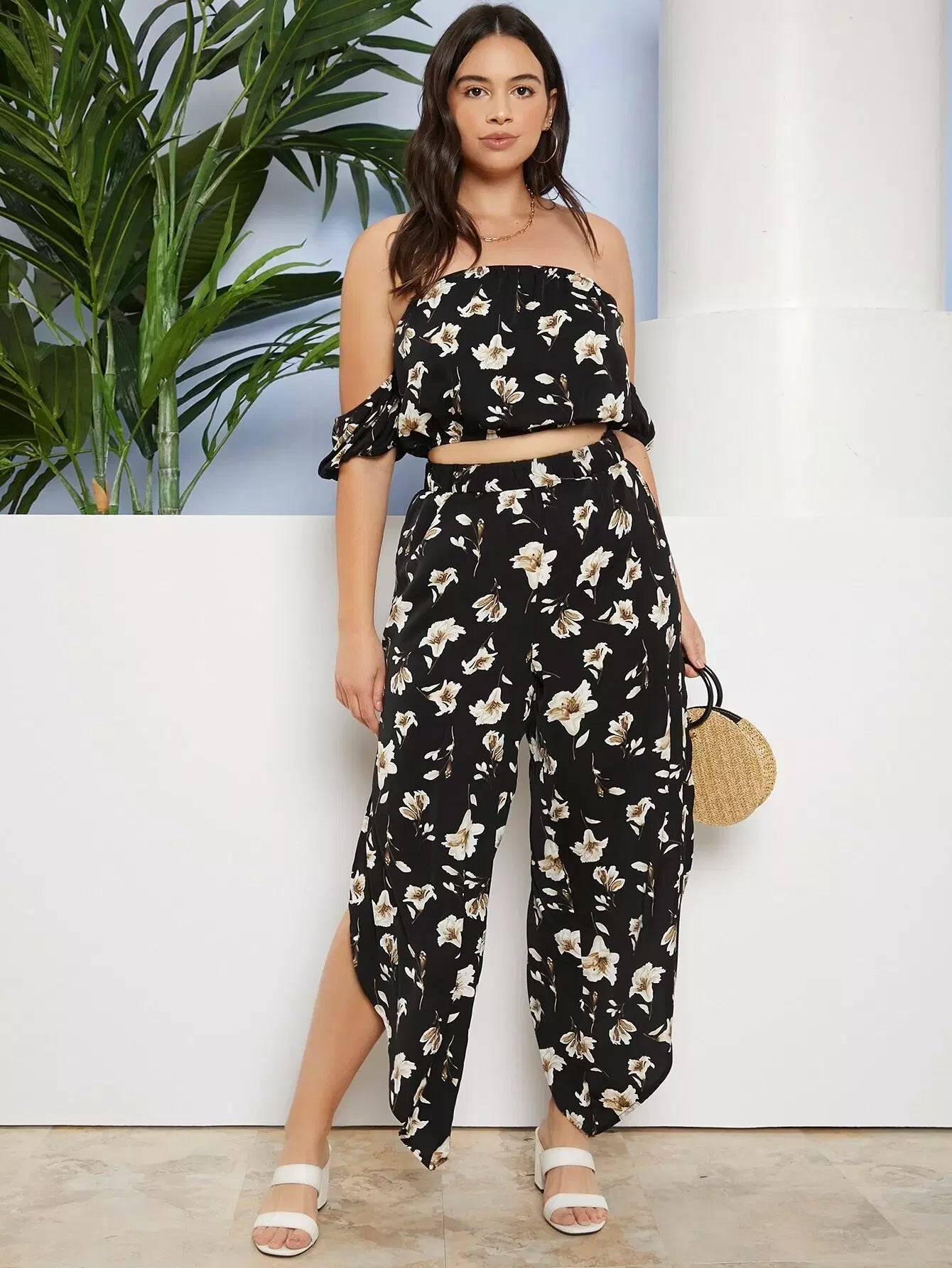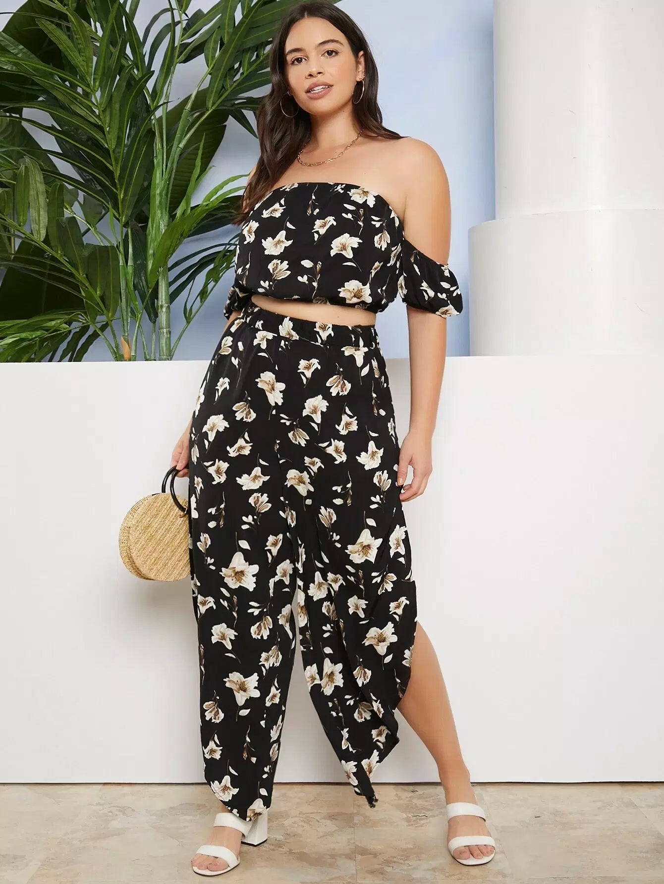 Plus Off Shoulder Floral Top And Pants Set