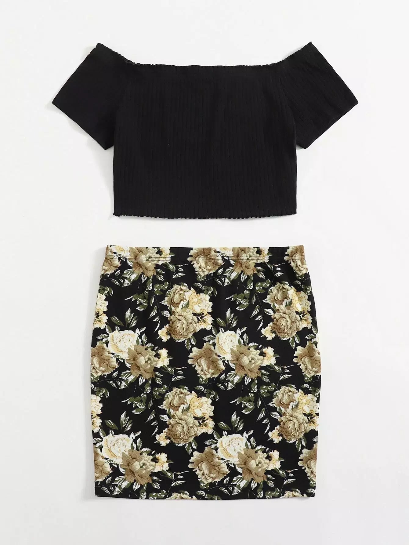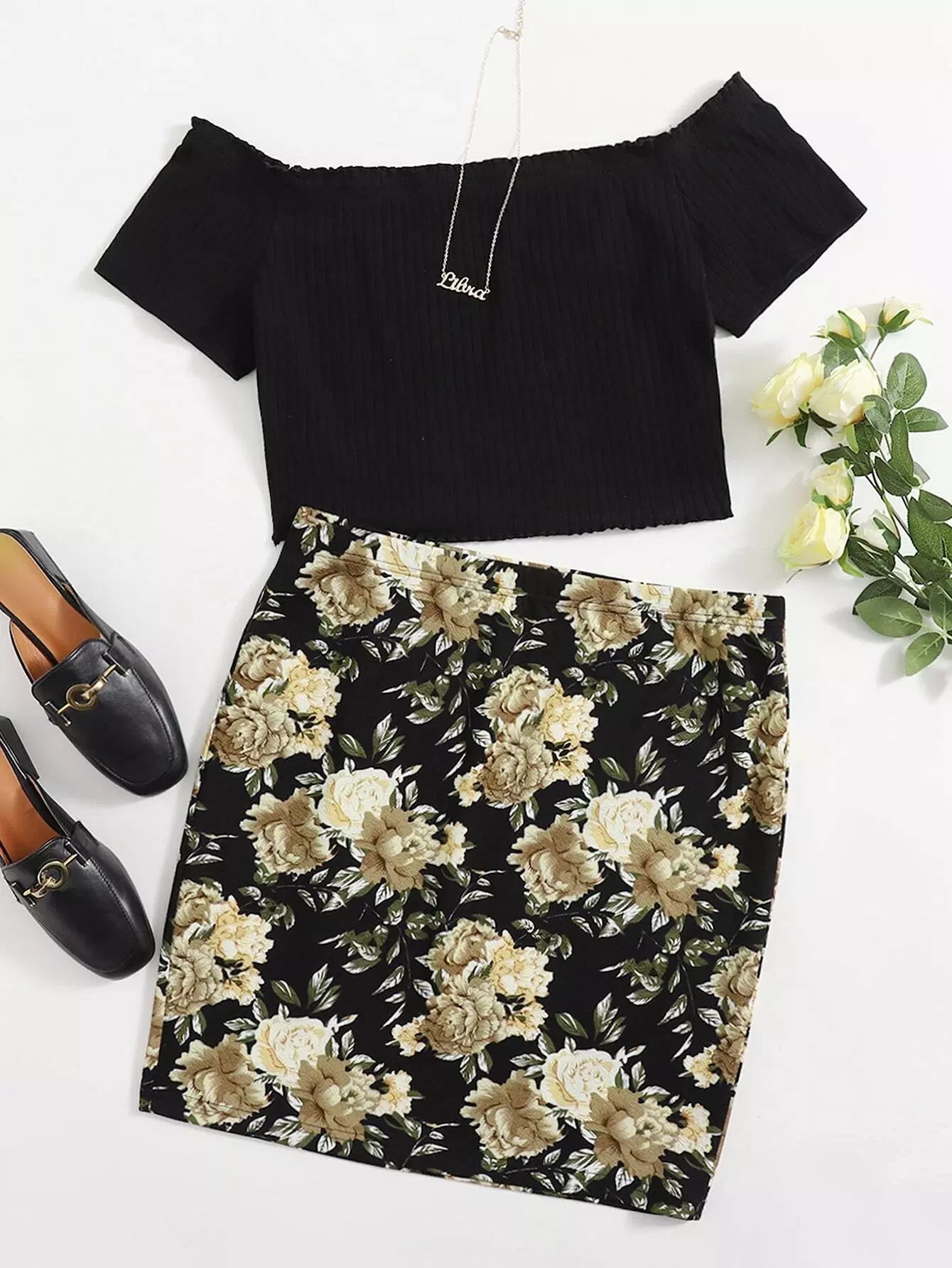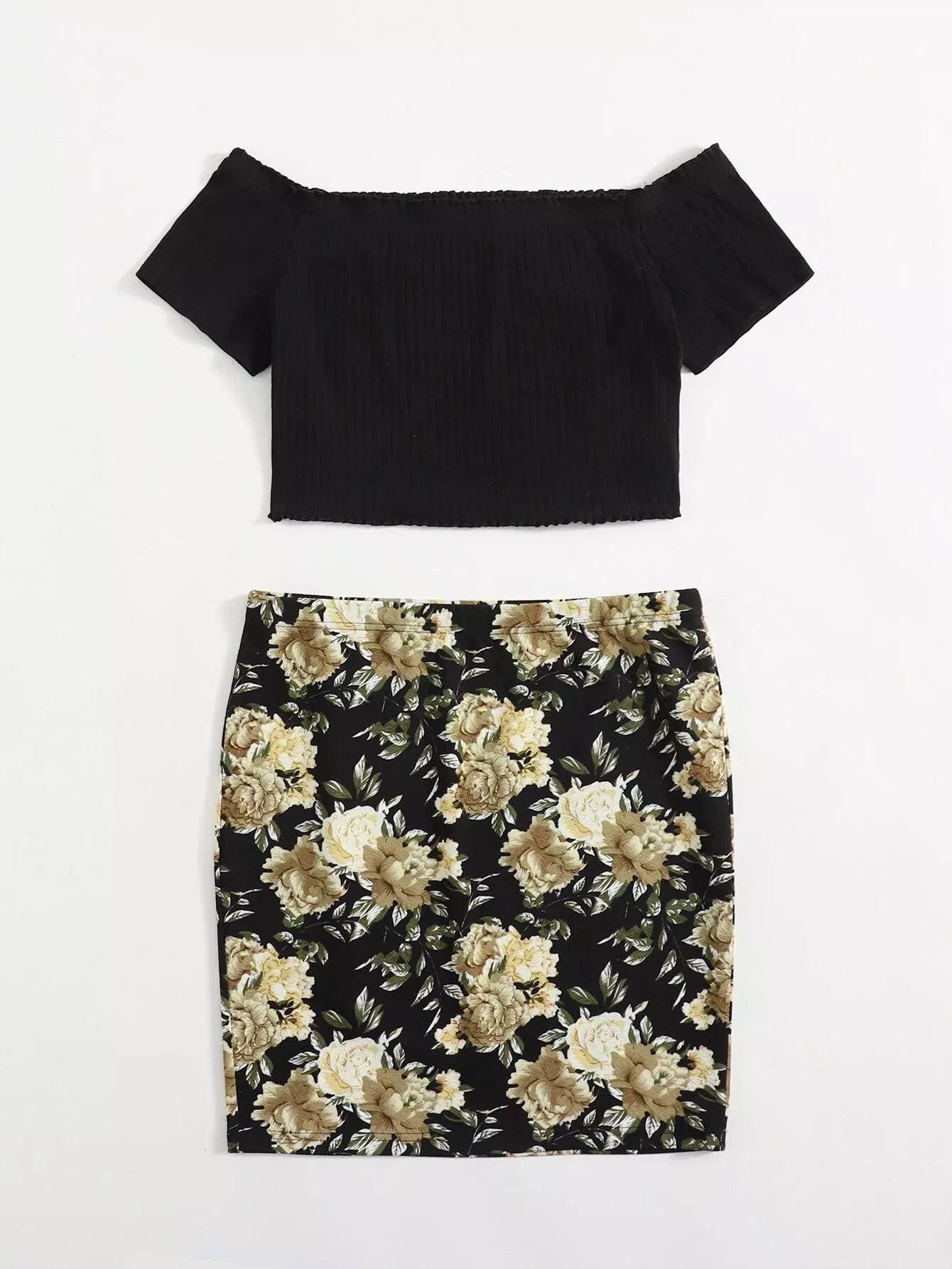Women - Plus Off Shoulder Tee & Floral Skirt Set