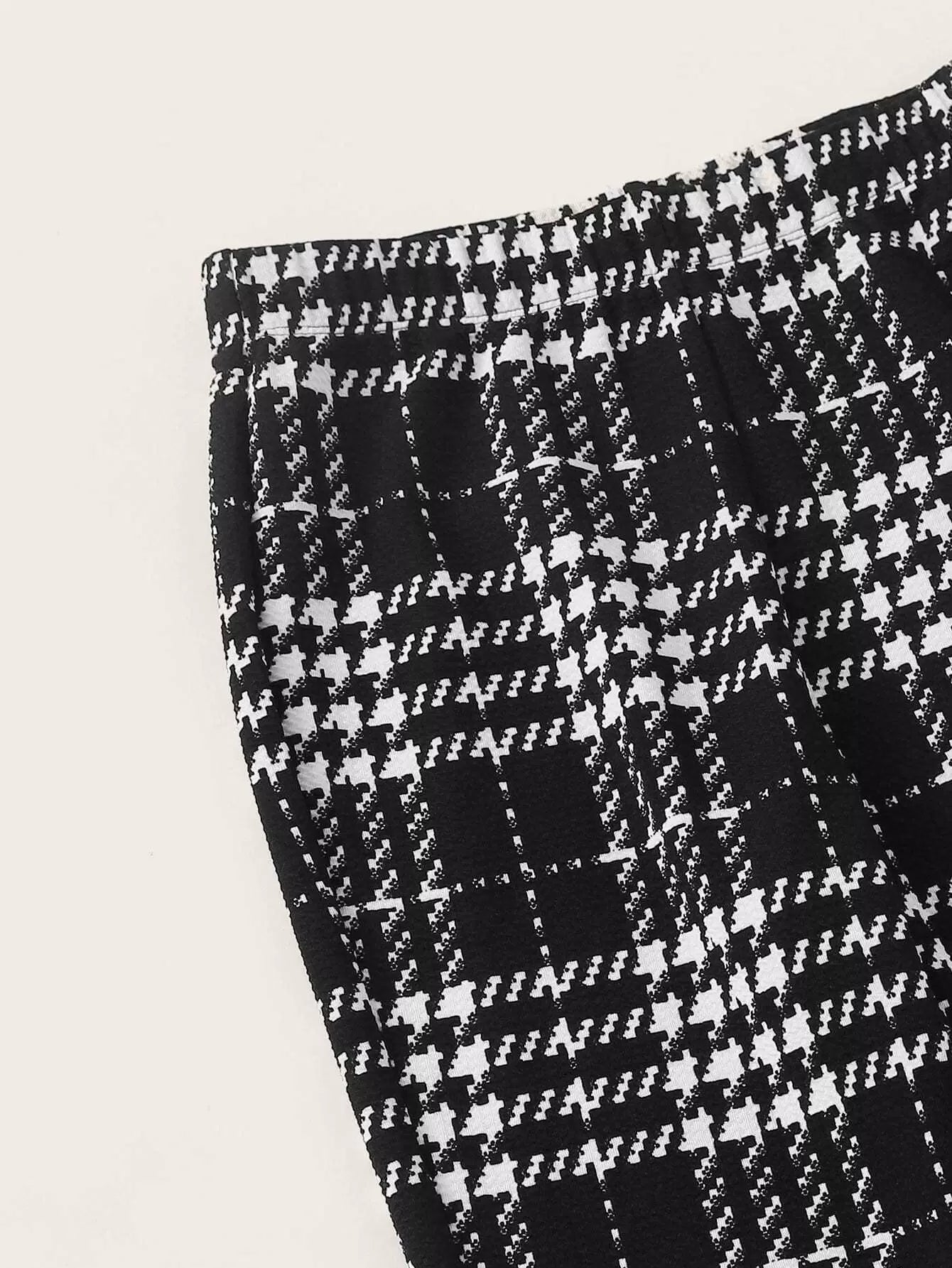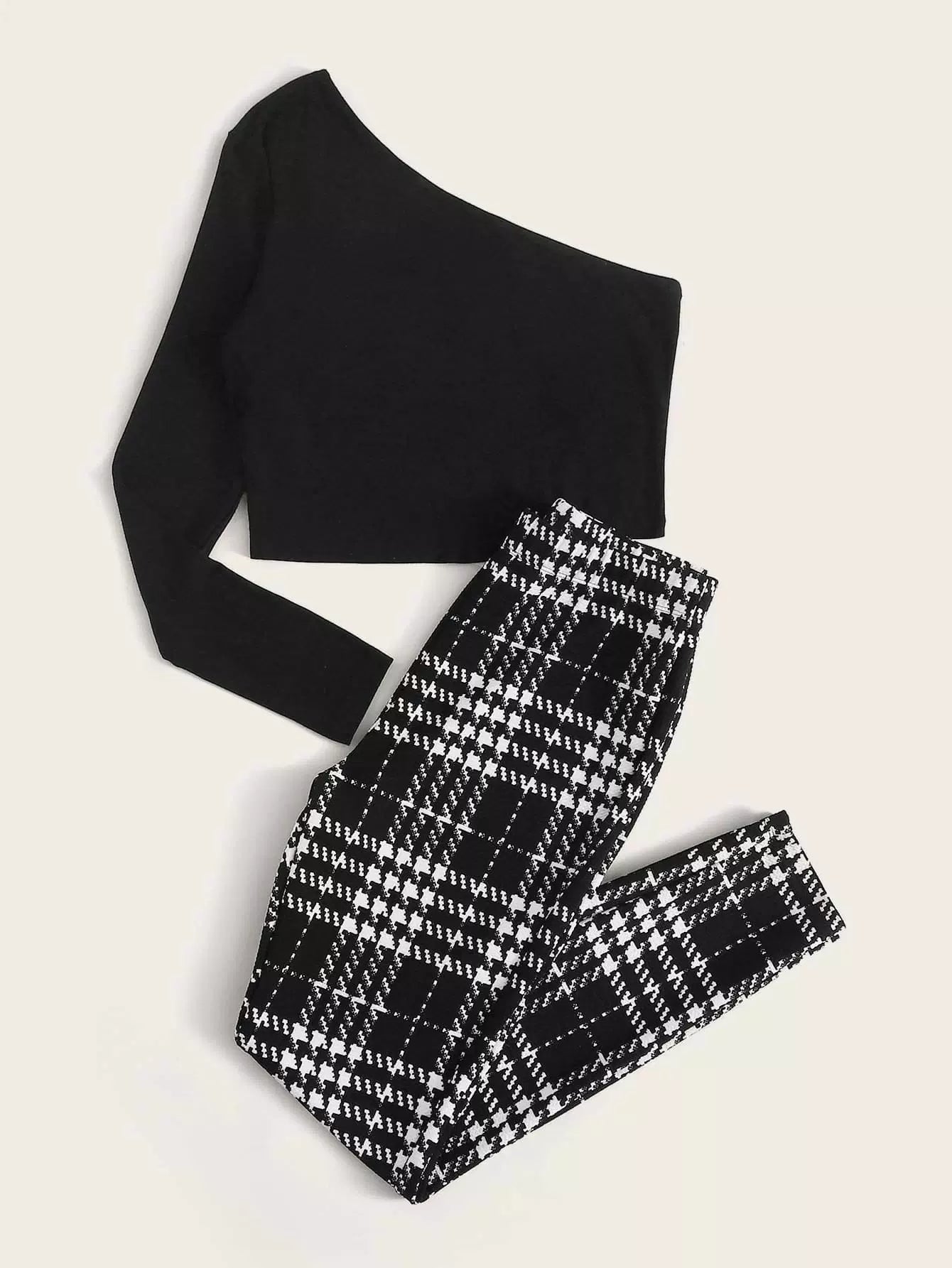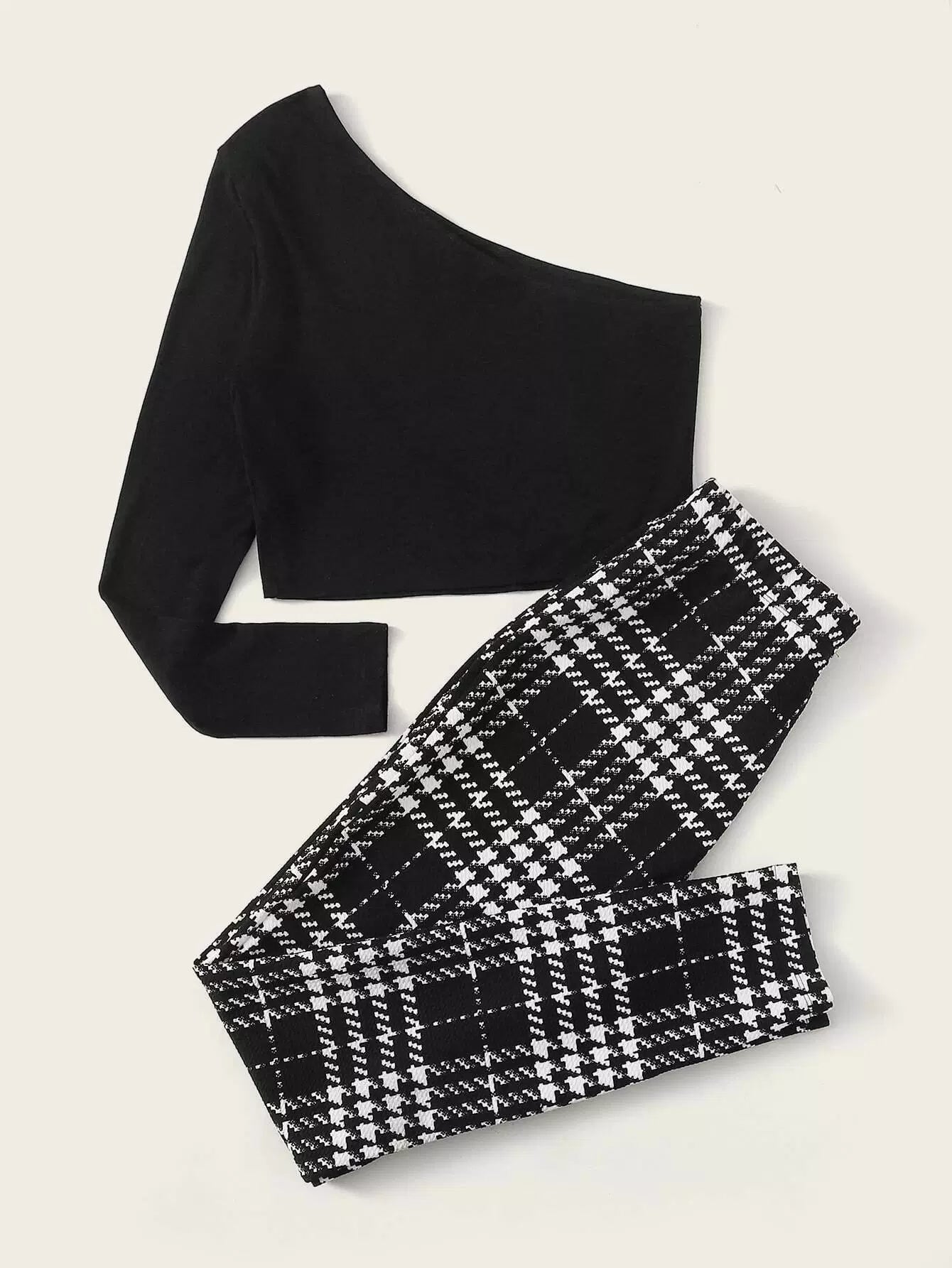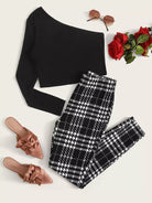 Plus One Shoulder Solid Top & Plaid Pants Set