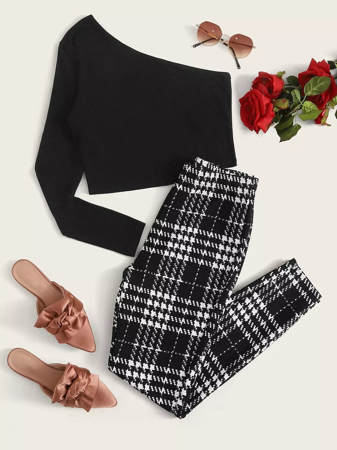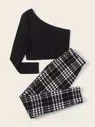 Women - Plus One Shoulder Solid Top & Plaid Pants Set