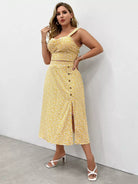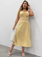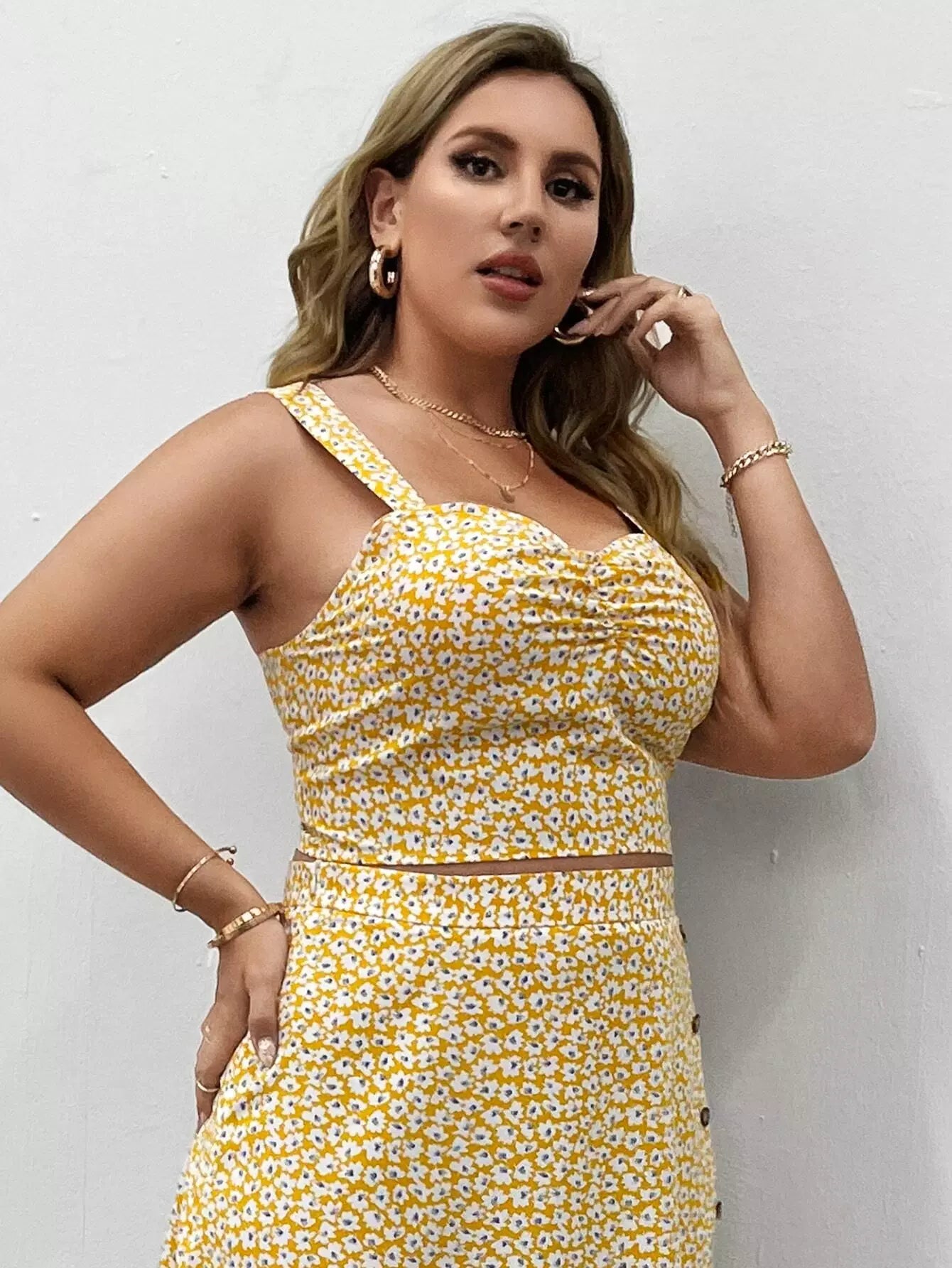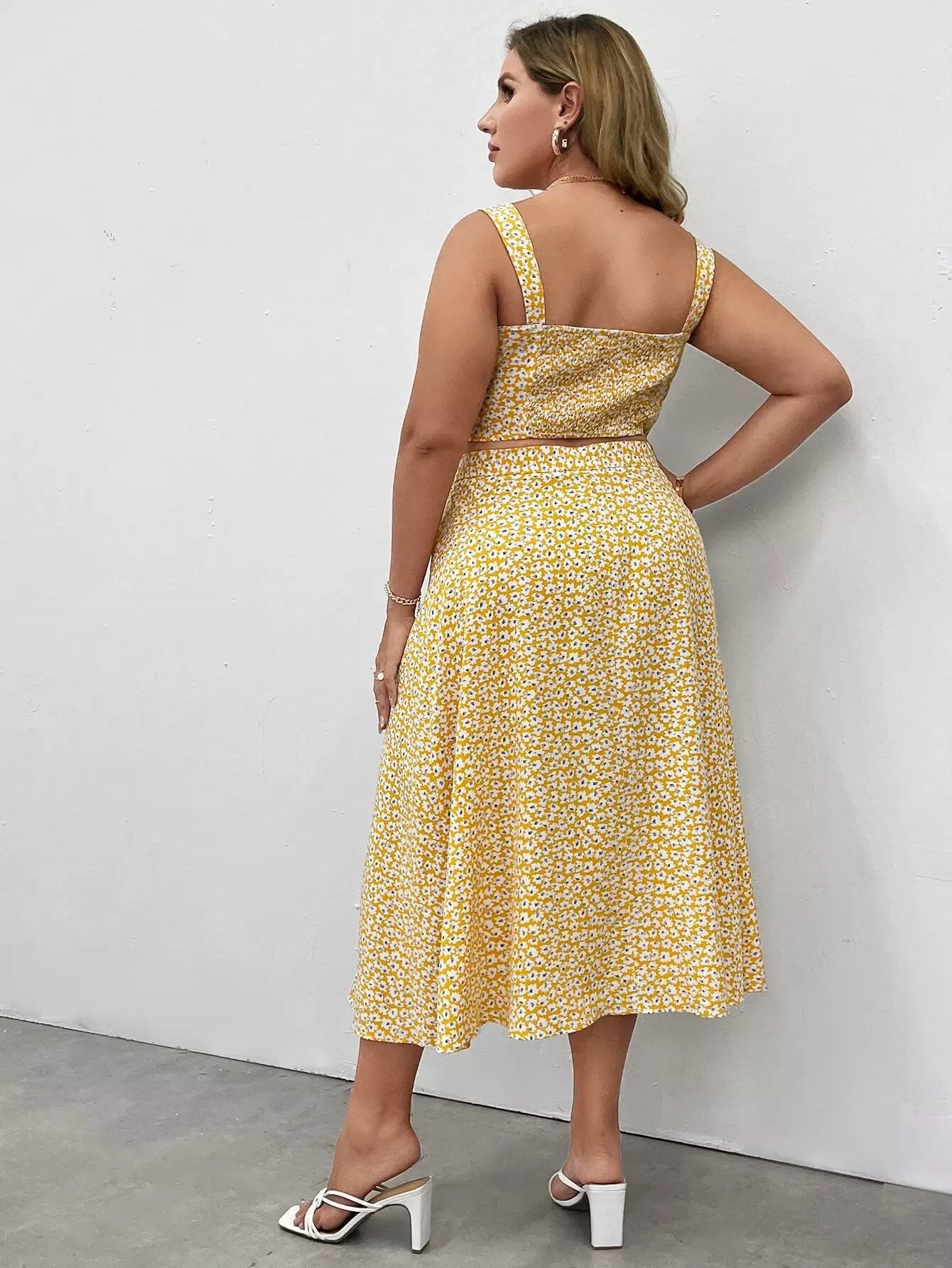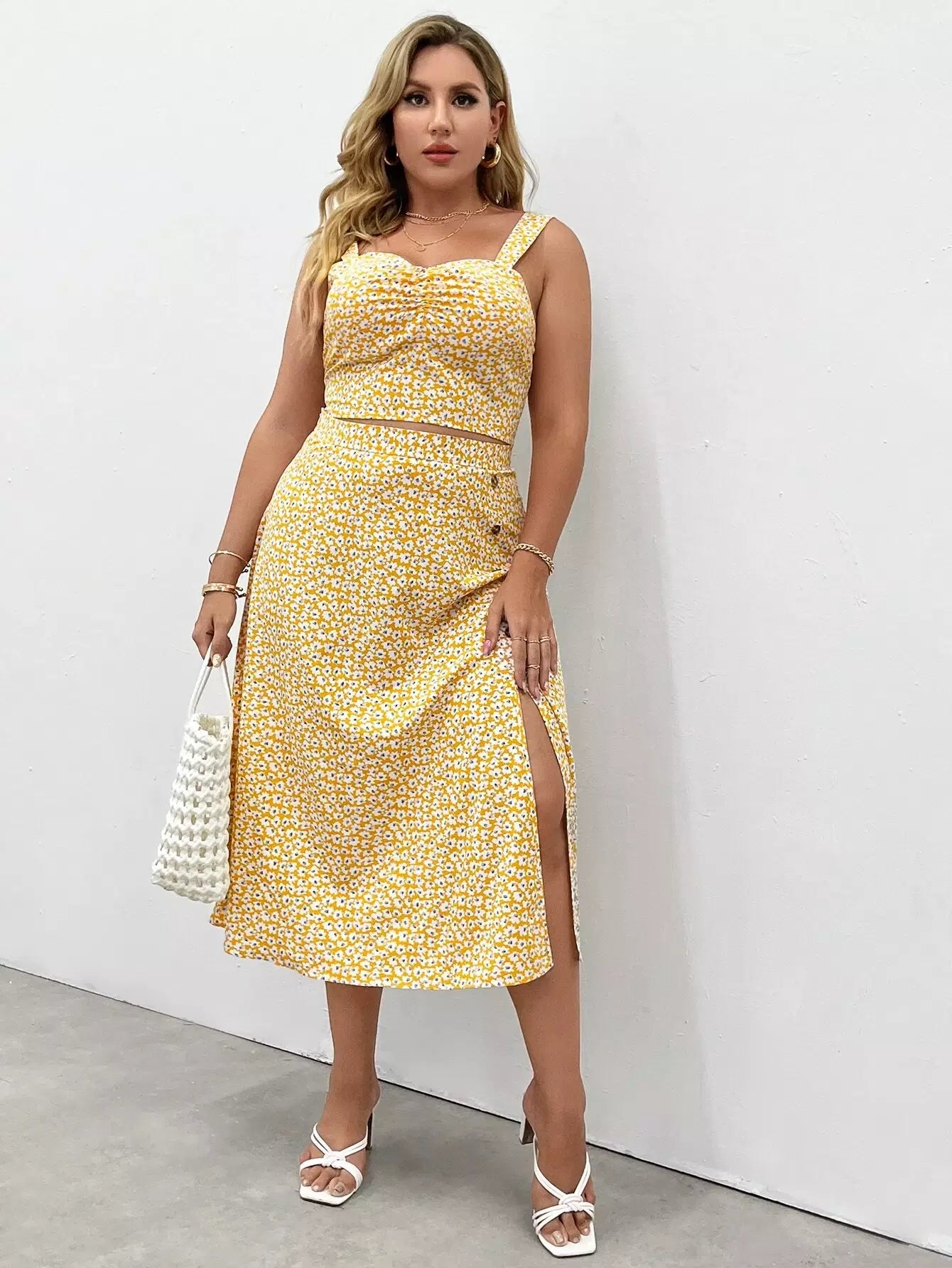 Plus Ruched Front Shirred Back Ditsy Floral Cami Top & Split Skirt Set