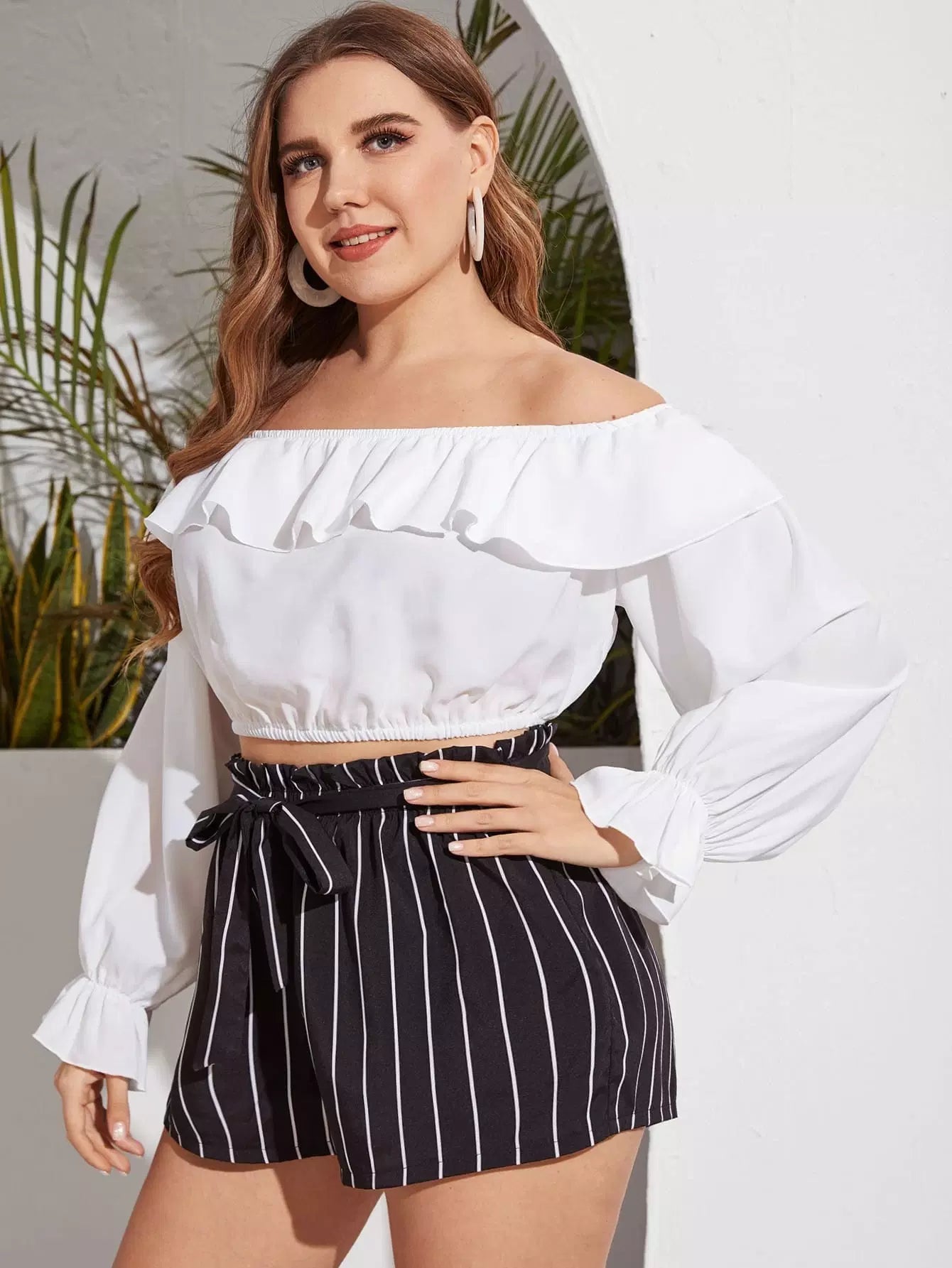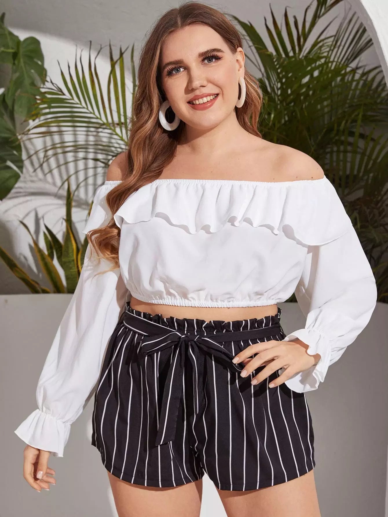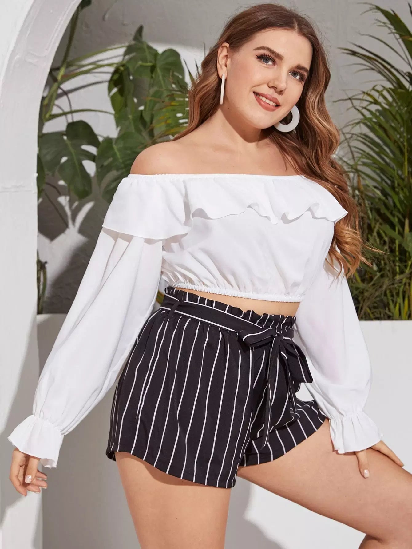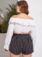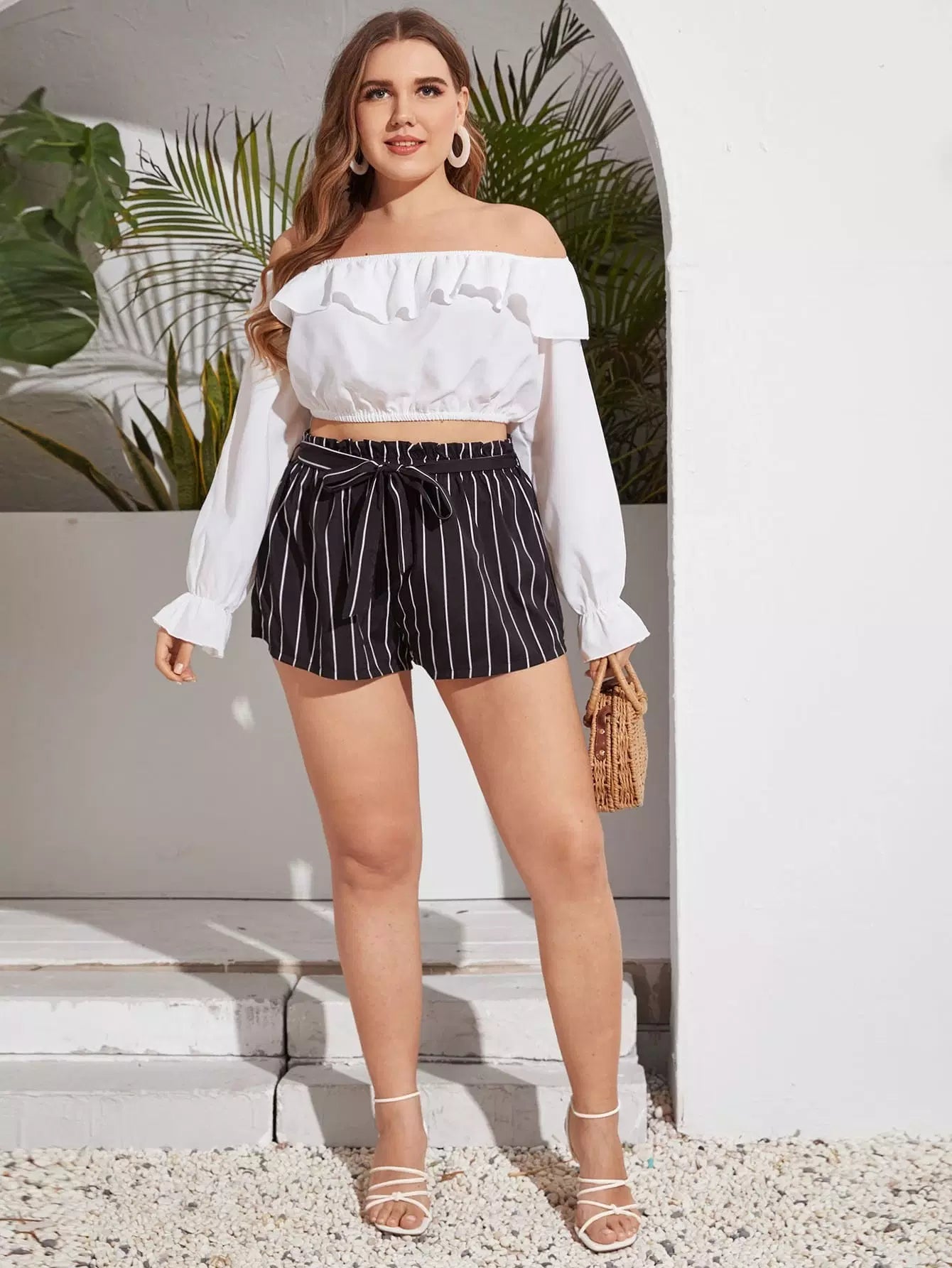Plus Ruffle Crop Bardot Top With Striped Shorts Without Belt