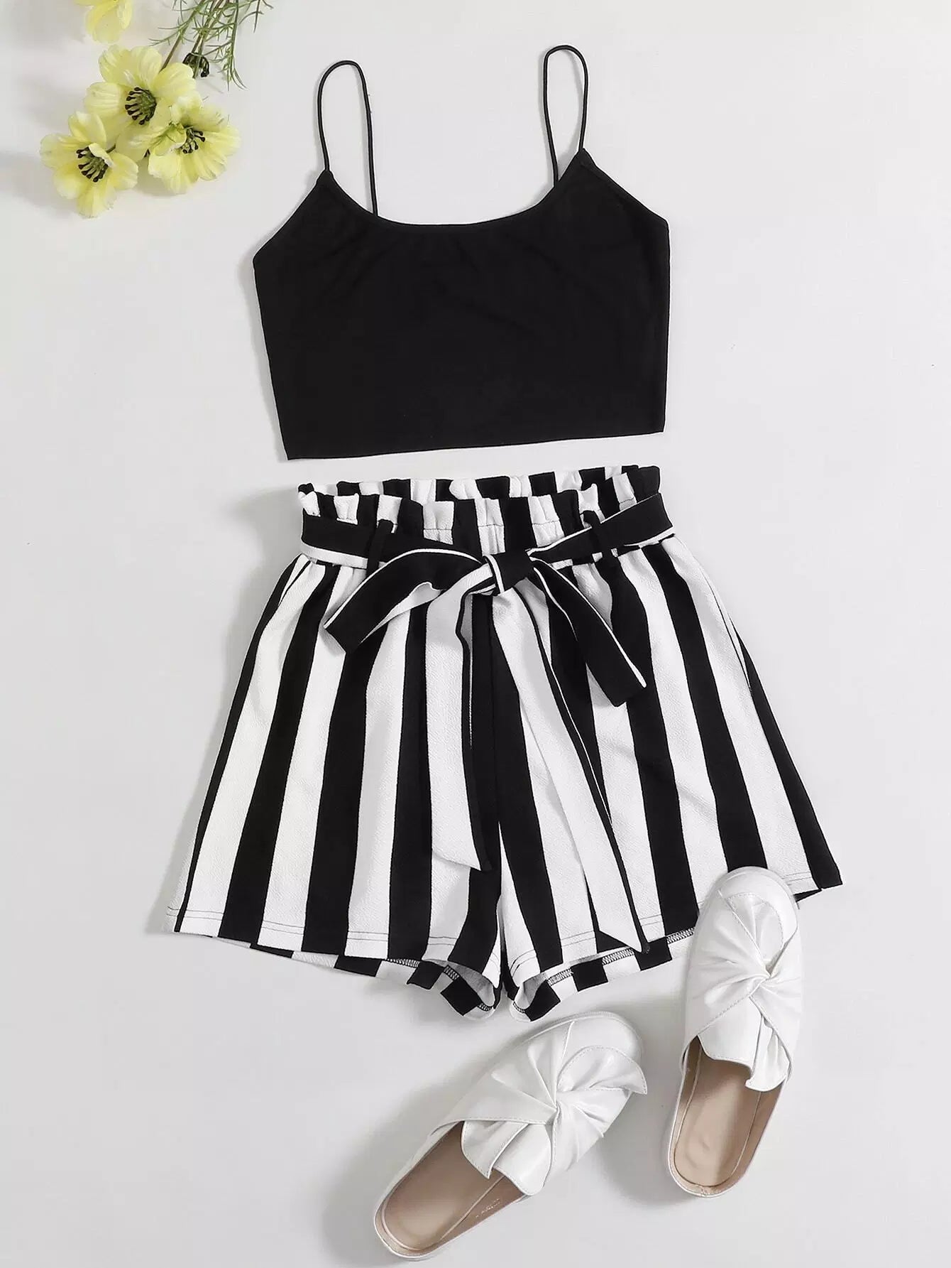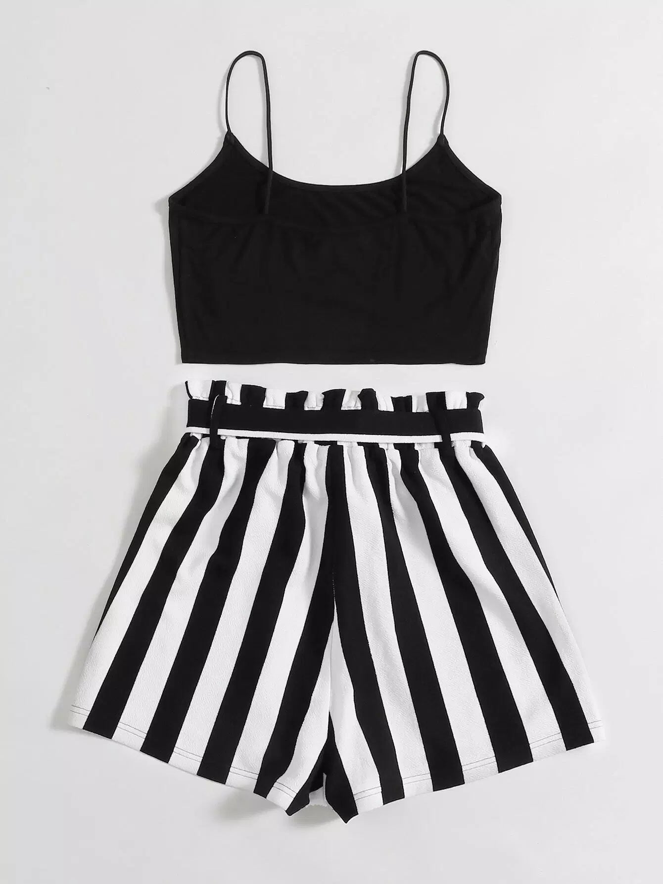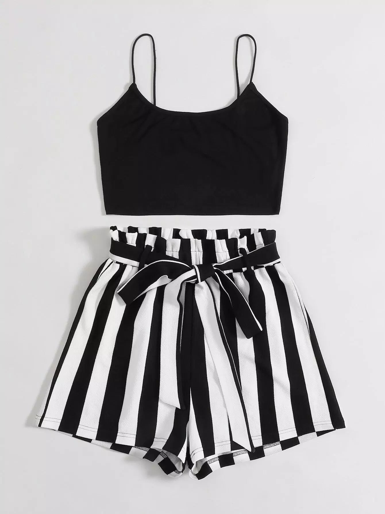 Plus Solid Cami Top & Paperbag Waist Striped Shorts Set