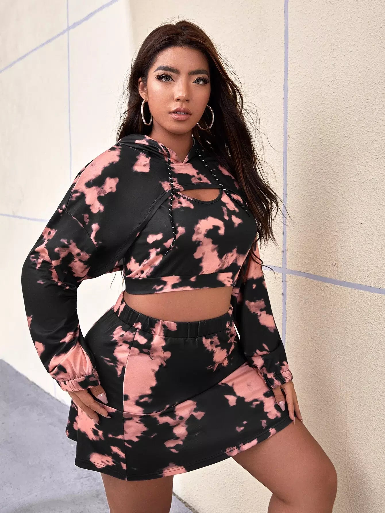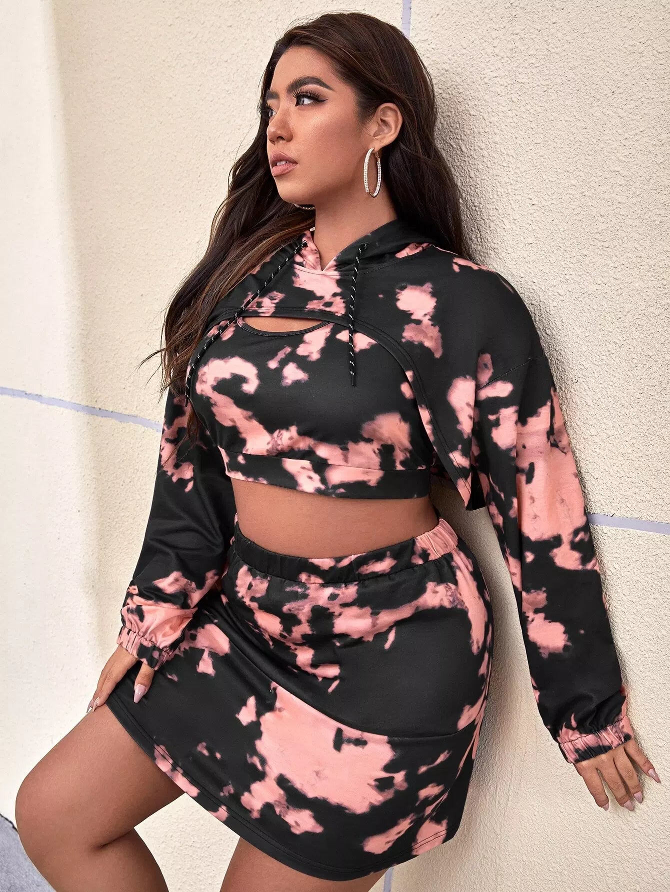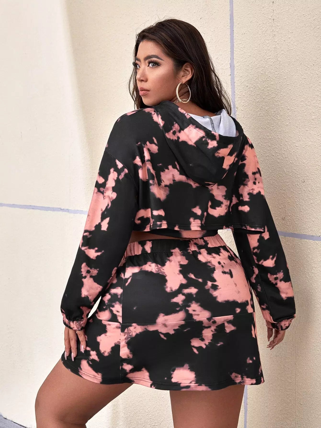Plus Tie Dye Drawstring Super Crop Hoodie & Tank Top & Skirt