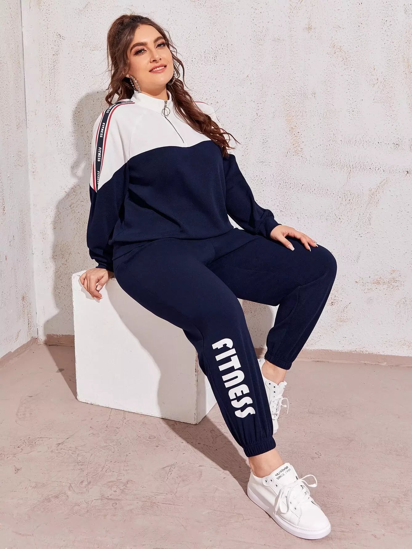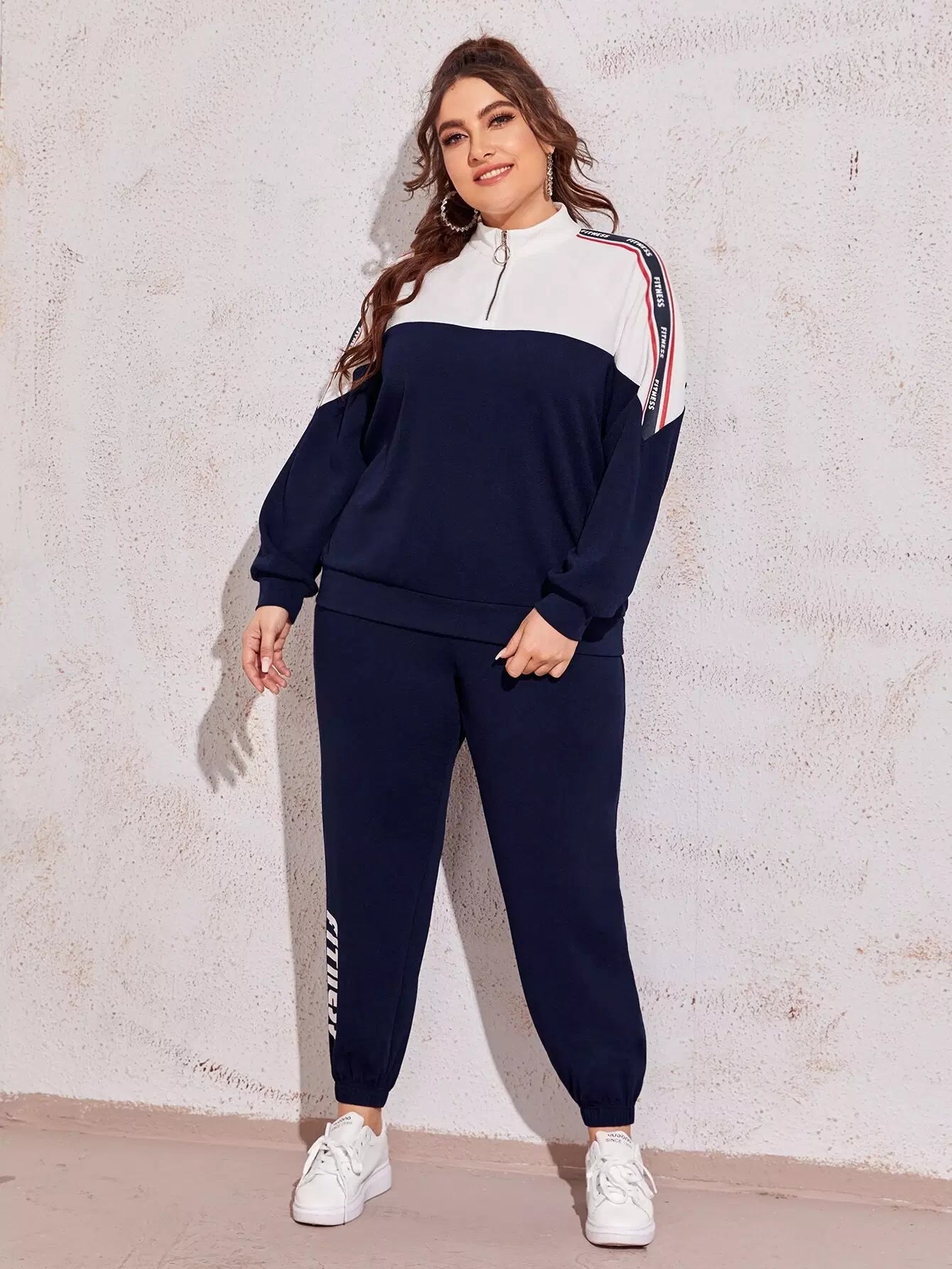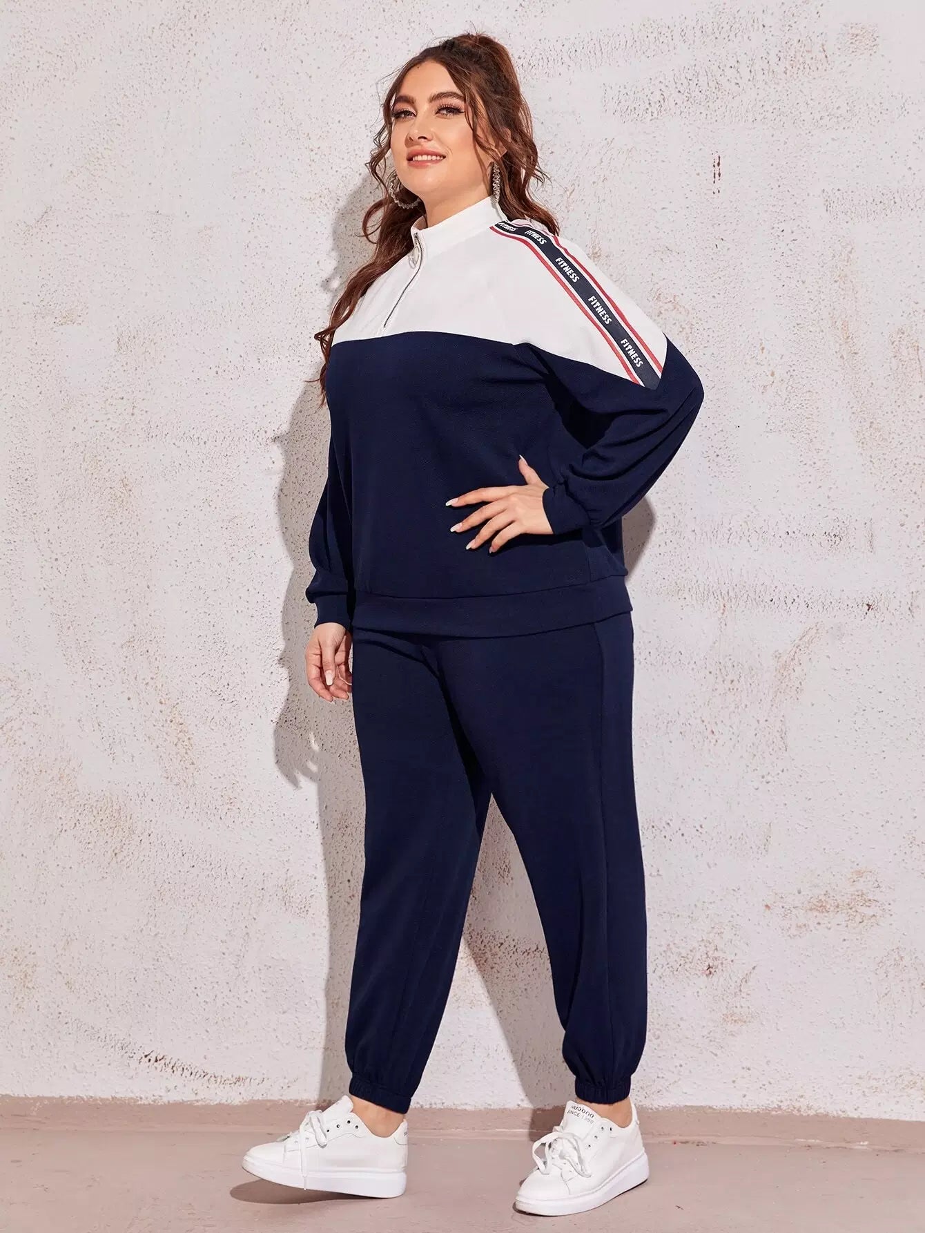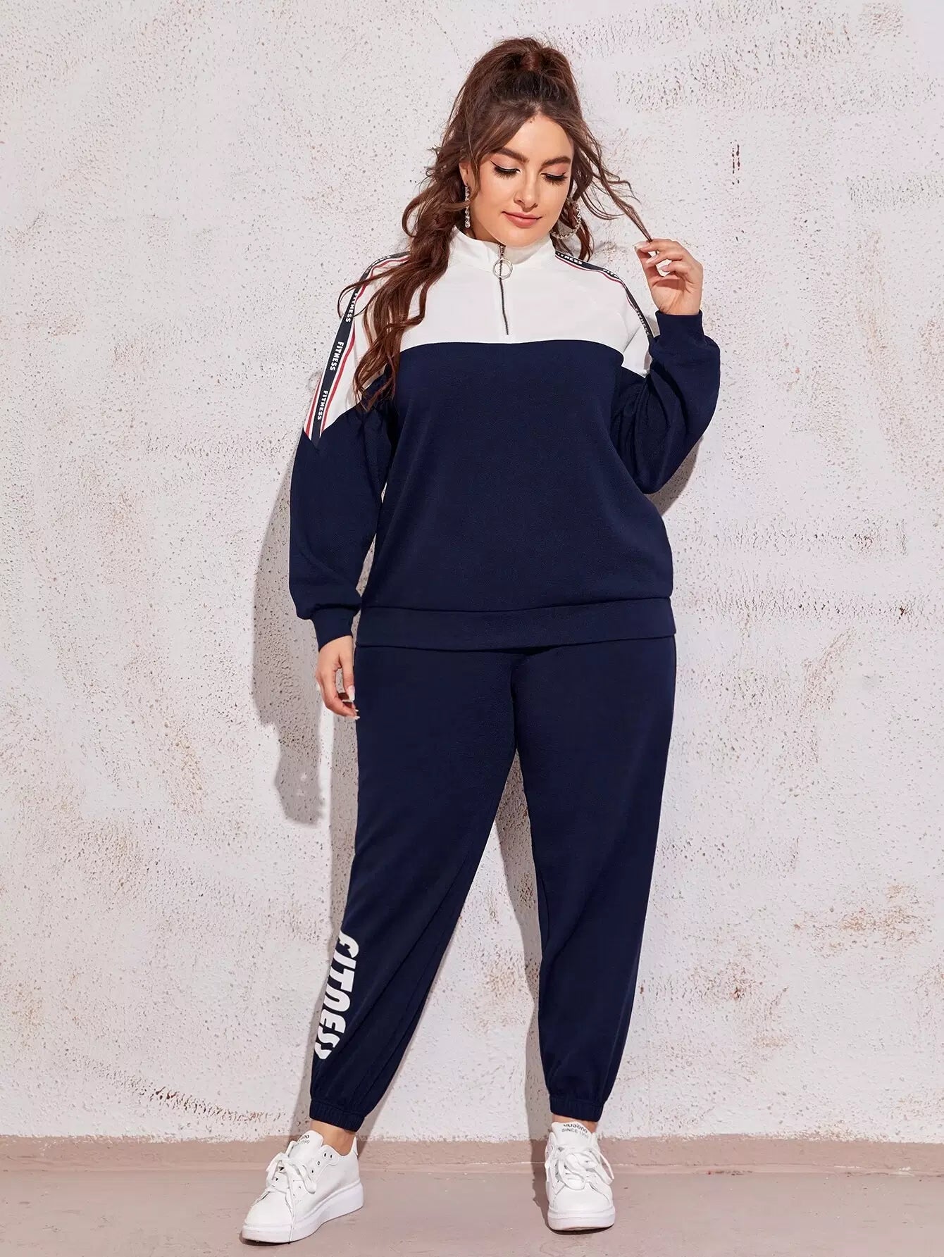 Plus Zipper Half Placket Letter Graphic Pullover & Joggers Set