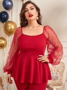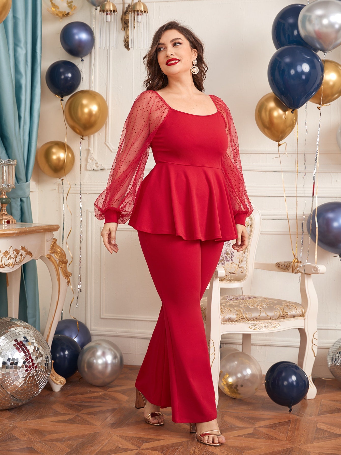 Plus Dobby Mesh Lantern Sleeve Peplum Top & Flared Leg Pants Set