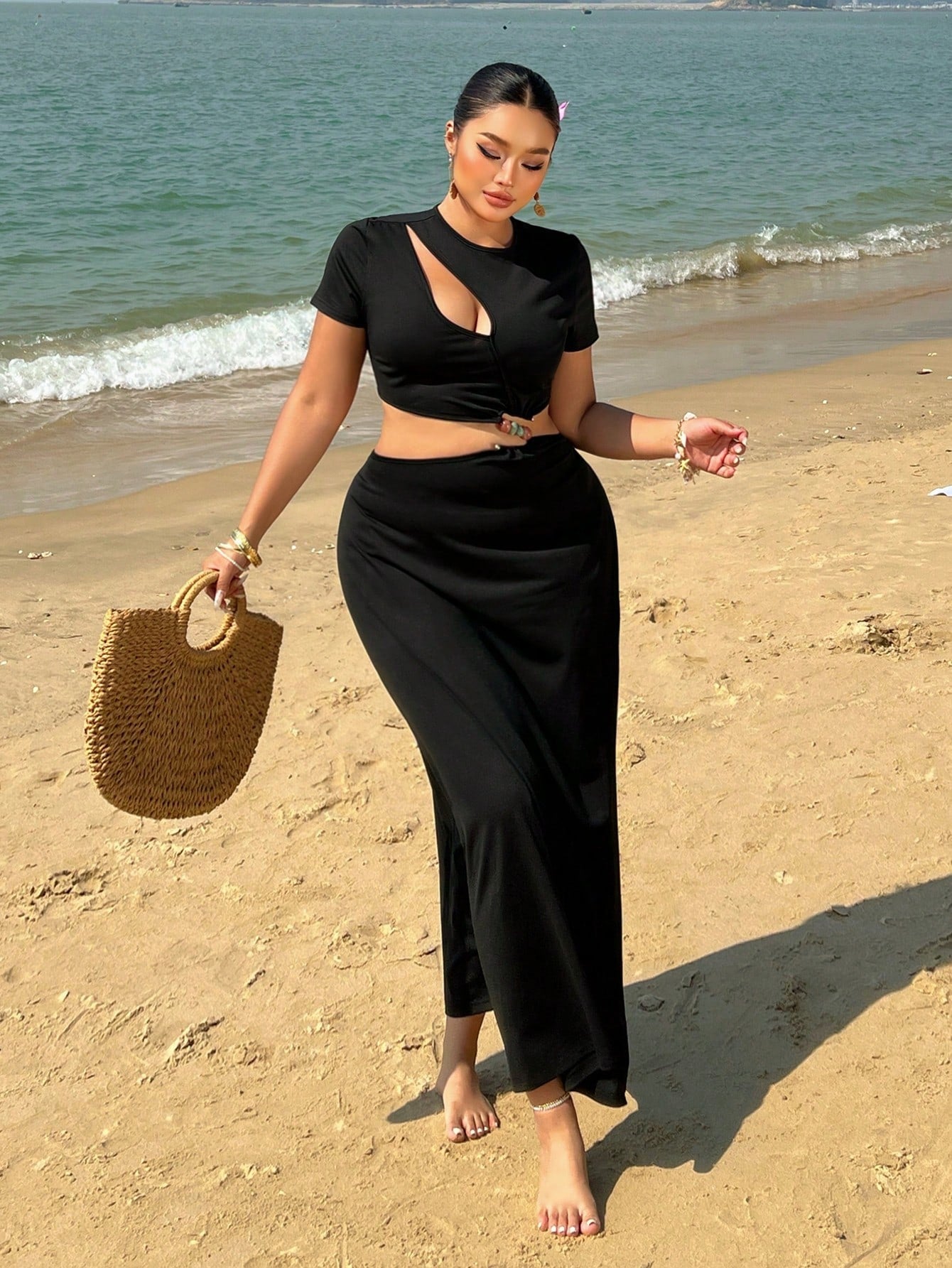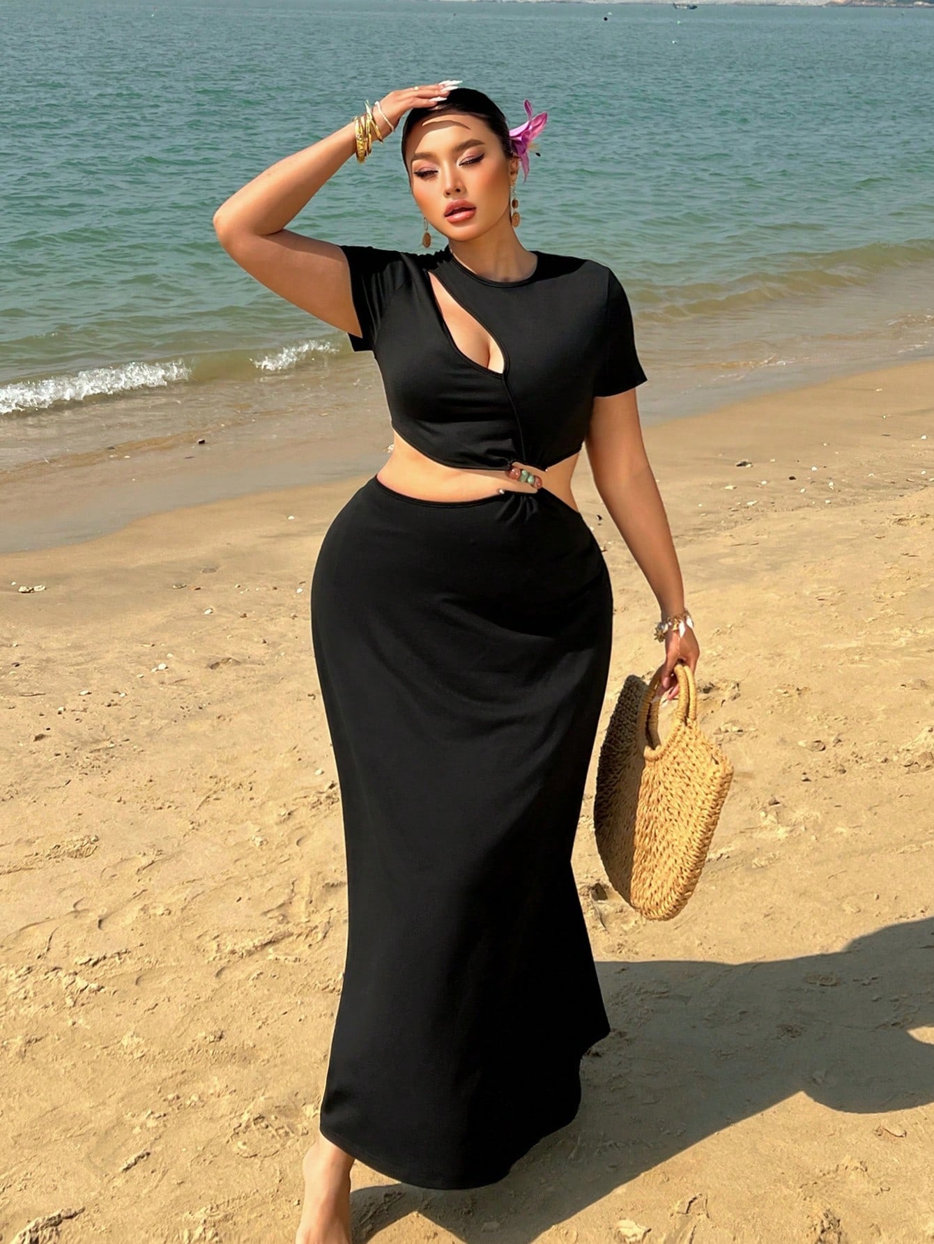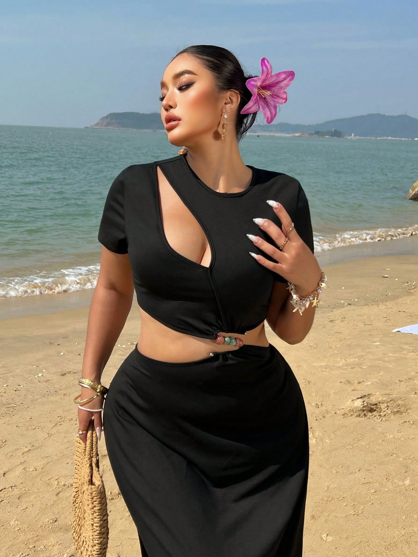 Sunnyshic Plus Size Asymmetric Cutout Short Sleeve T-Shirt And Beaded Skirt Set