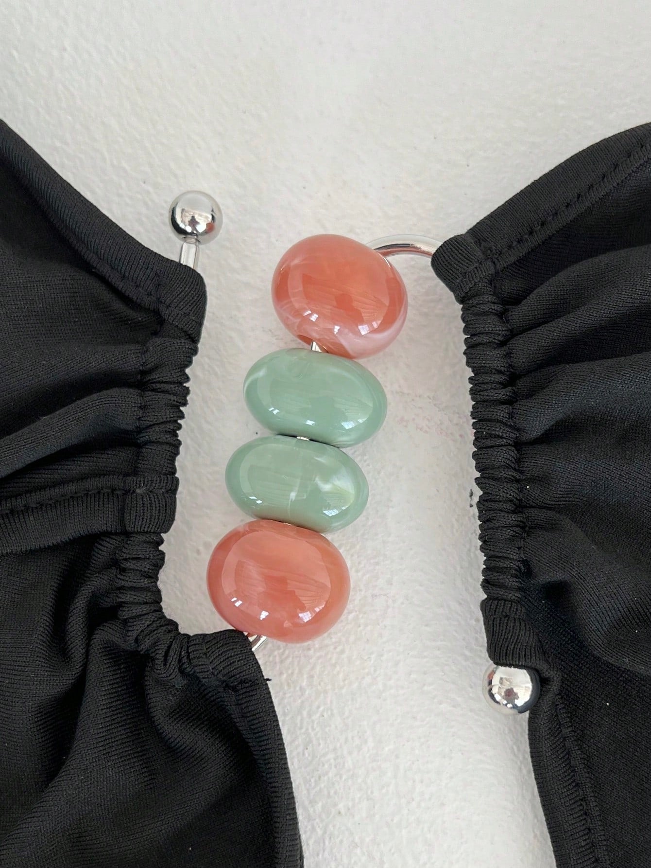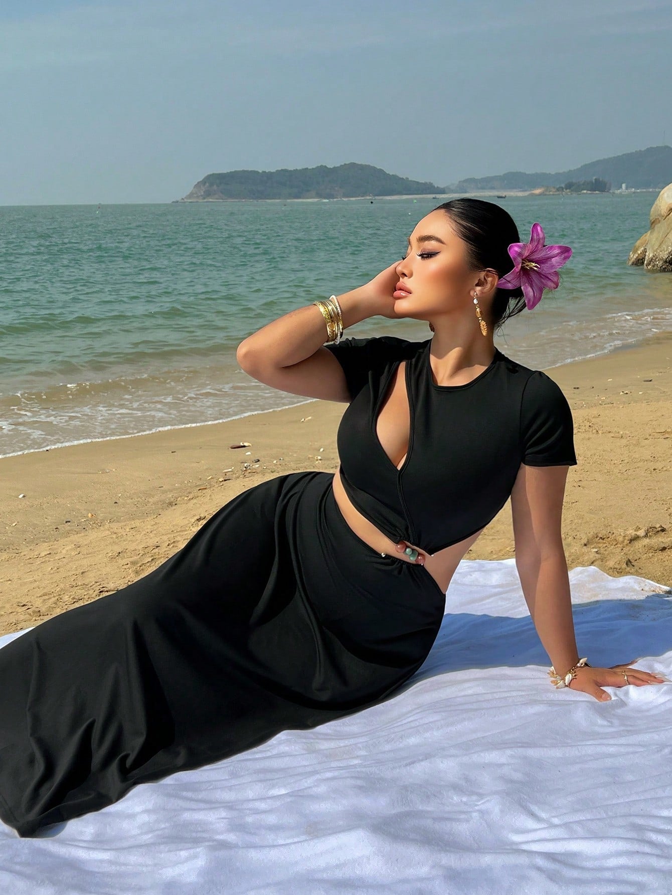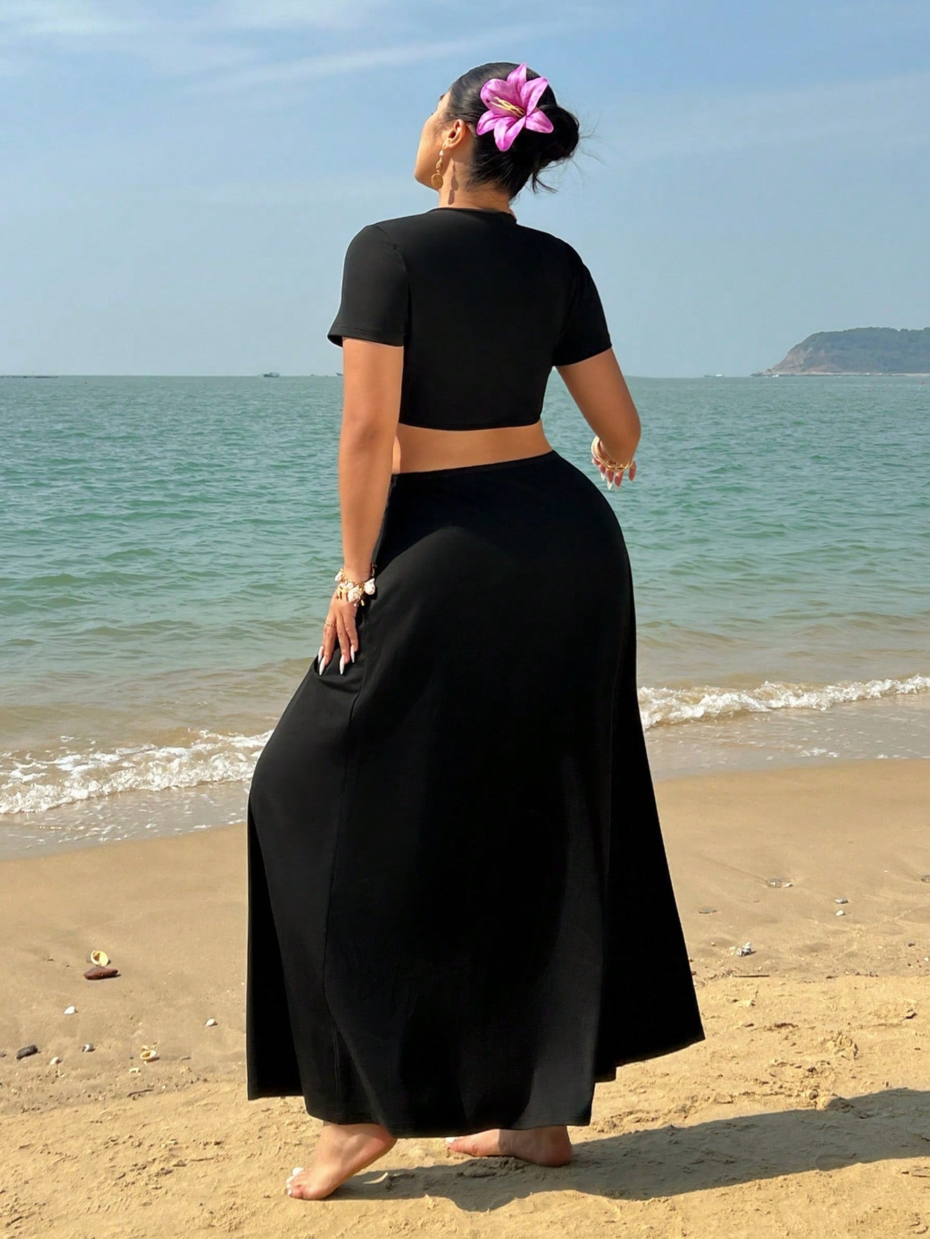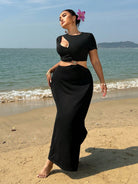 Sunnyshic Plus Size Asymmetric Cutout Short Sleeve T-Shirt And Beaded Skirt Set