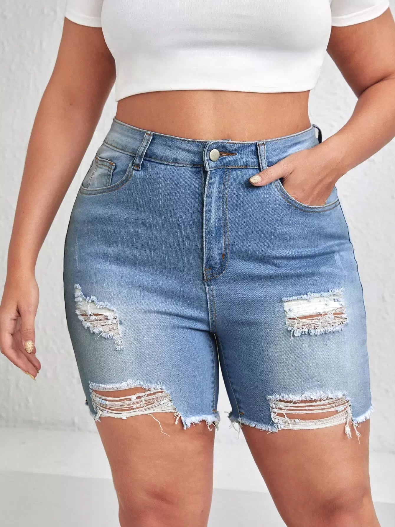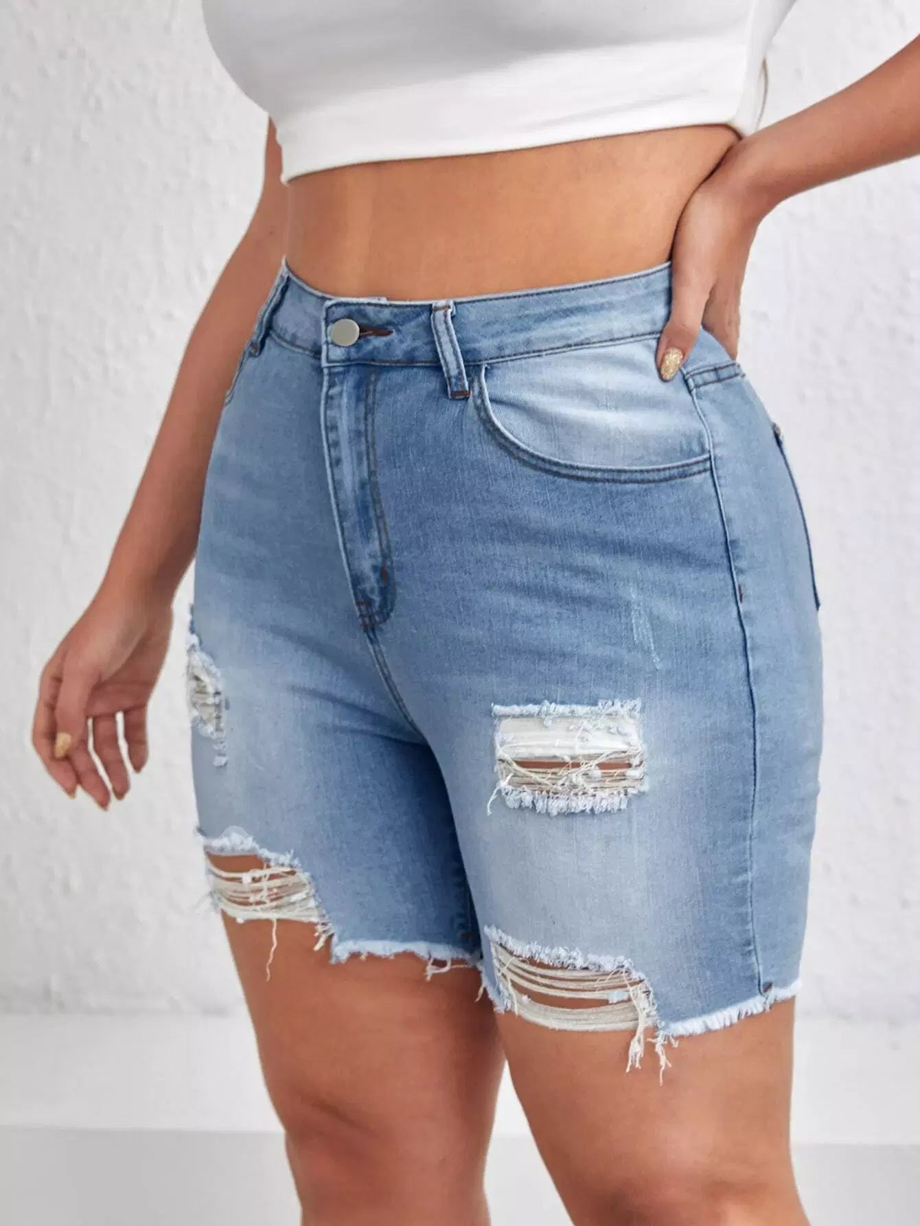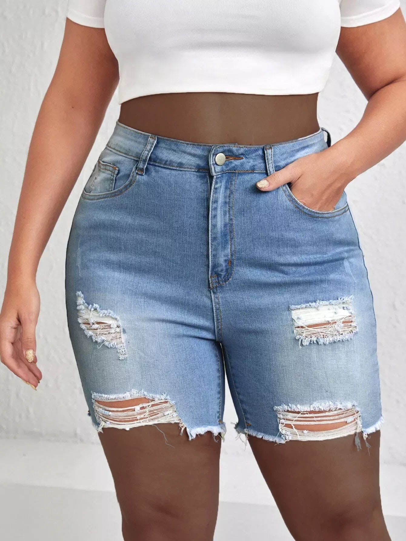 Plus High Waist Ripped Raw Hem Denim Shorts