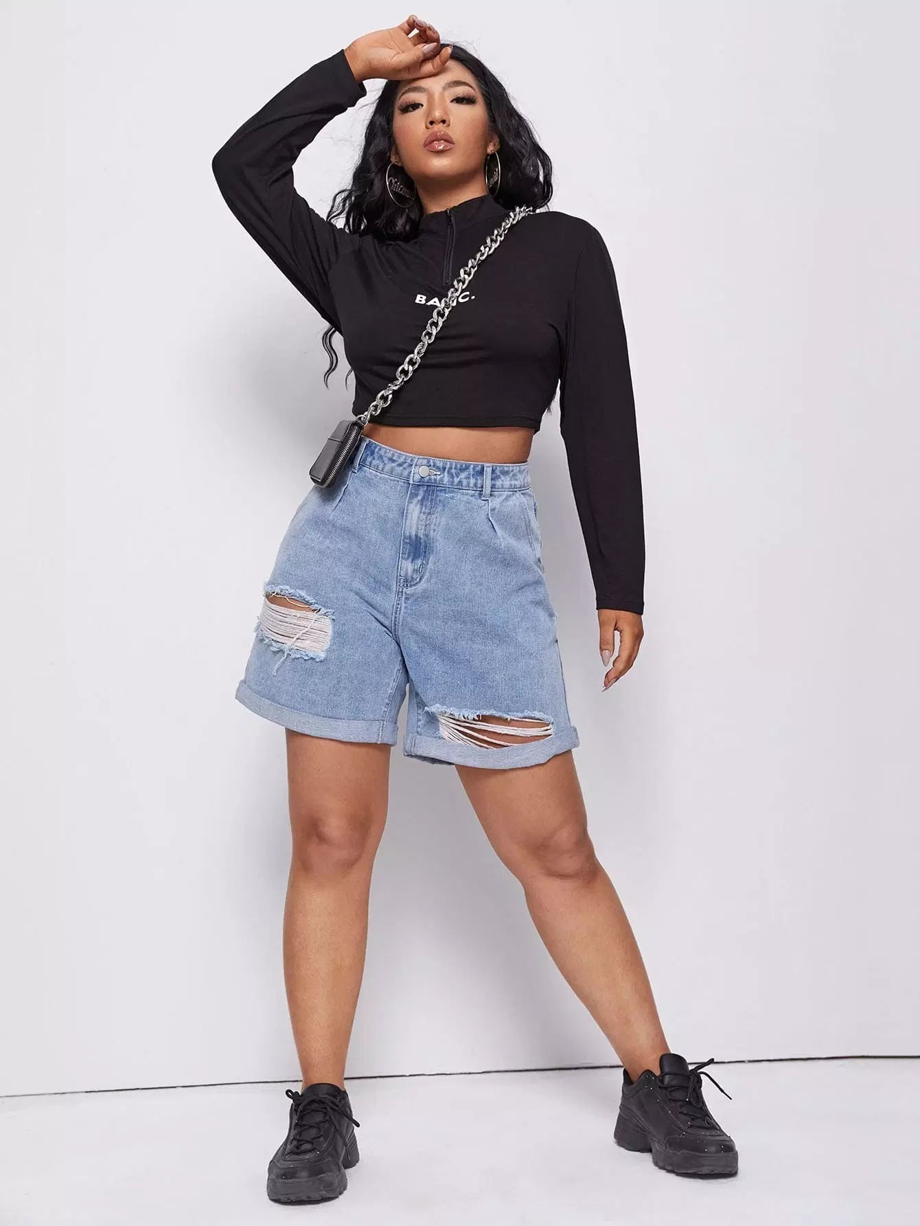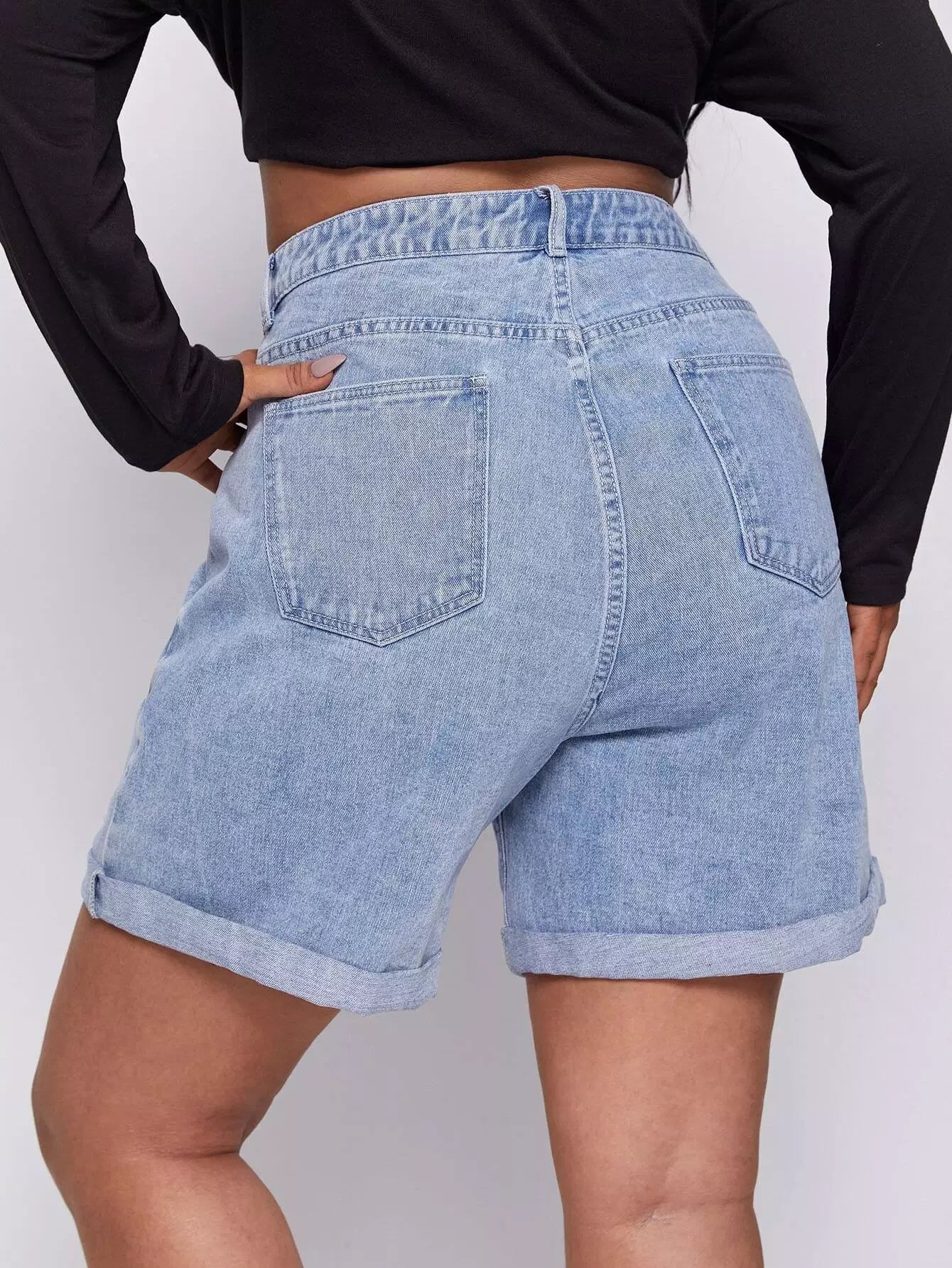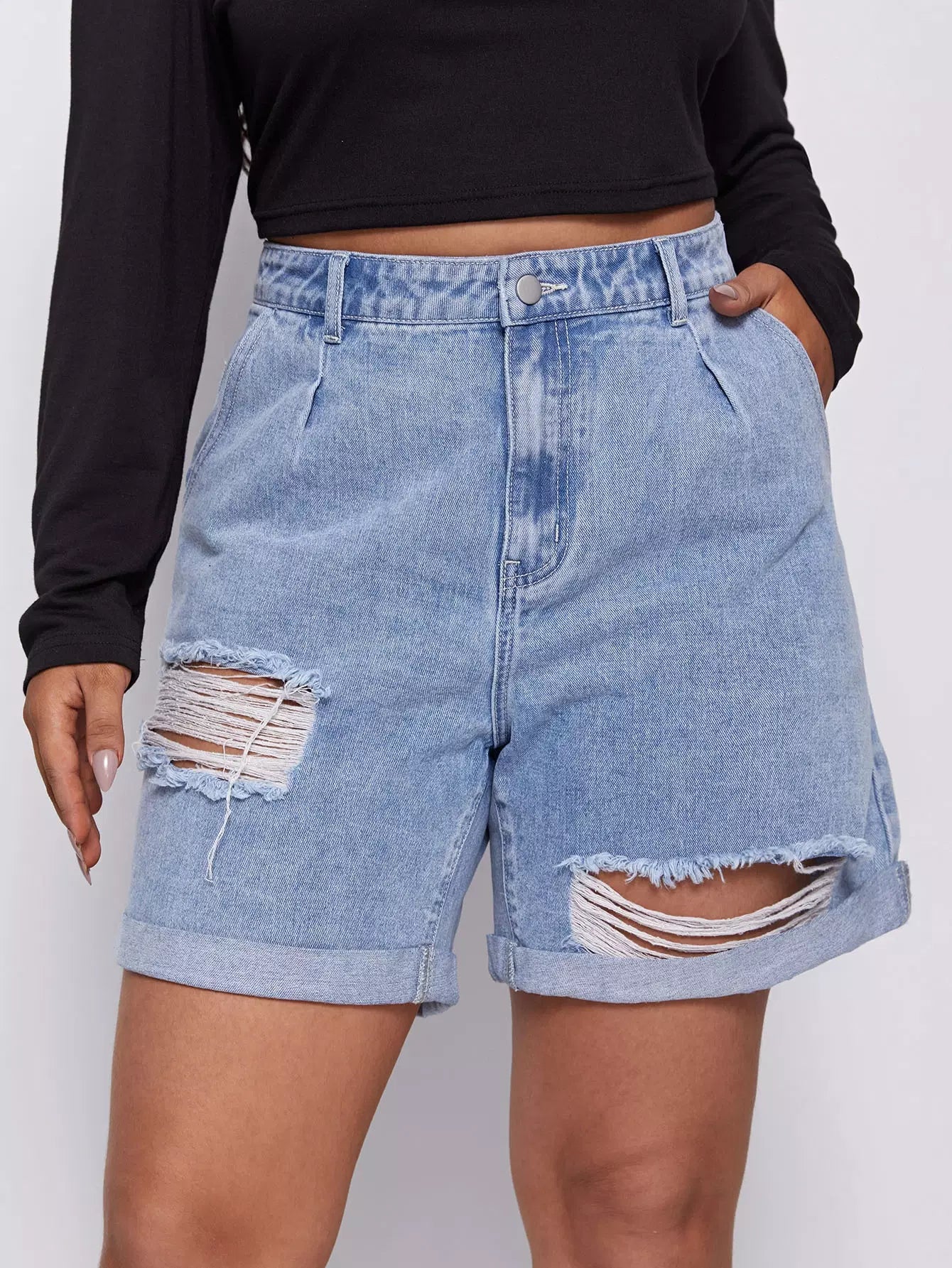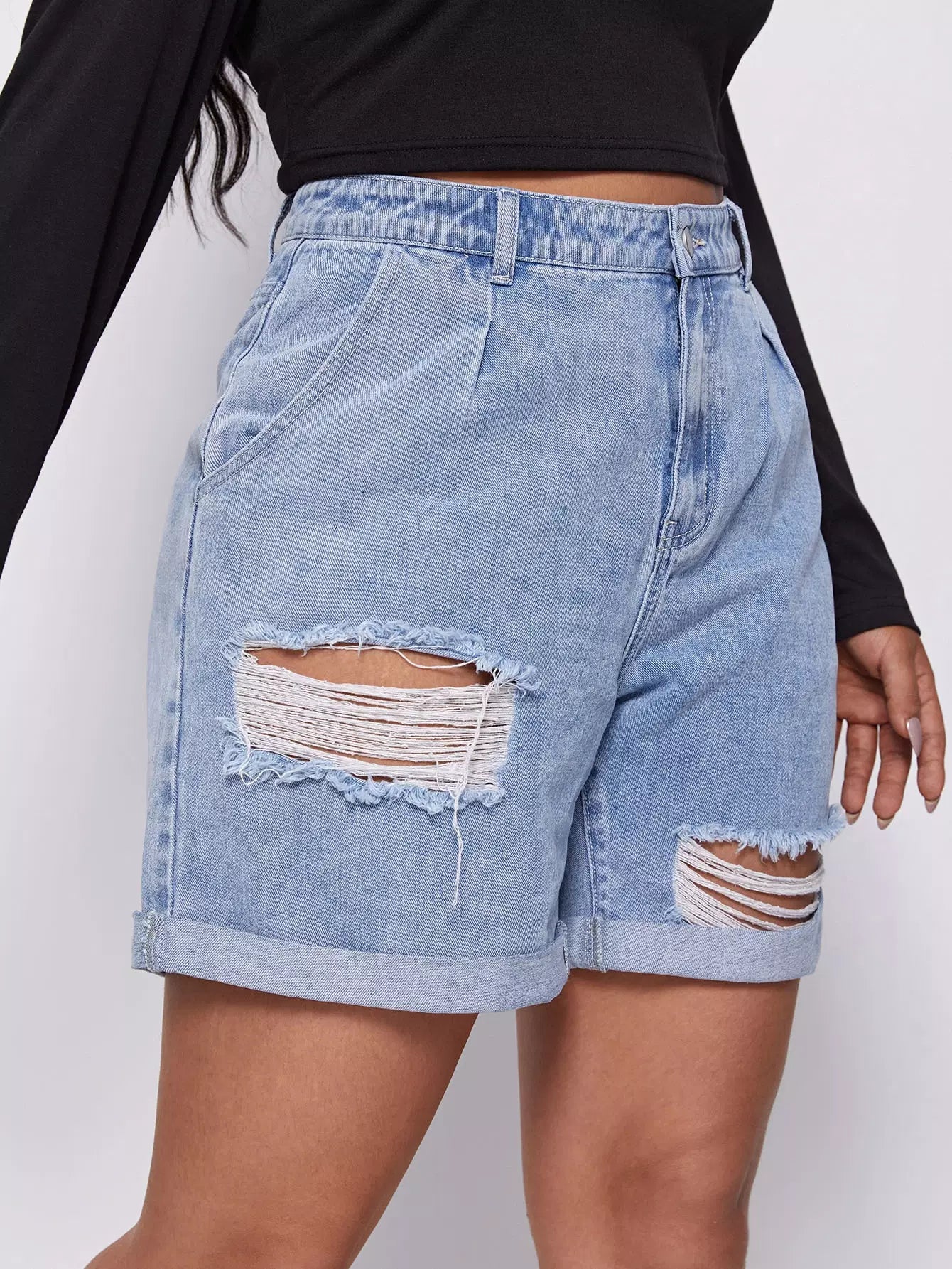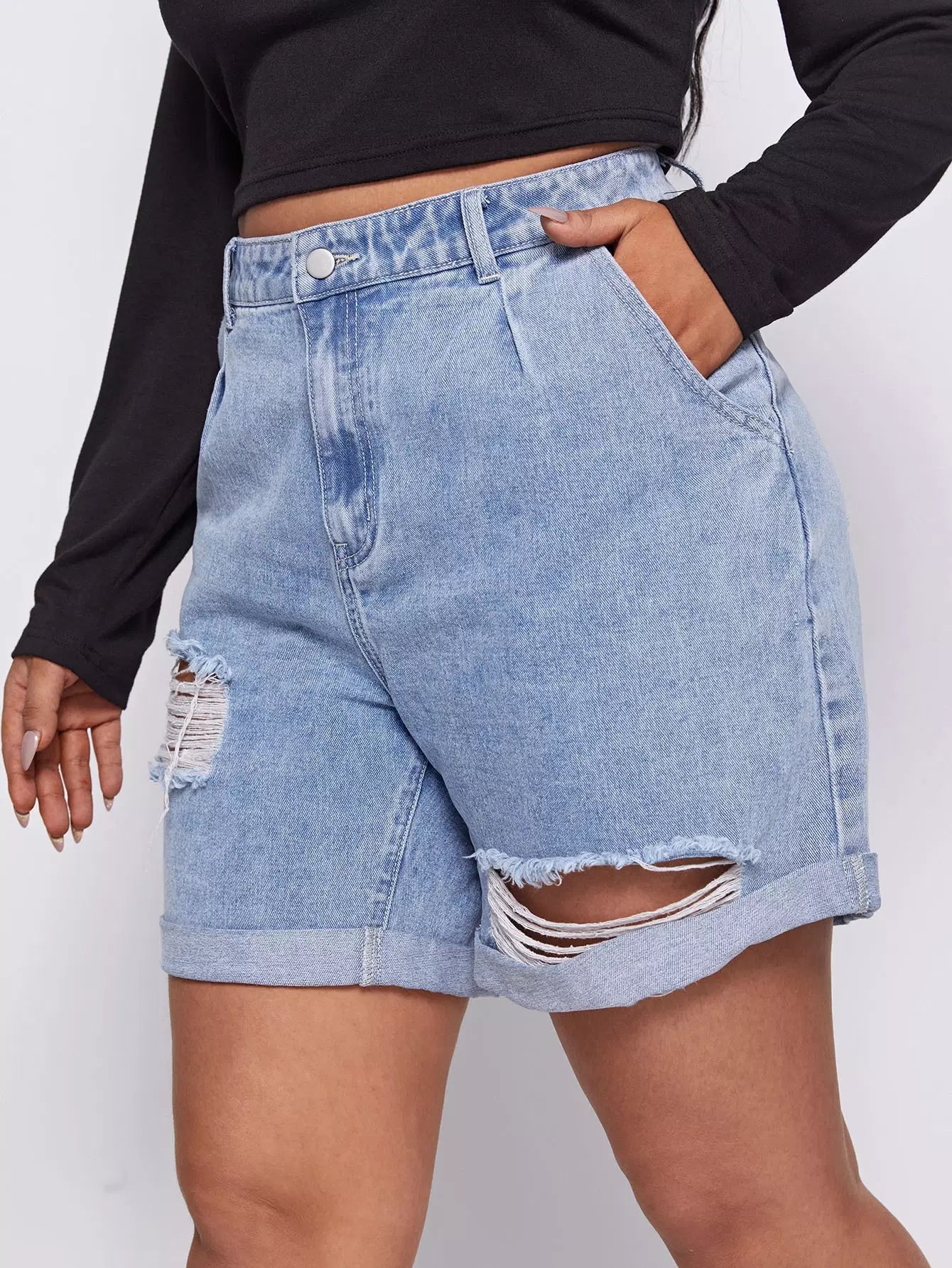 Plus High Waist Ripped Roll Hem Denim Shorts