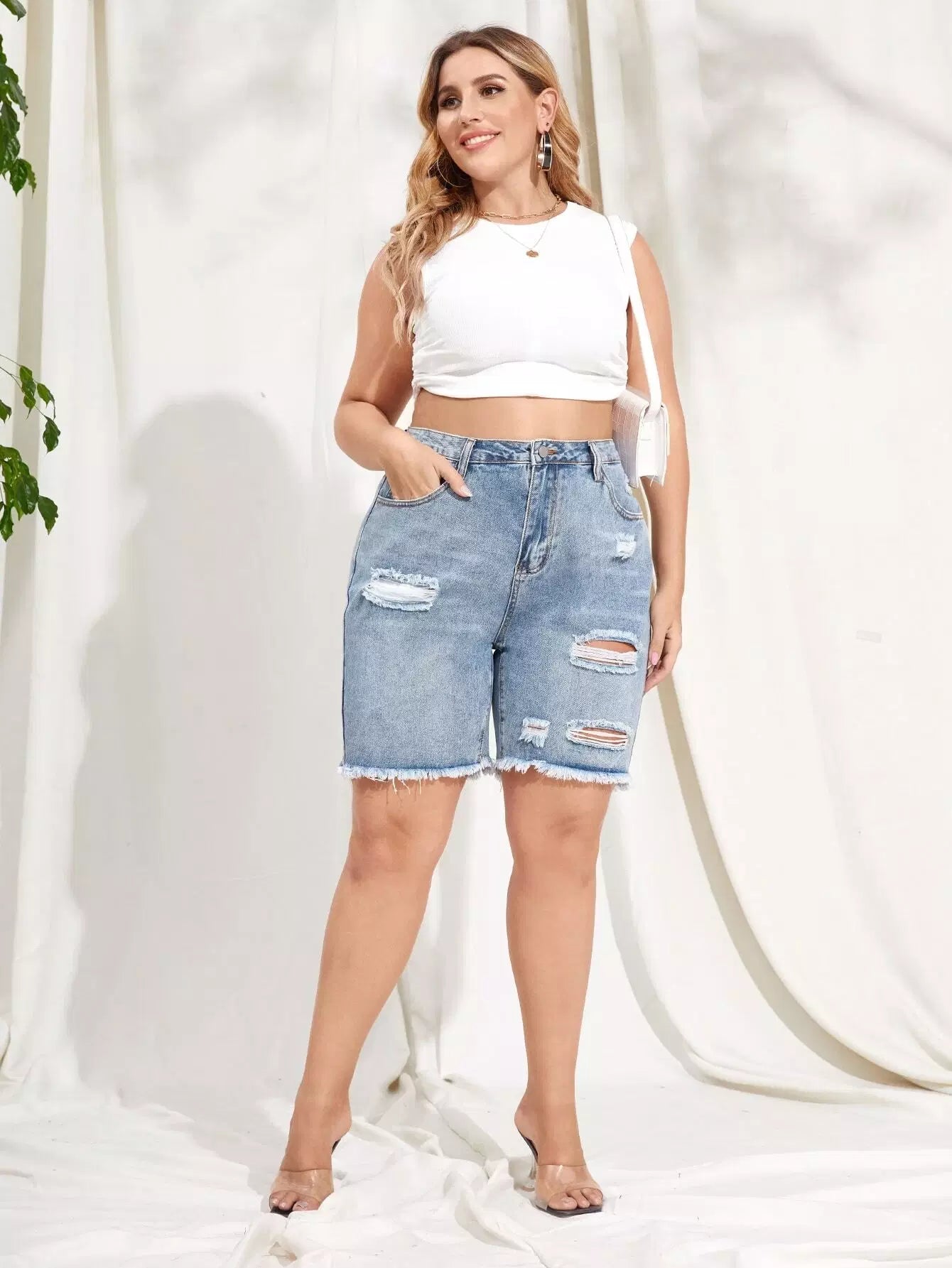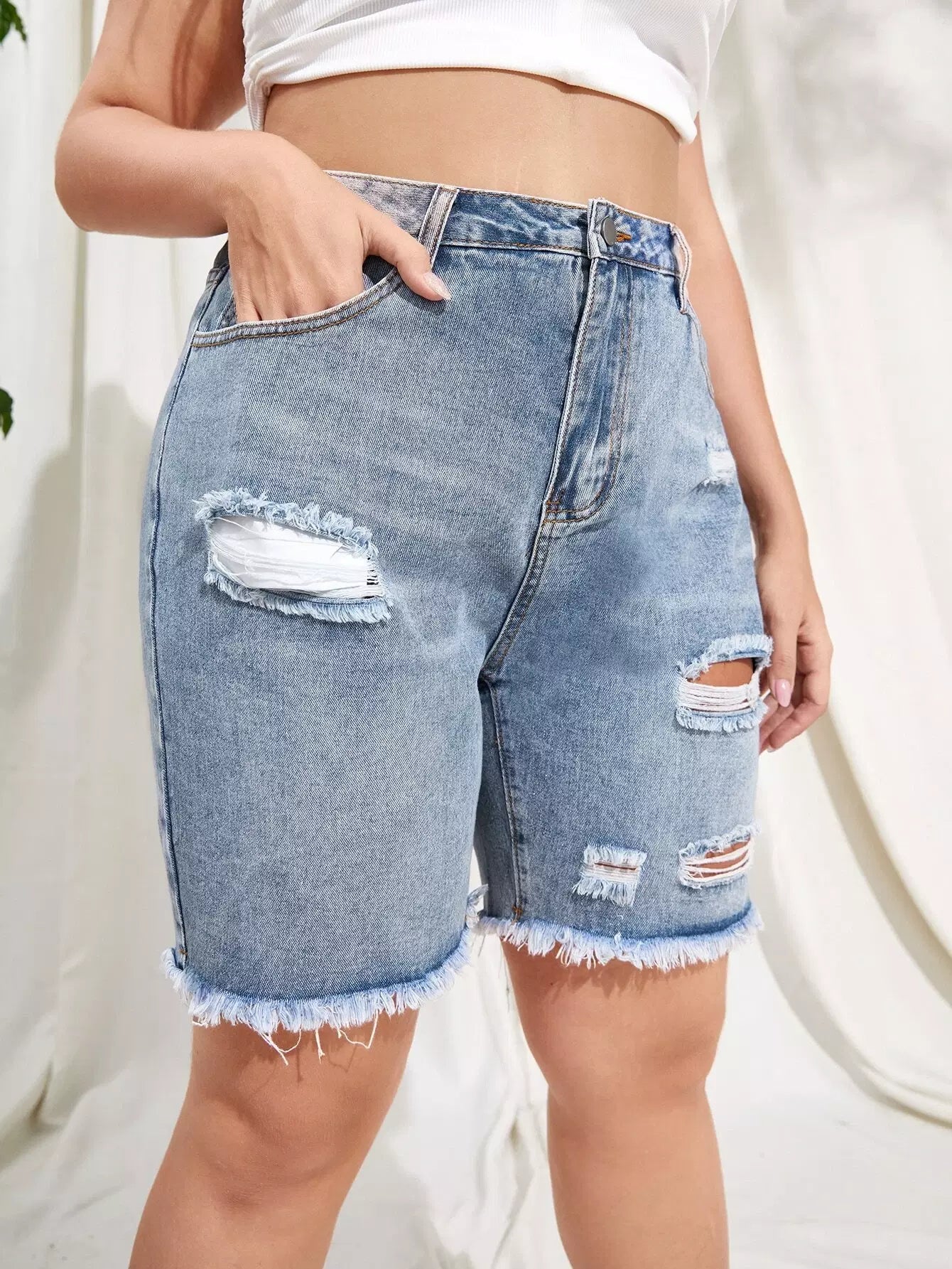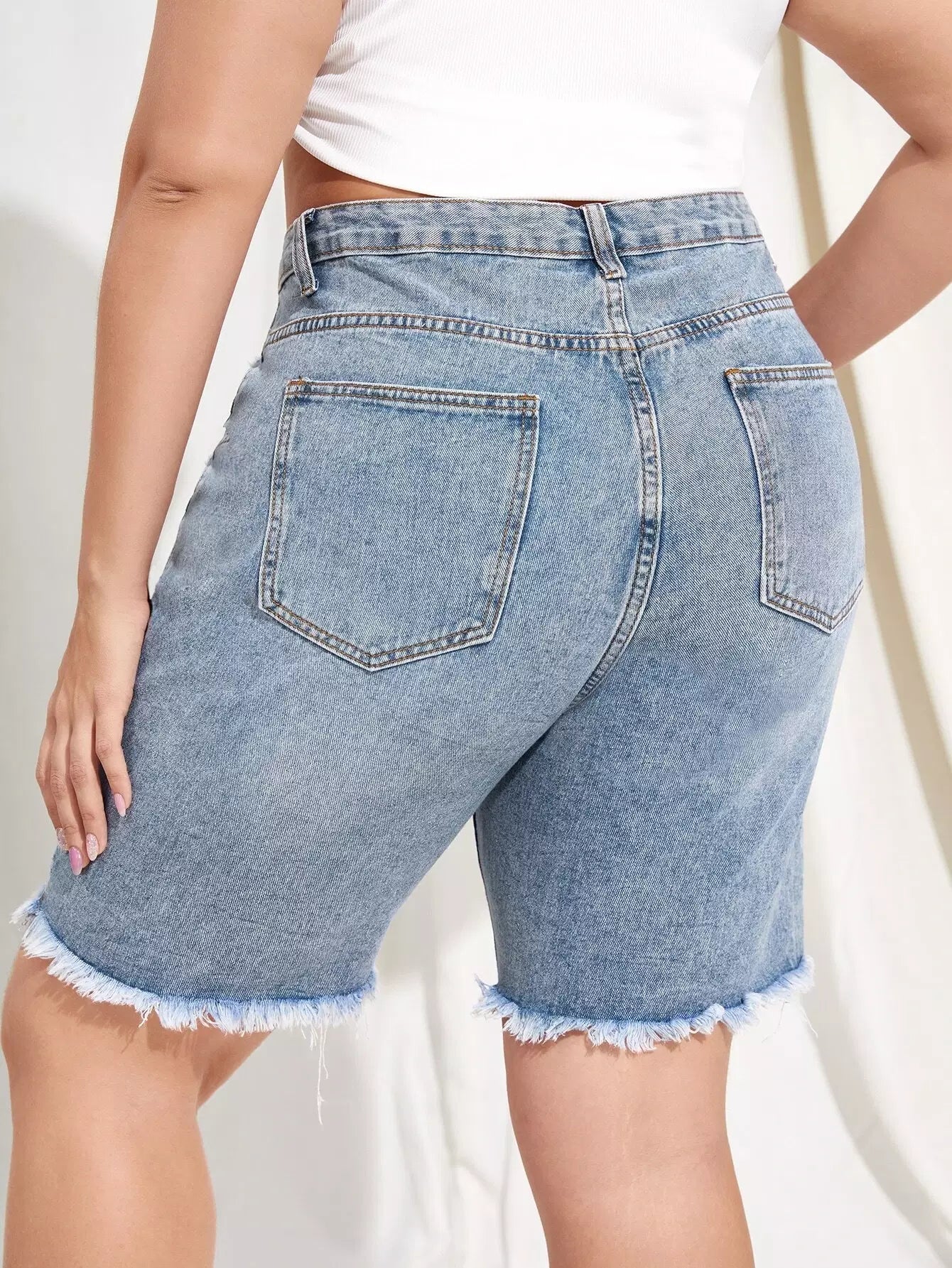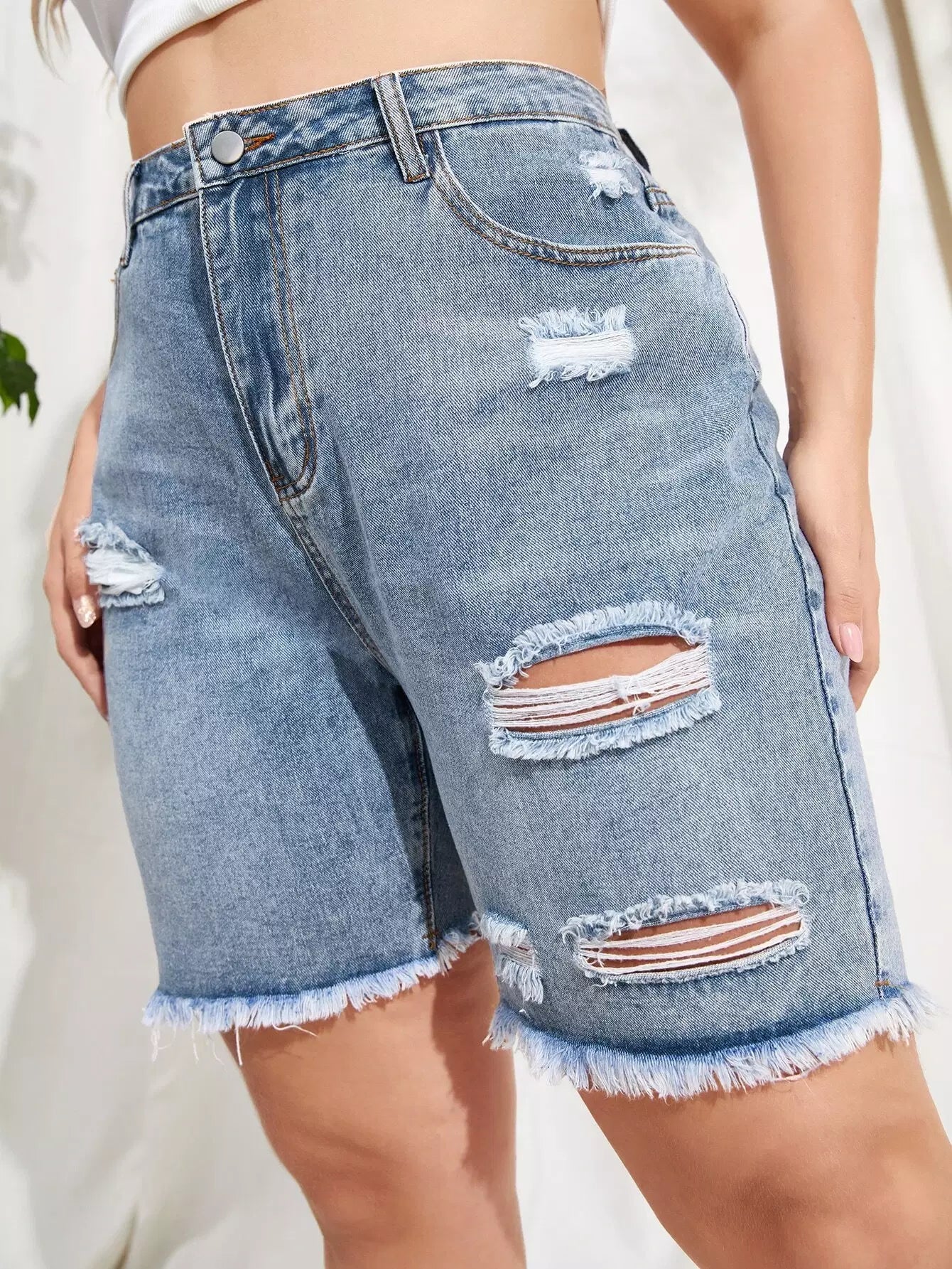 Plus Light Wash Ripped Detail Raw Hem Denim Shorts