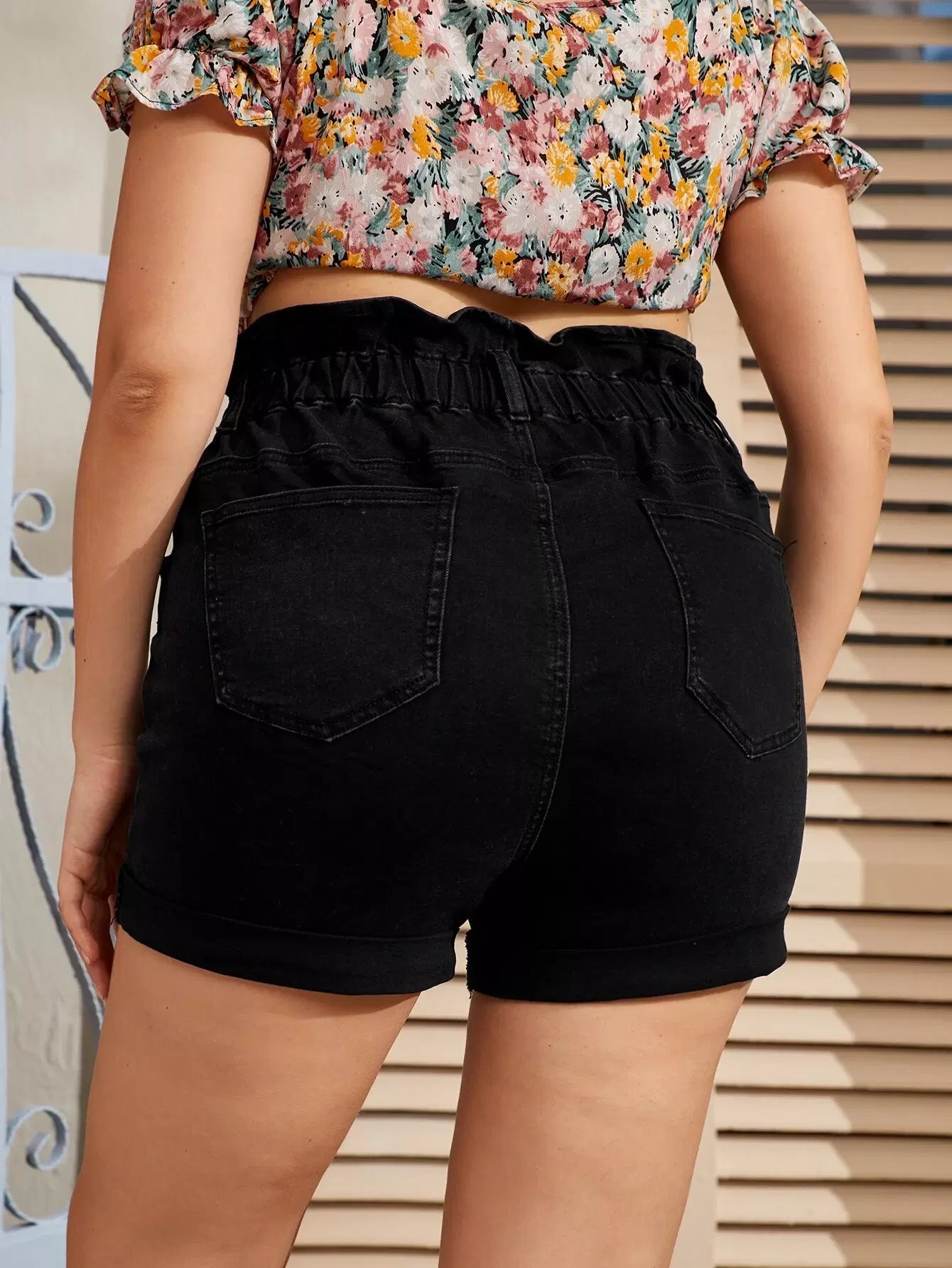 Women - Plus Paperbag Waist Cuffed Hem Denim Shorts