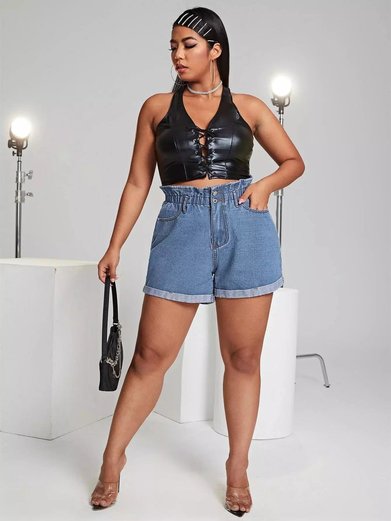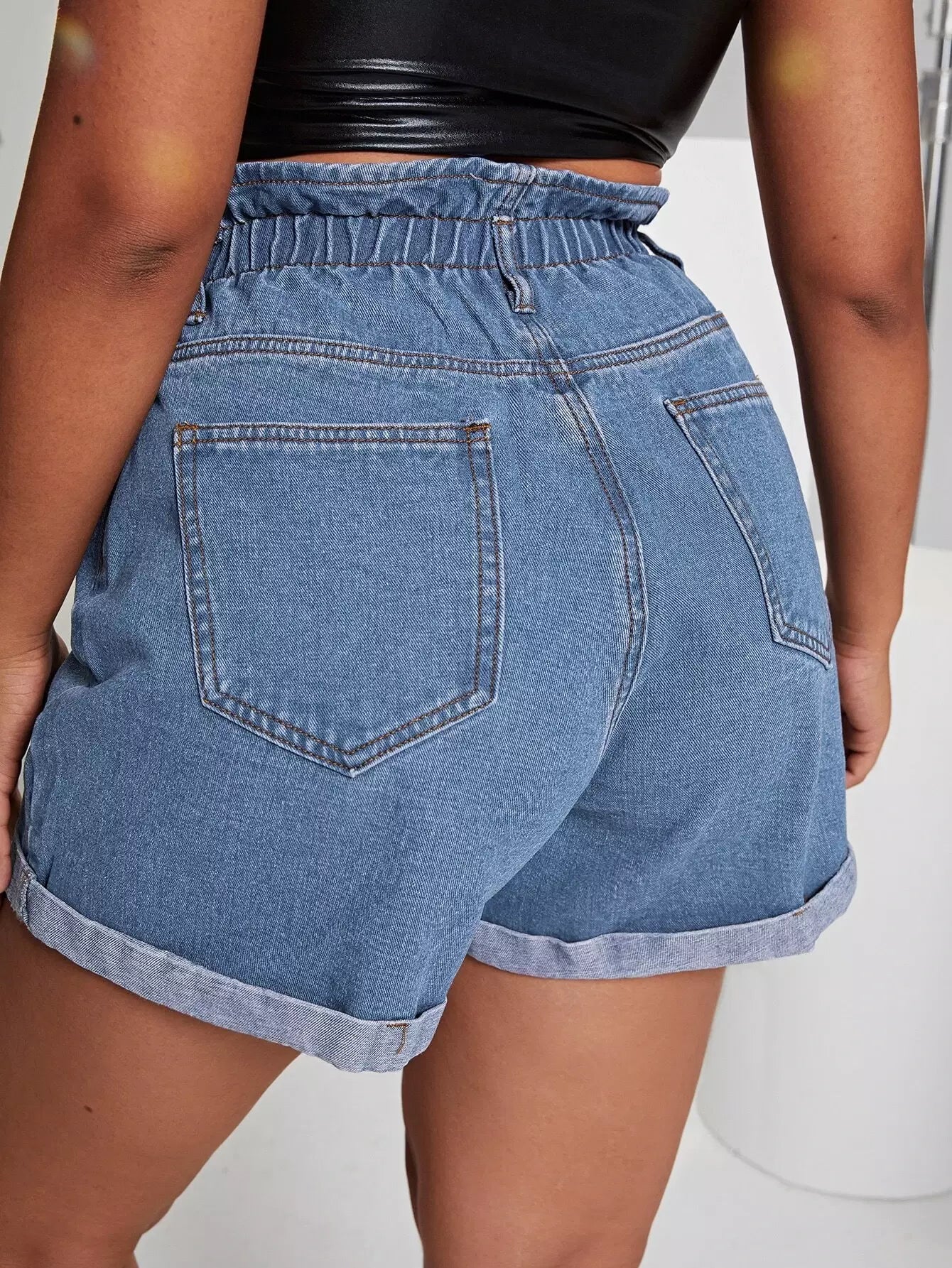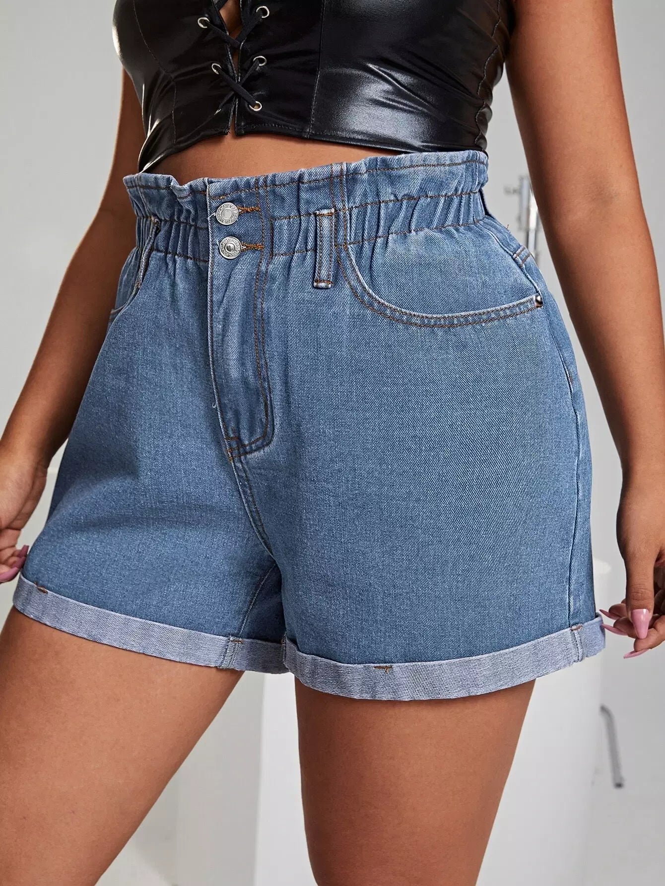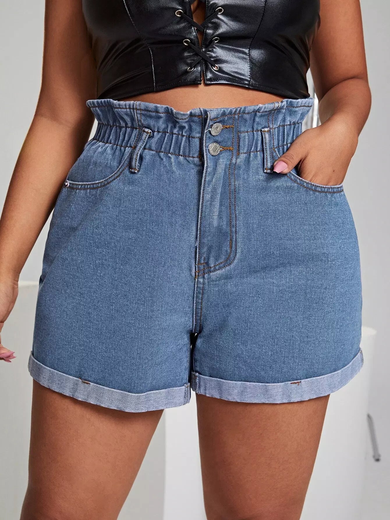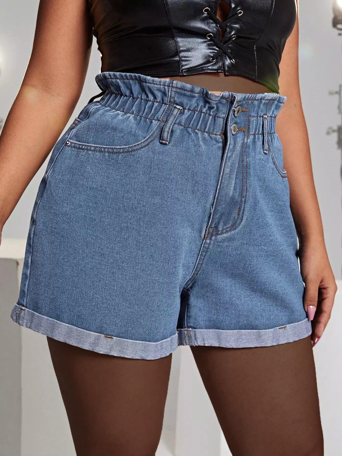 Plus Paperbag Waist Rolled Hem Denim Shorts