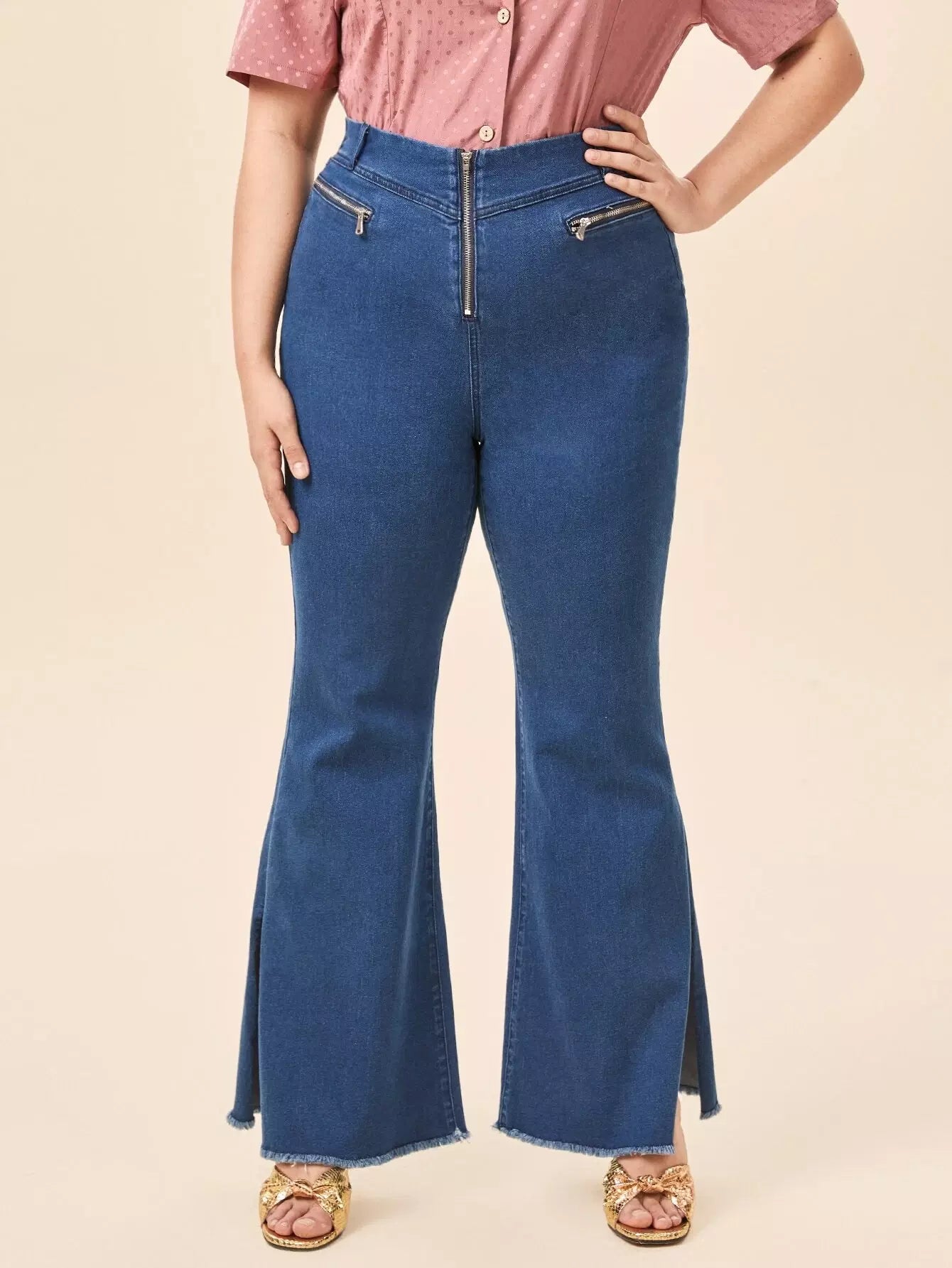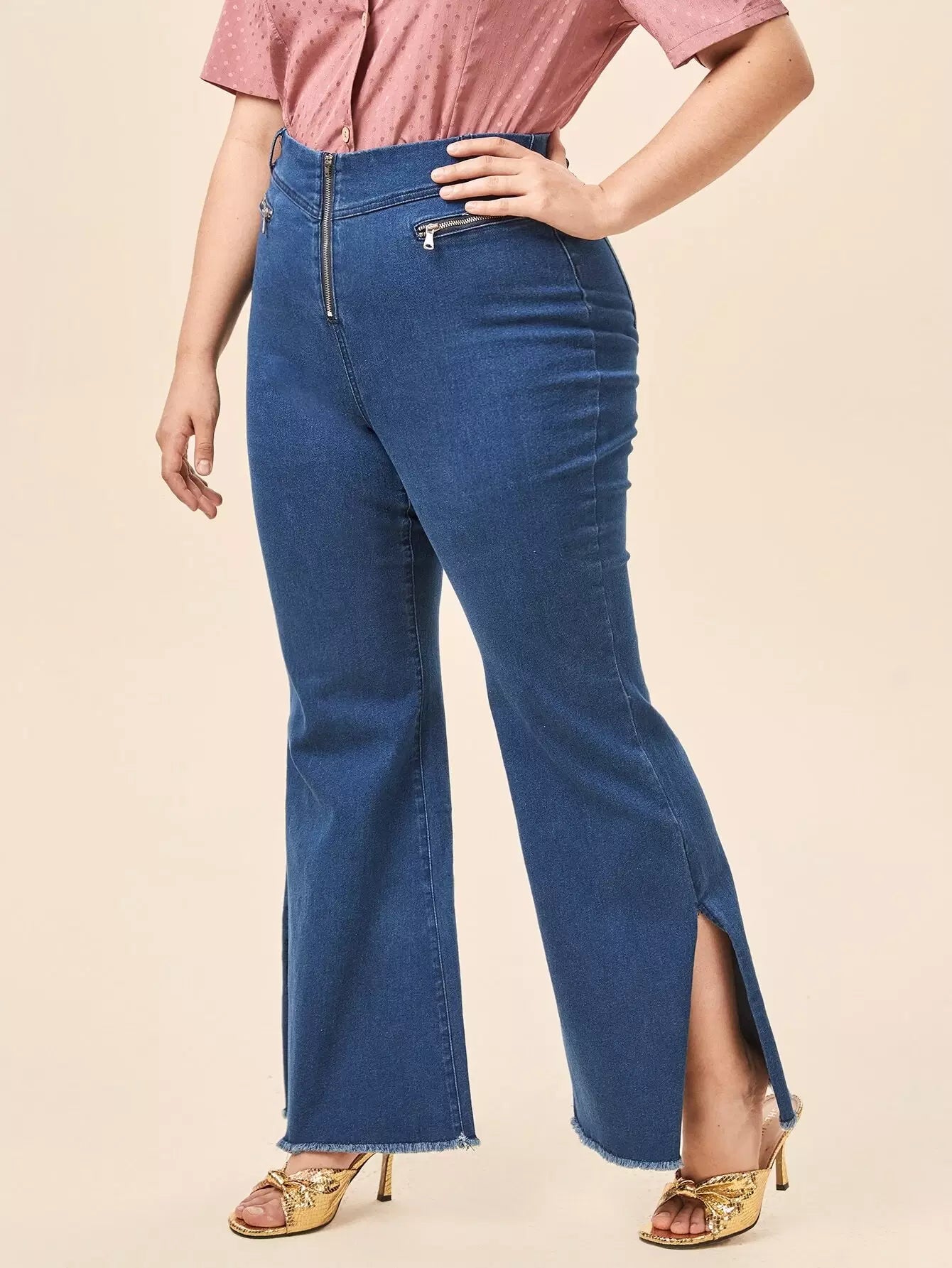 Plus Zipper Fly Split Raw Hem Flare Leg Jeans