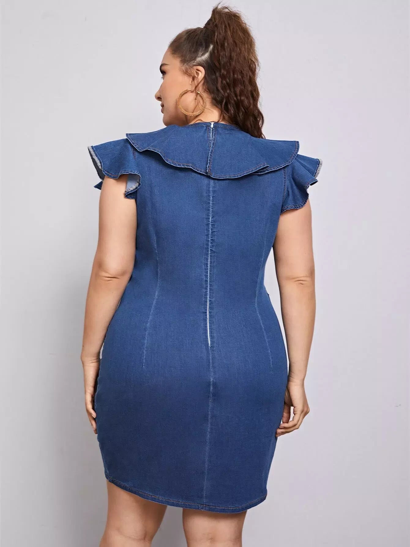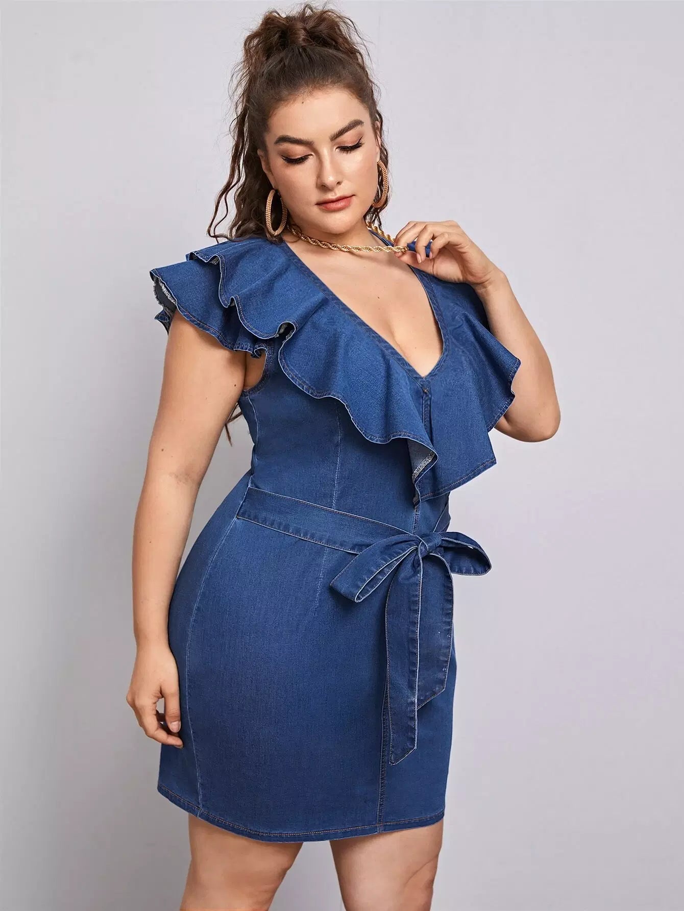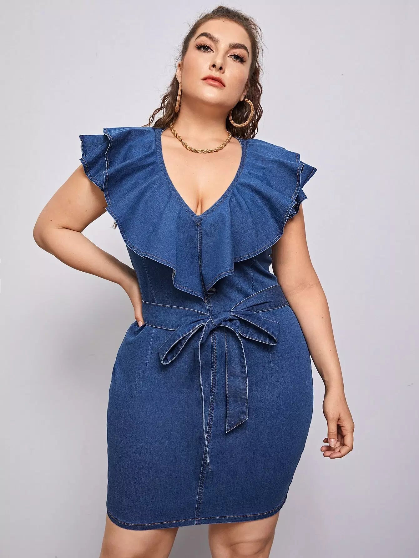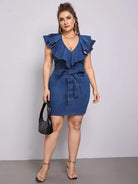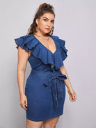 Plus Exaggerated Ruffle Tie Front Denim Dress