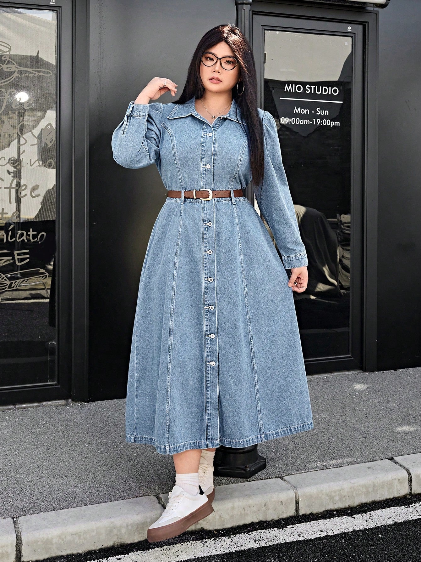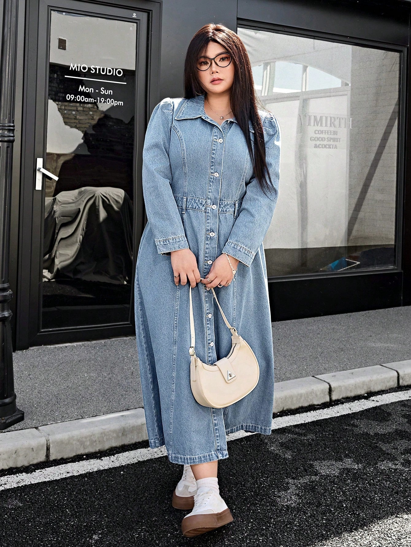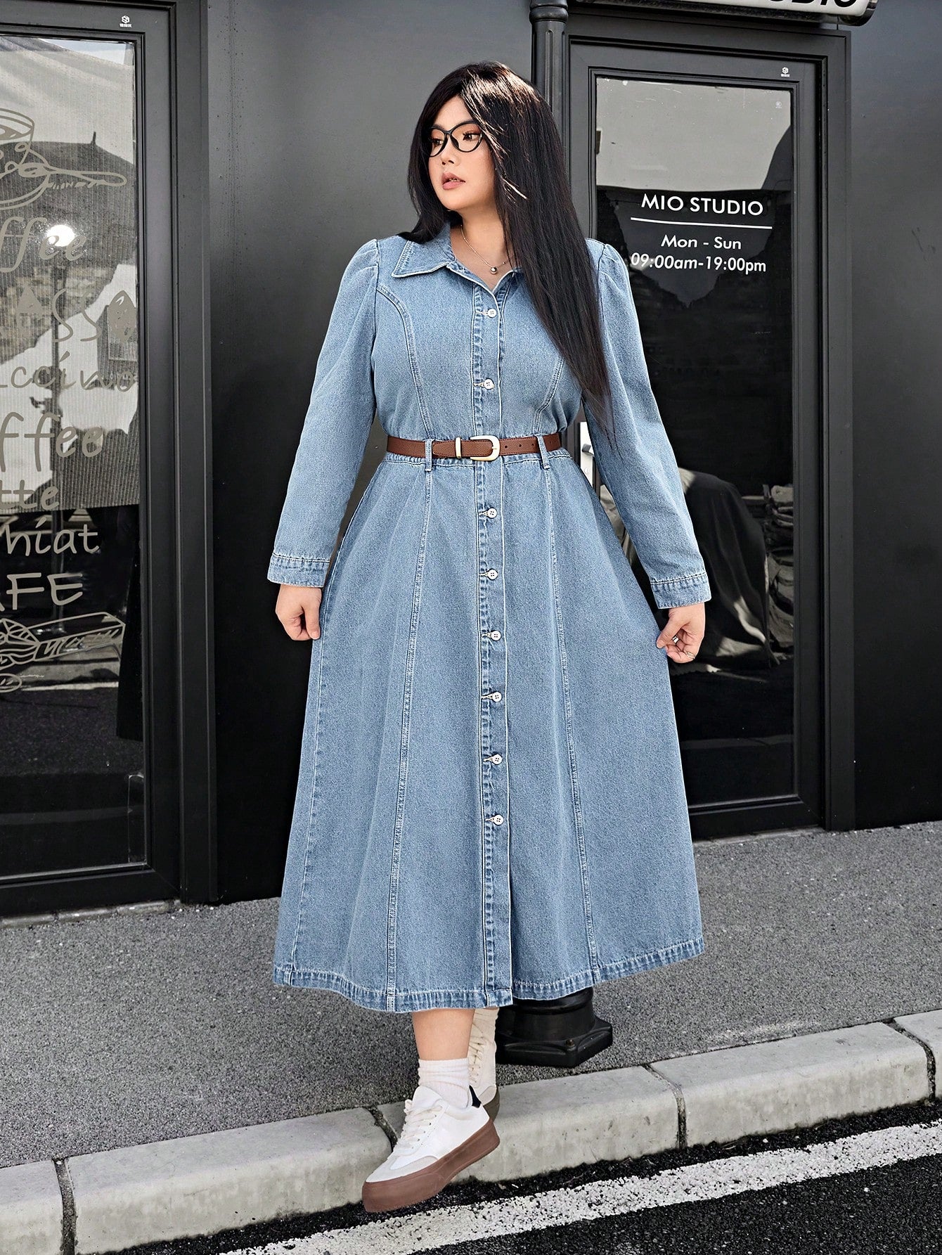 SHEIN EZwear Plus Size Casual Washed Snap Front Puff Sleeve Denim Dress