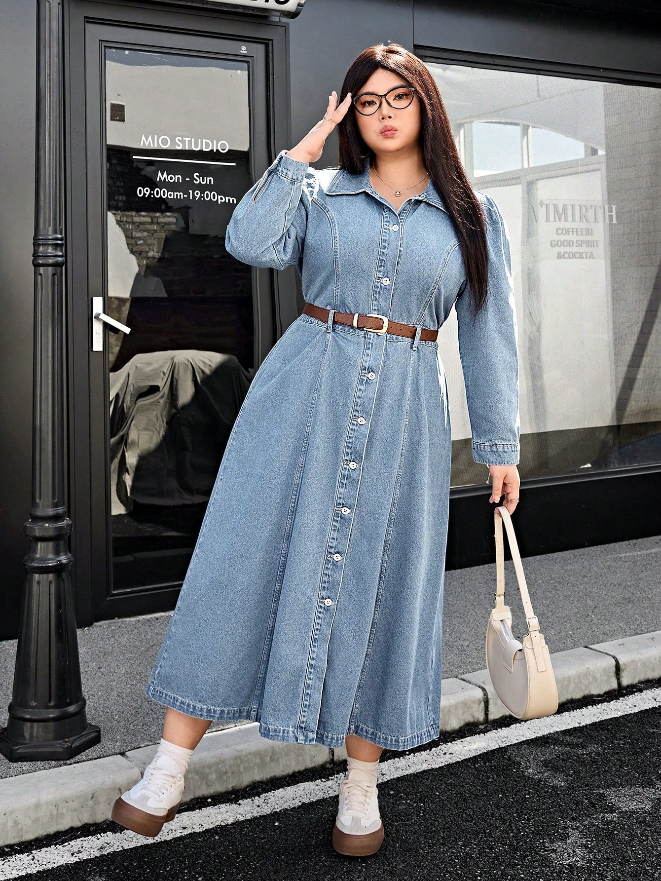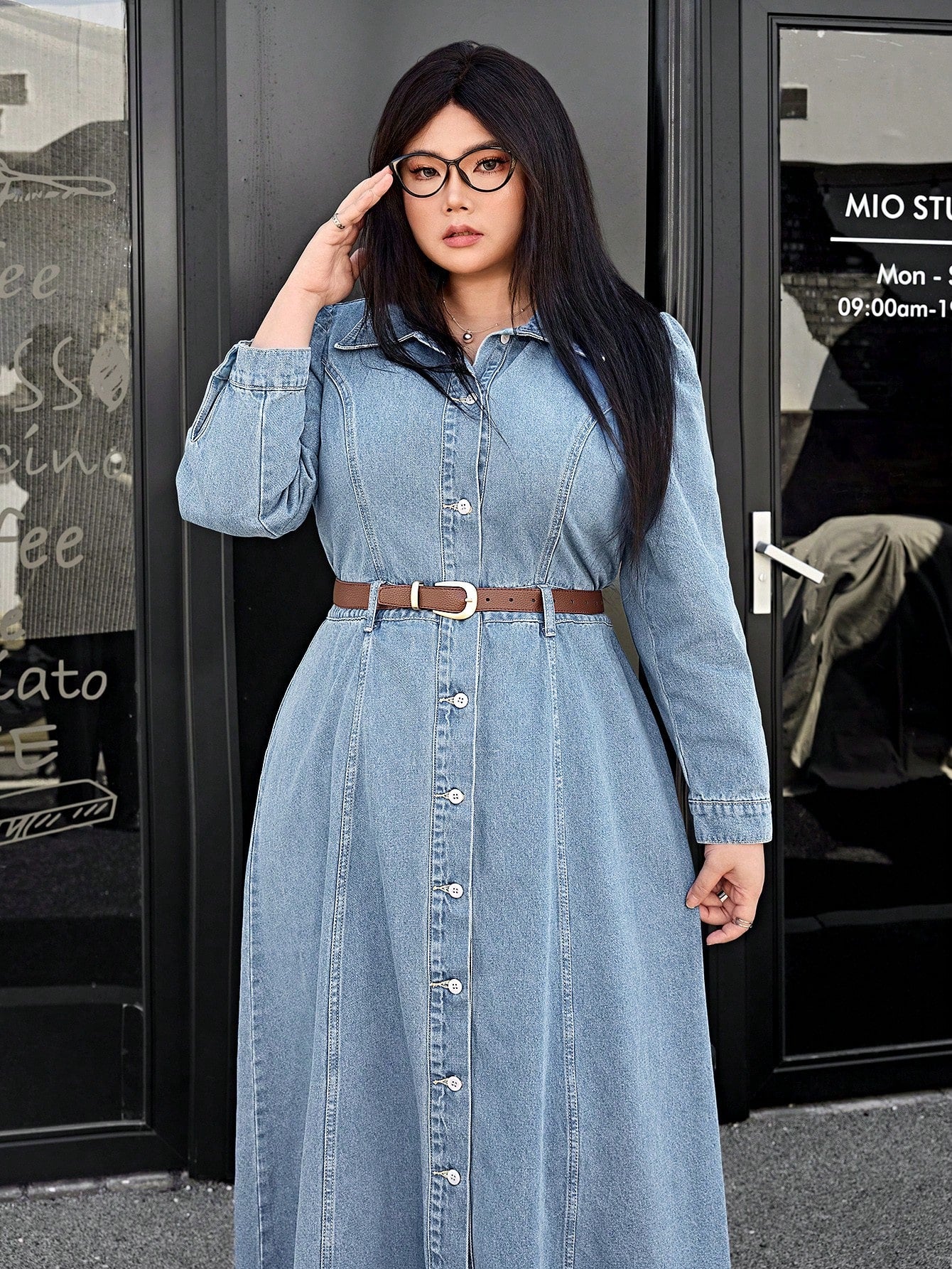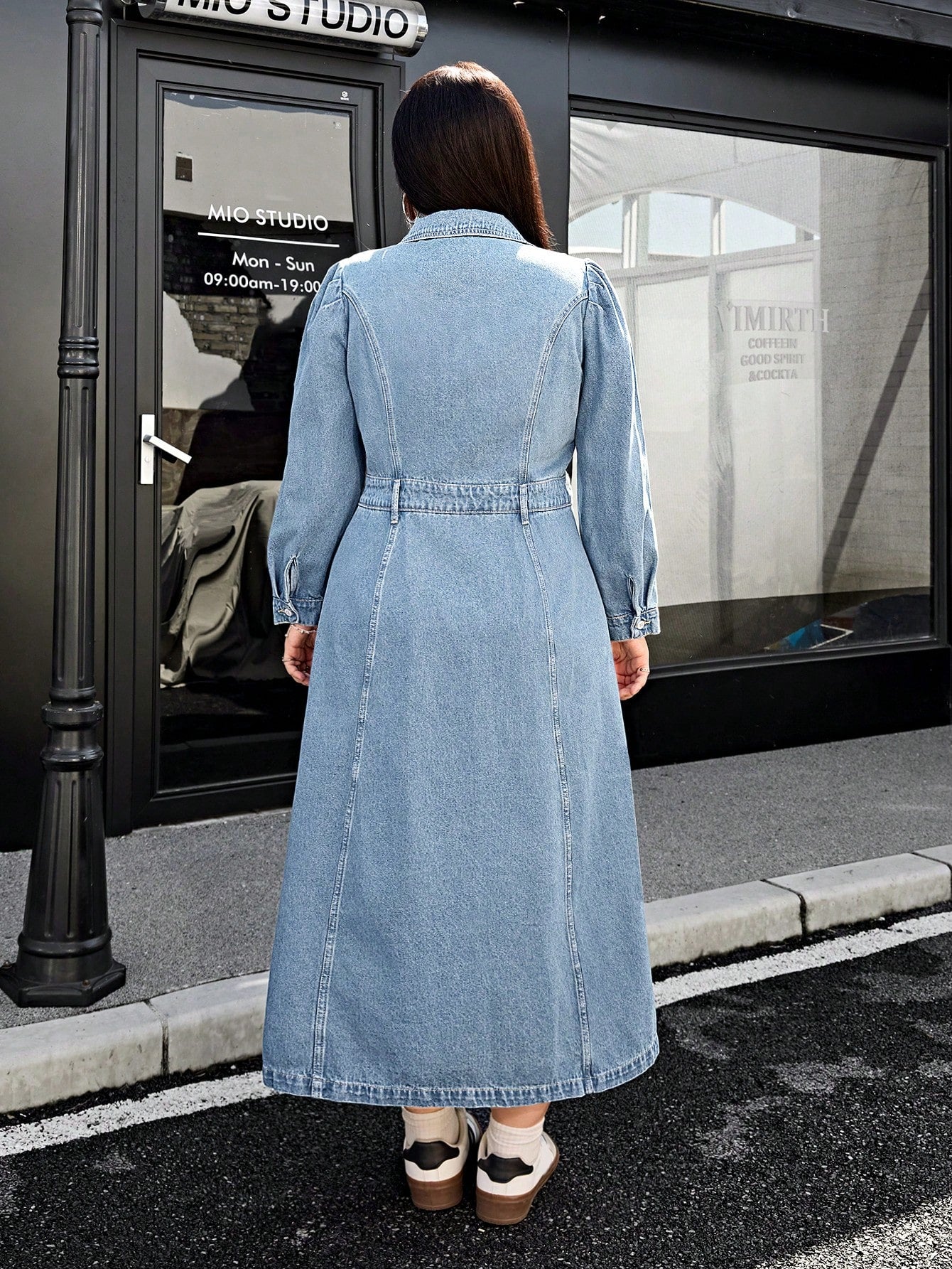 SHEIN EZwear Plus Size Casual Washed Snap Front Puff Sleeve Denim Dress