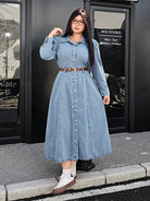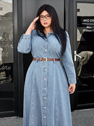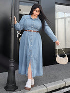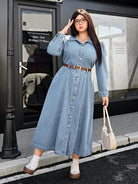 women SHEIN EZwear Plus Size Casual Washed Snap Front Puff Sleeve Denim Dress