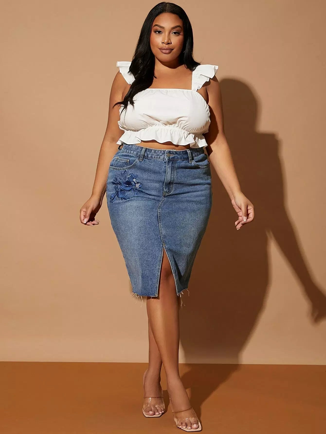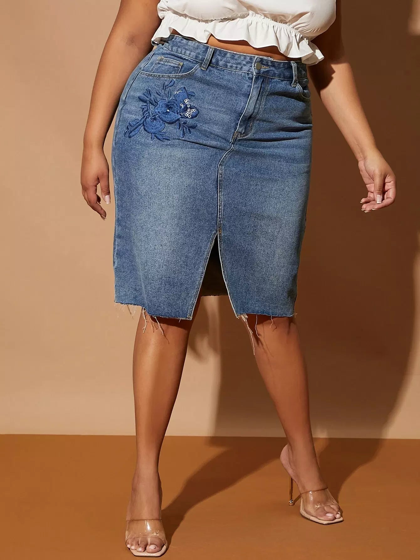 Plus High Waist Flower Embroidered Slit Denim Skirt