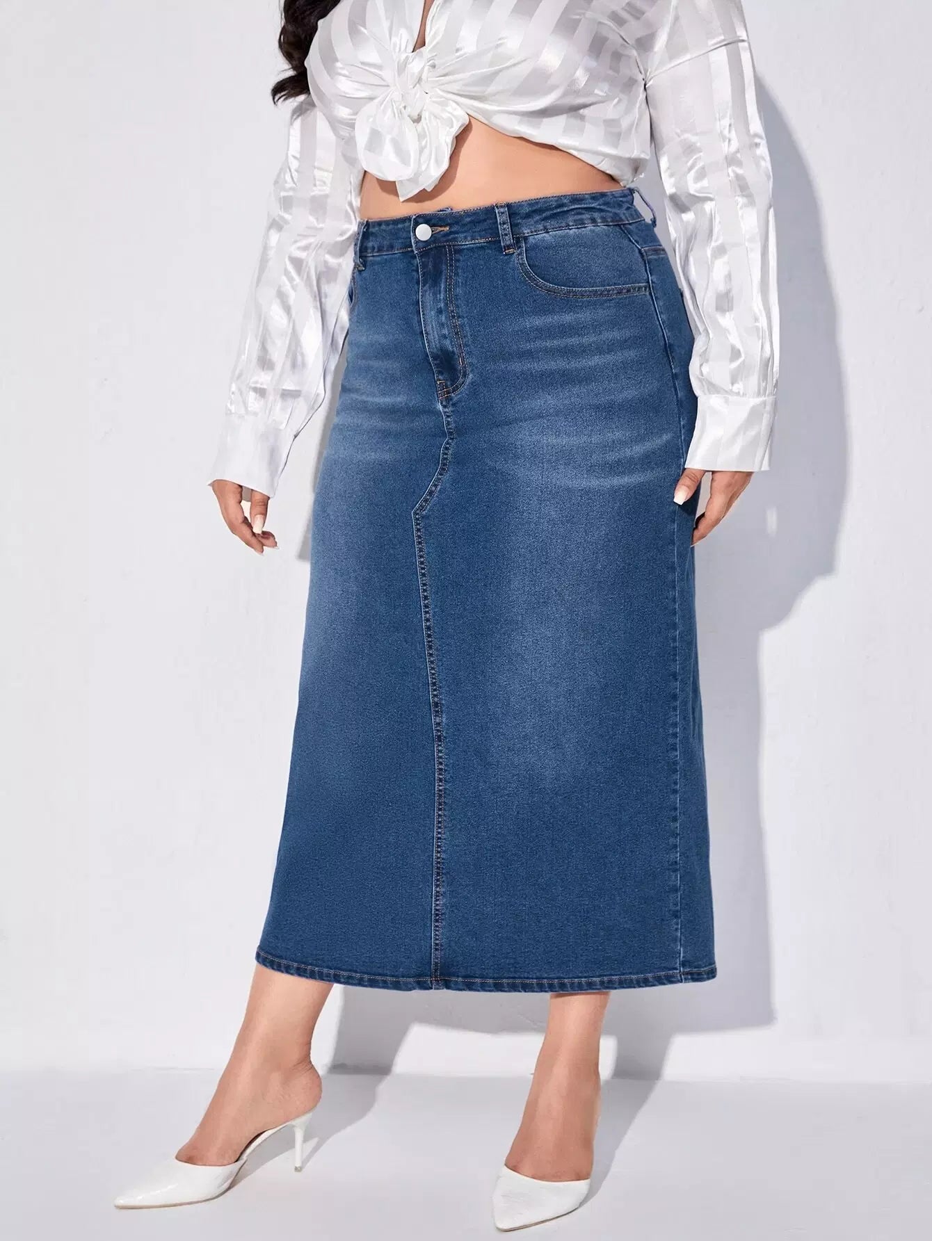 Plus High Waist Slit Back Denim Skirt