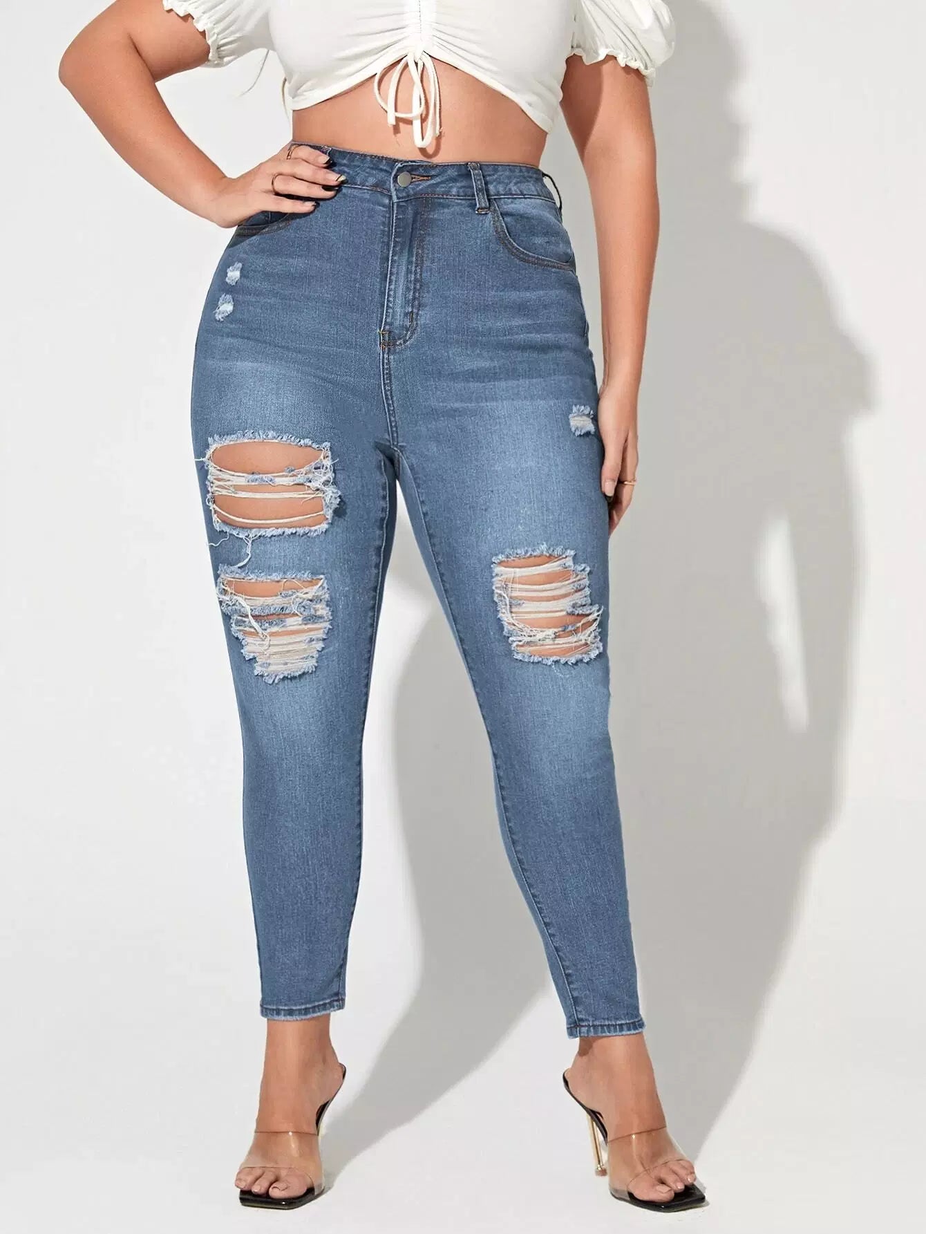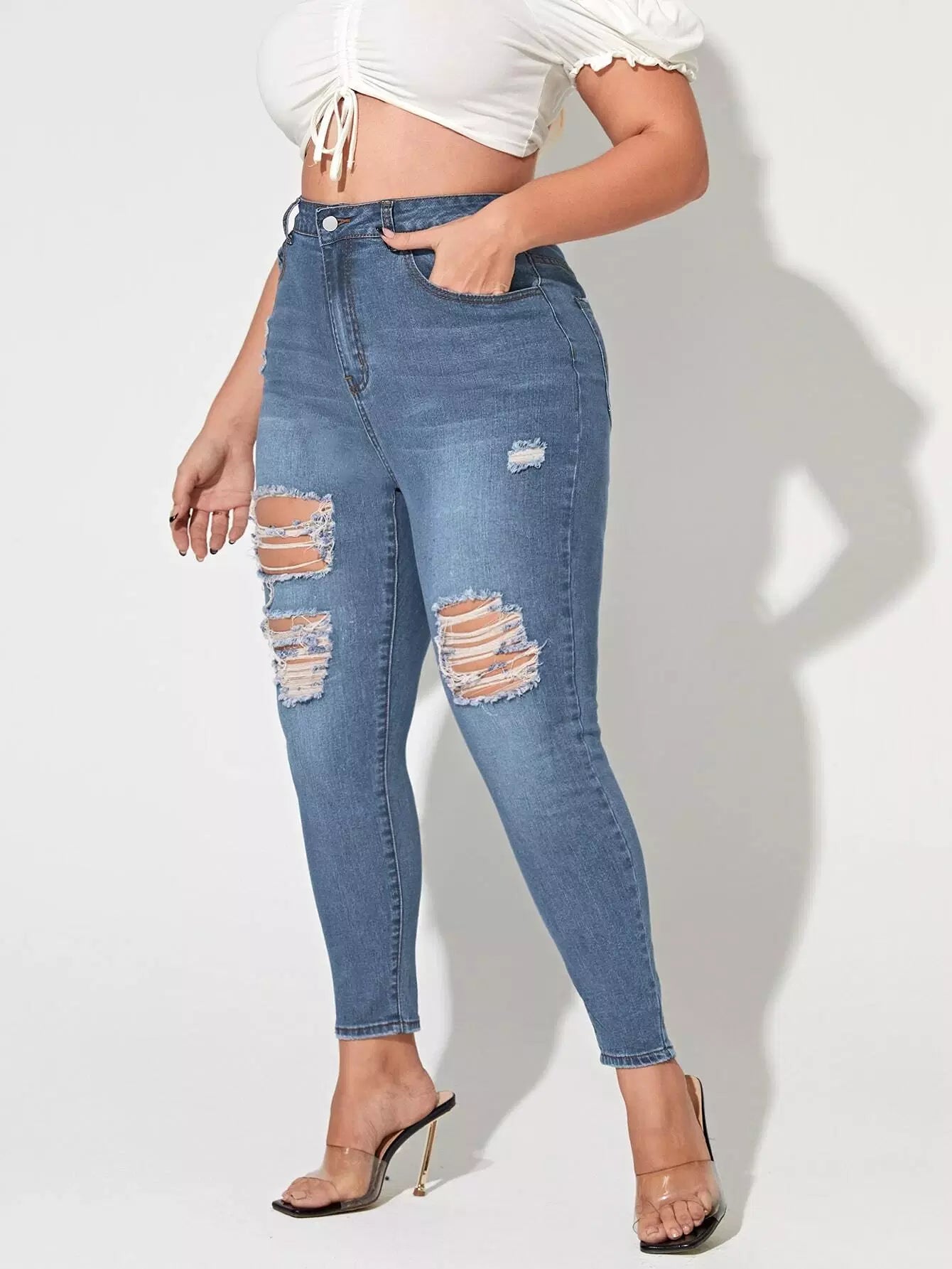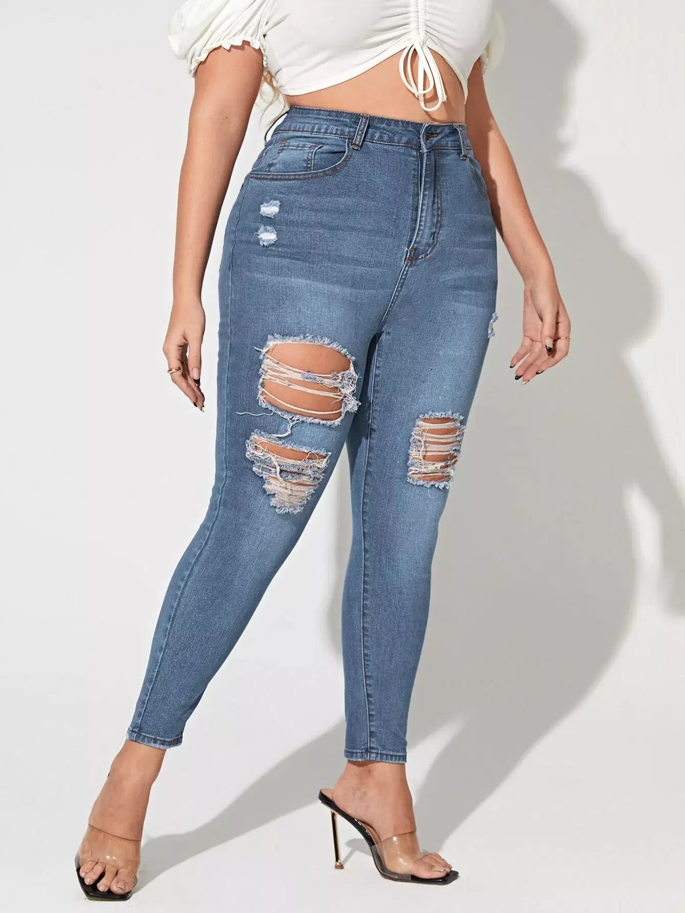 Plus 1pc High Waist Bleach Wash Ripped Frayed Skinny Jeans