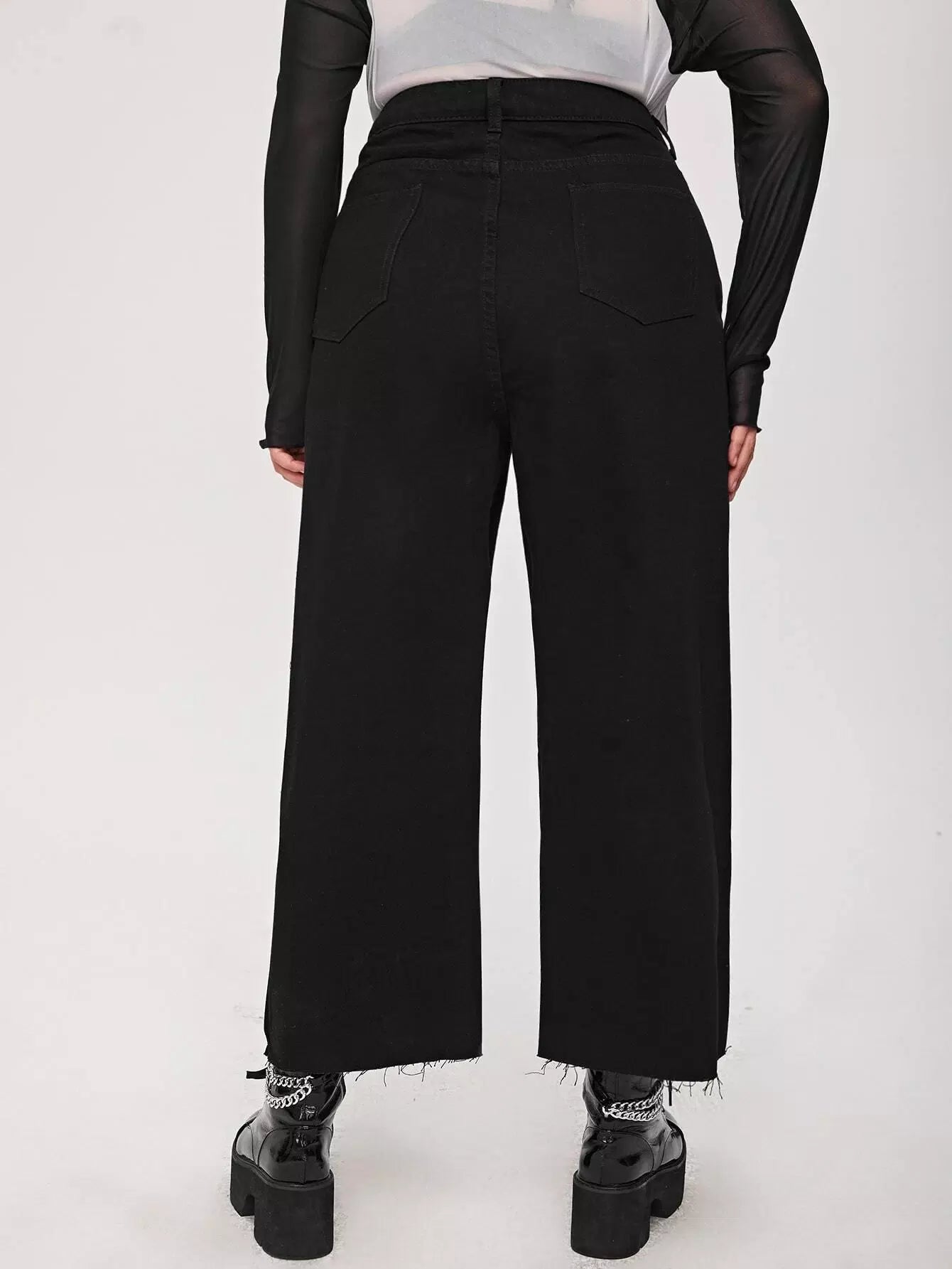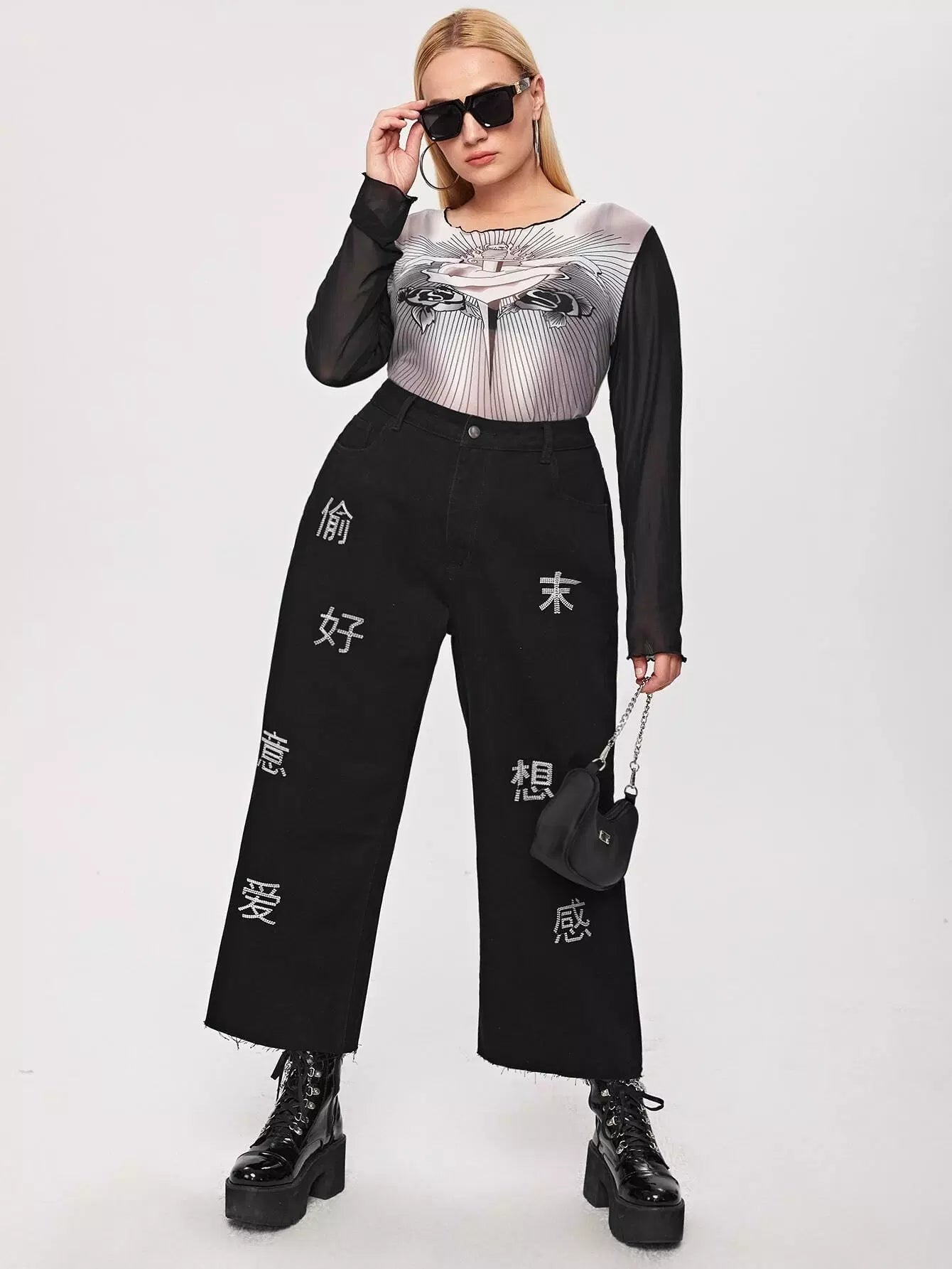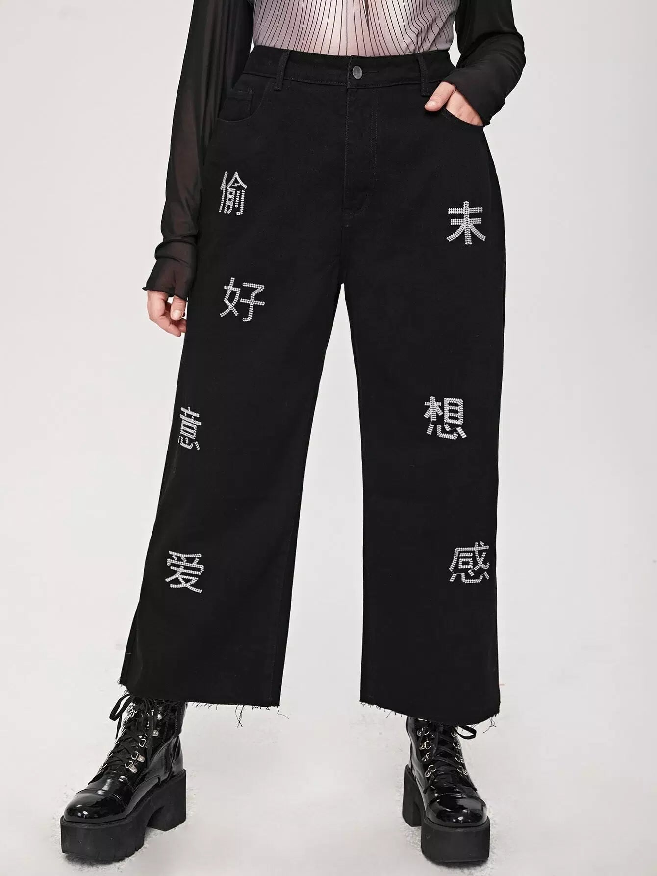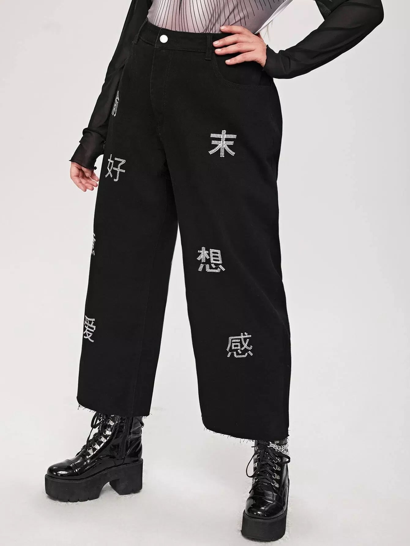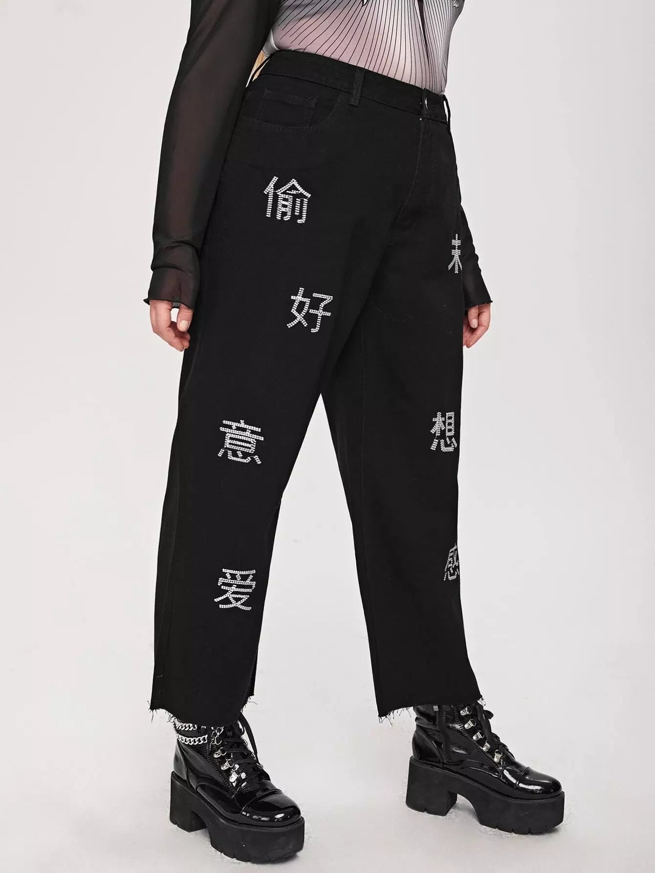 Plus Chinese Letter Graphic Rhinestone Detail Jeans