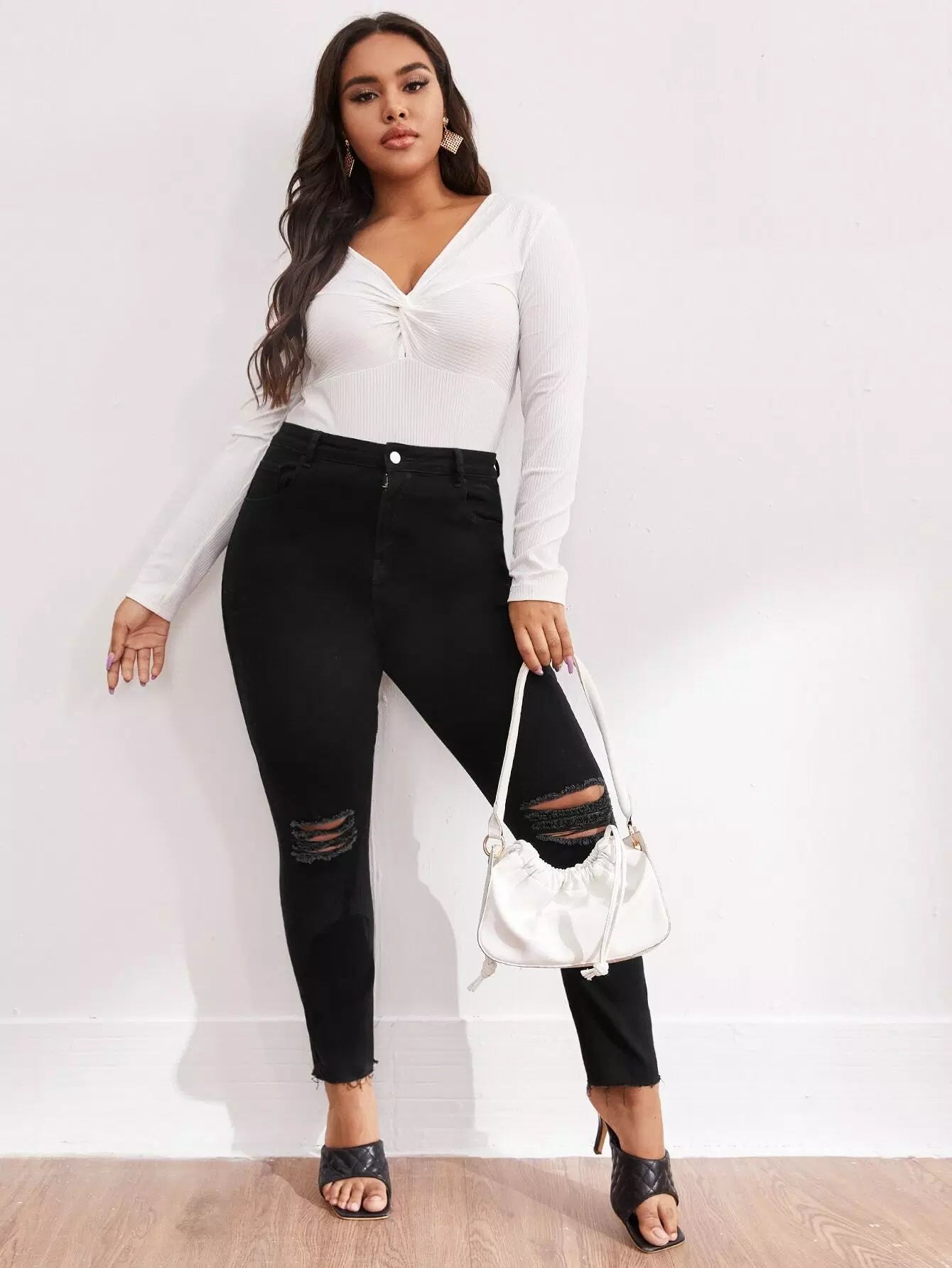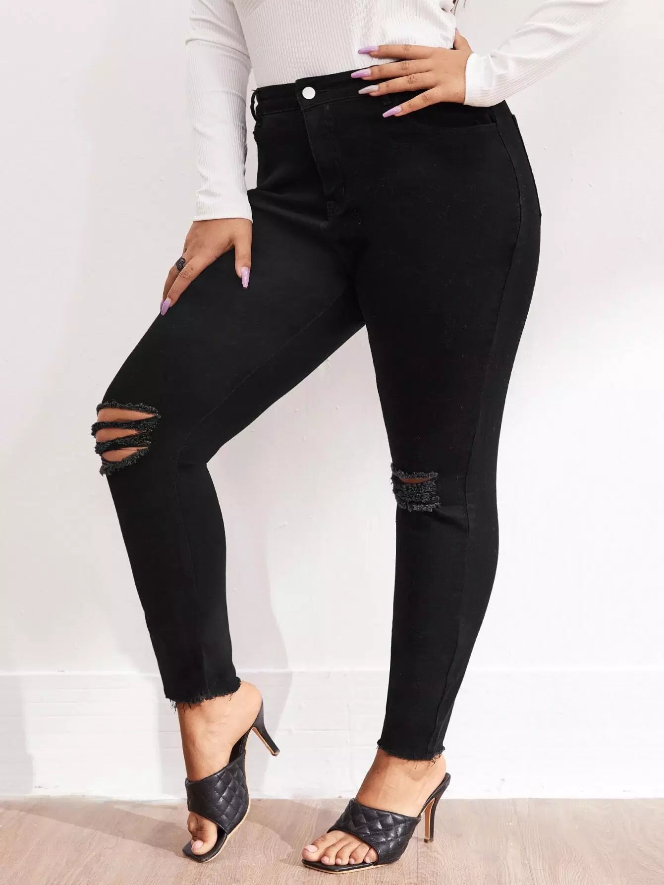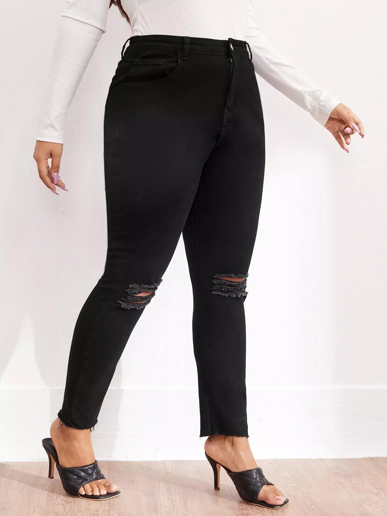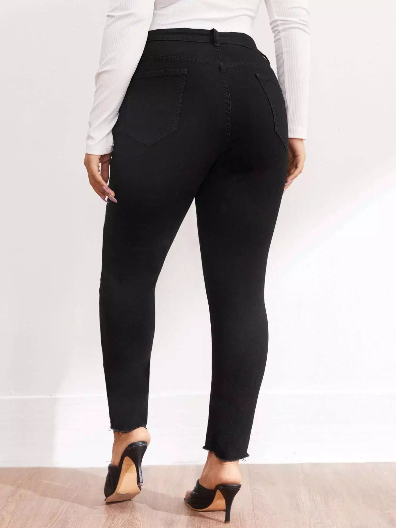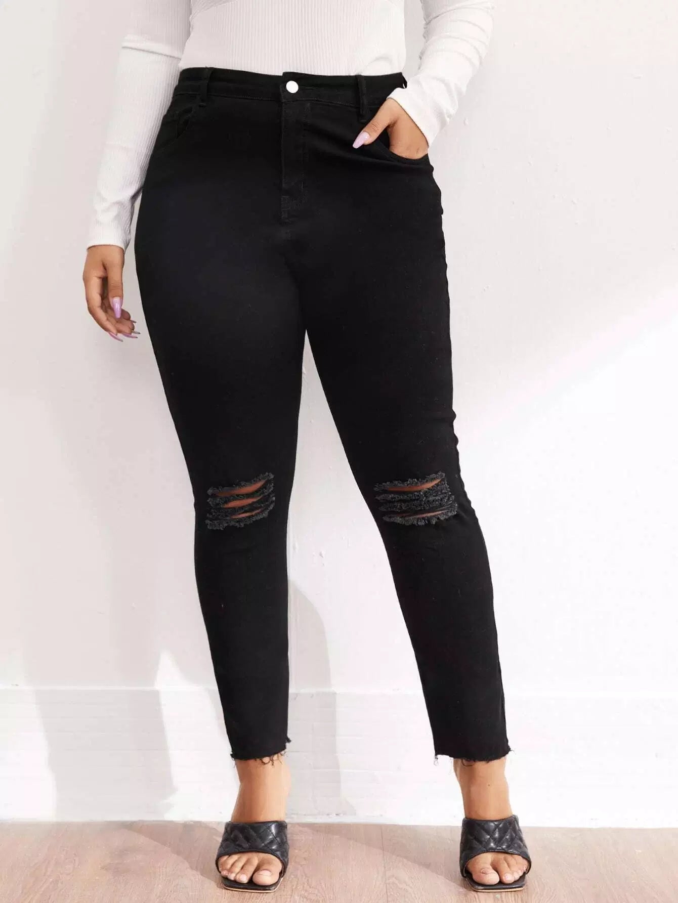 Plus Slant Pocket Raw Hem Ripped Jeans