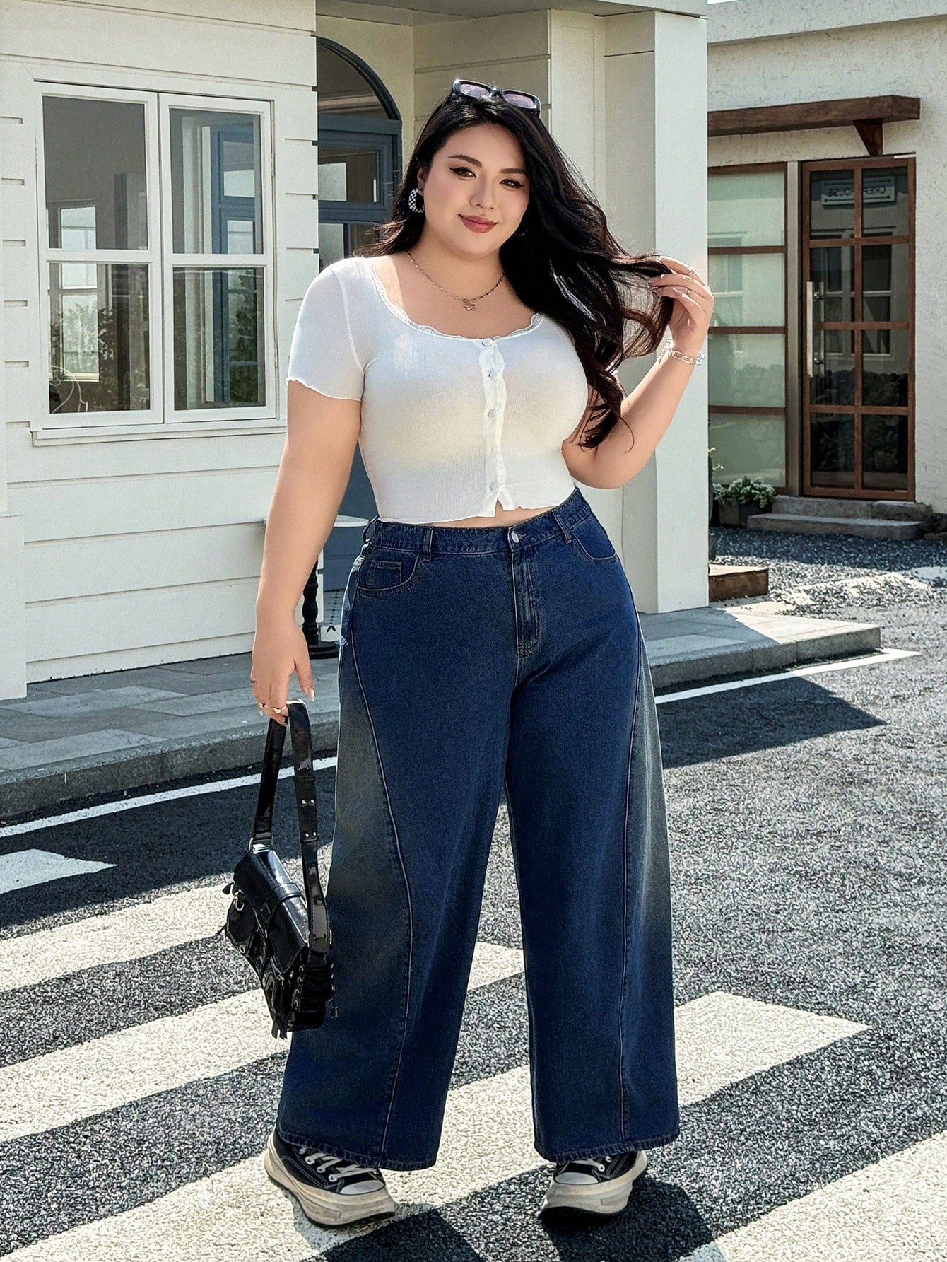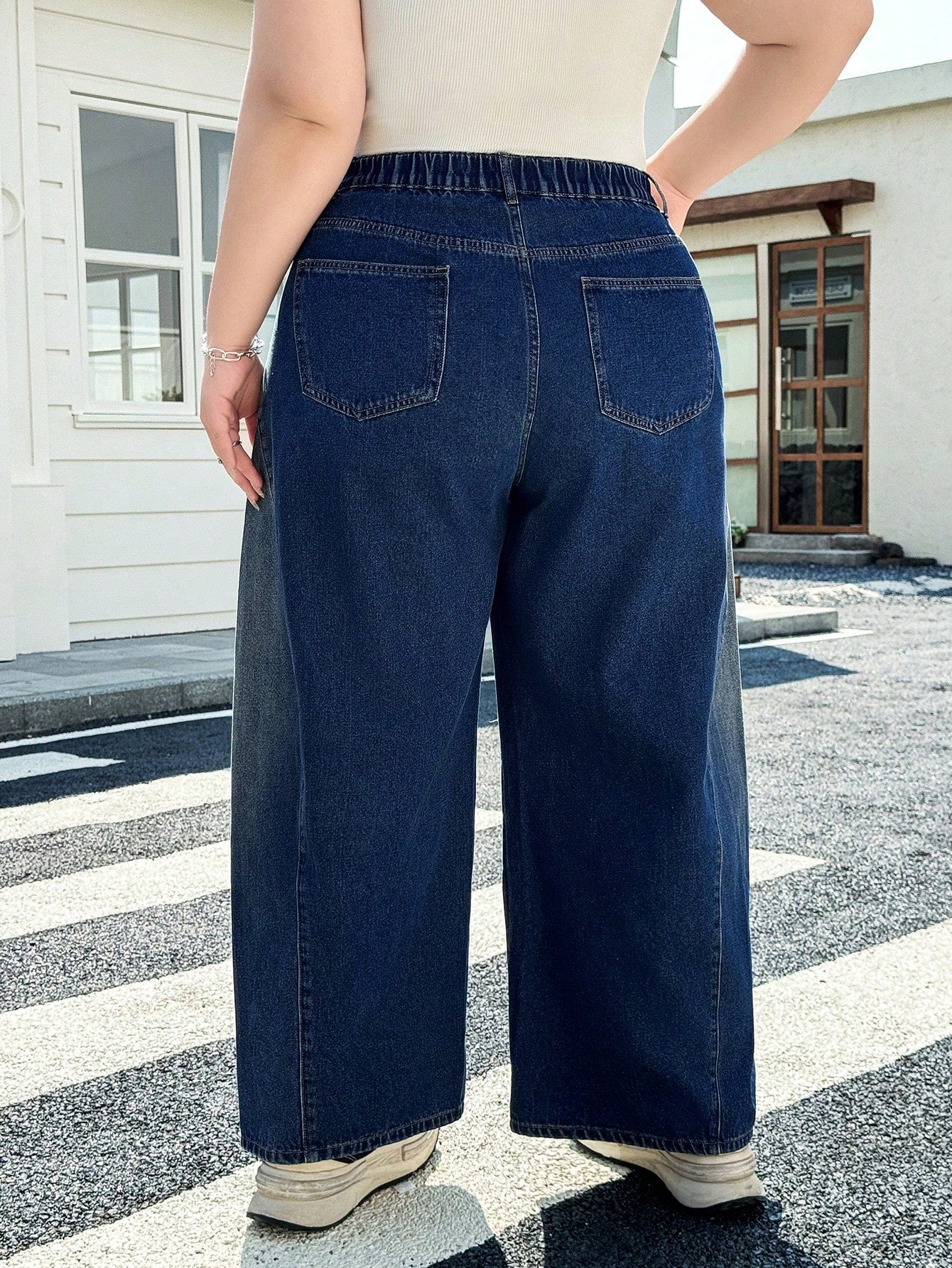 SHEIN EZwear Plus Size Women Retro Washed Denim Blue Banana Leg Jeans For Summer