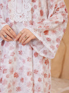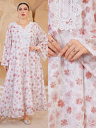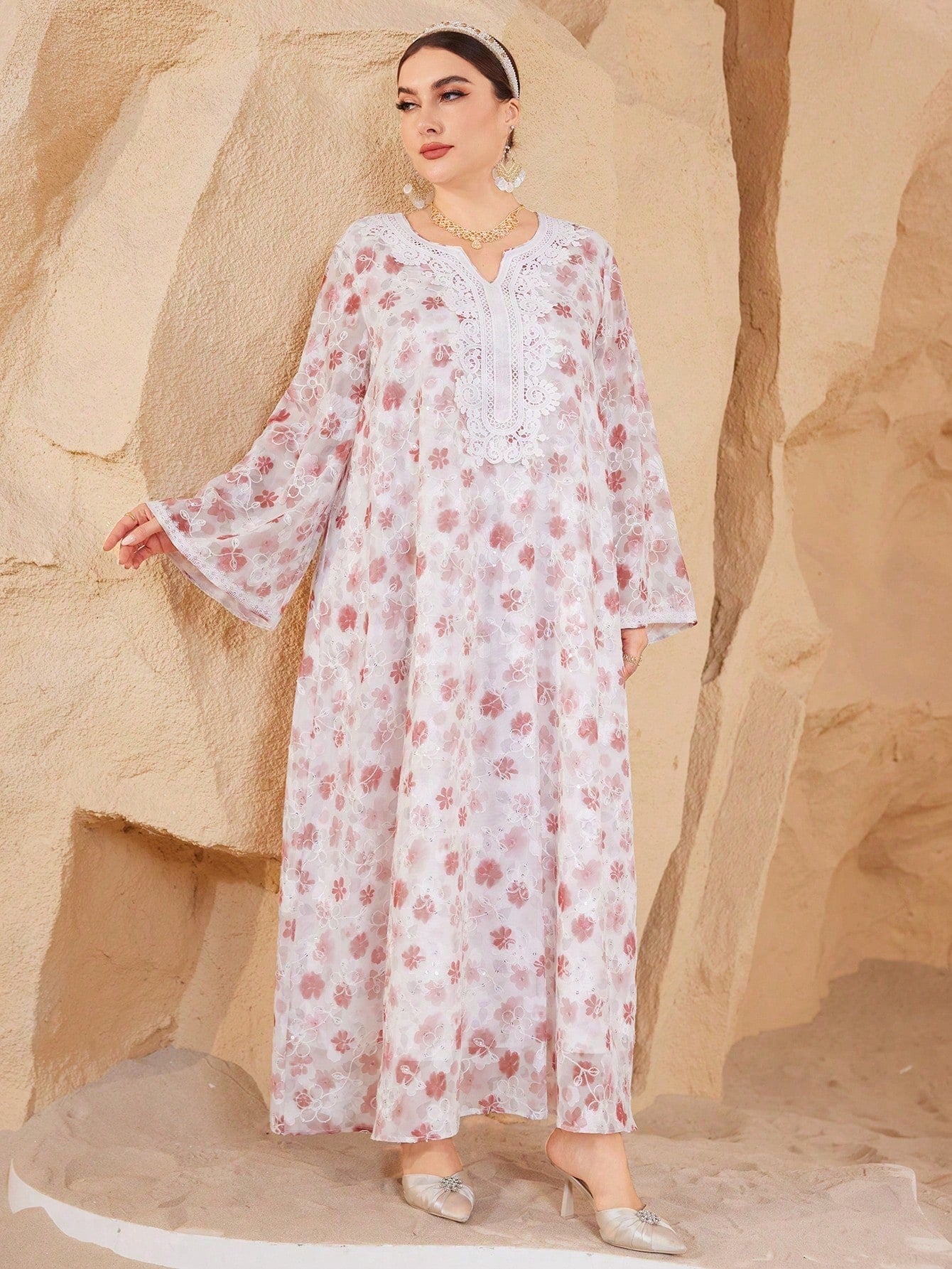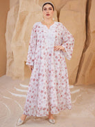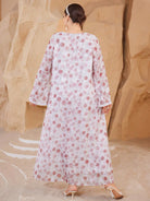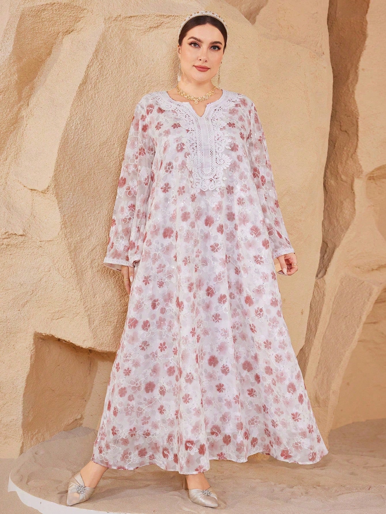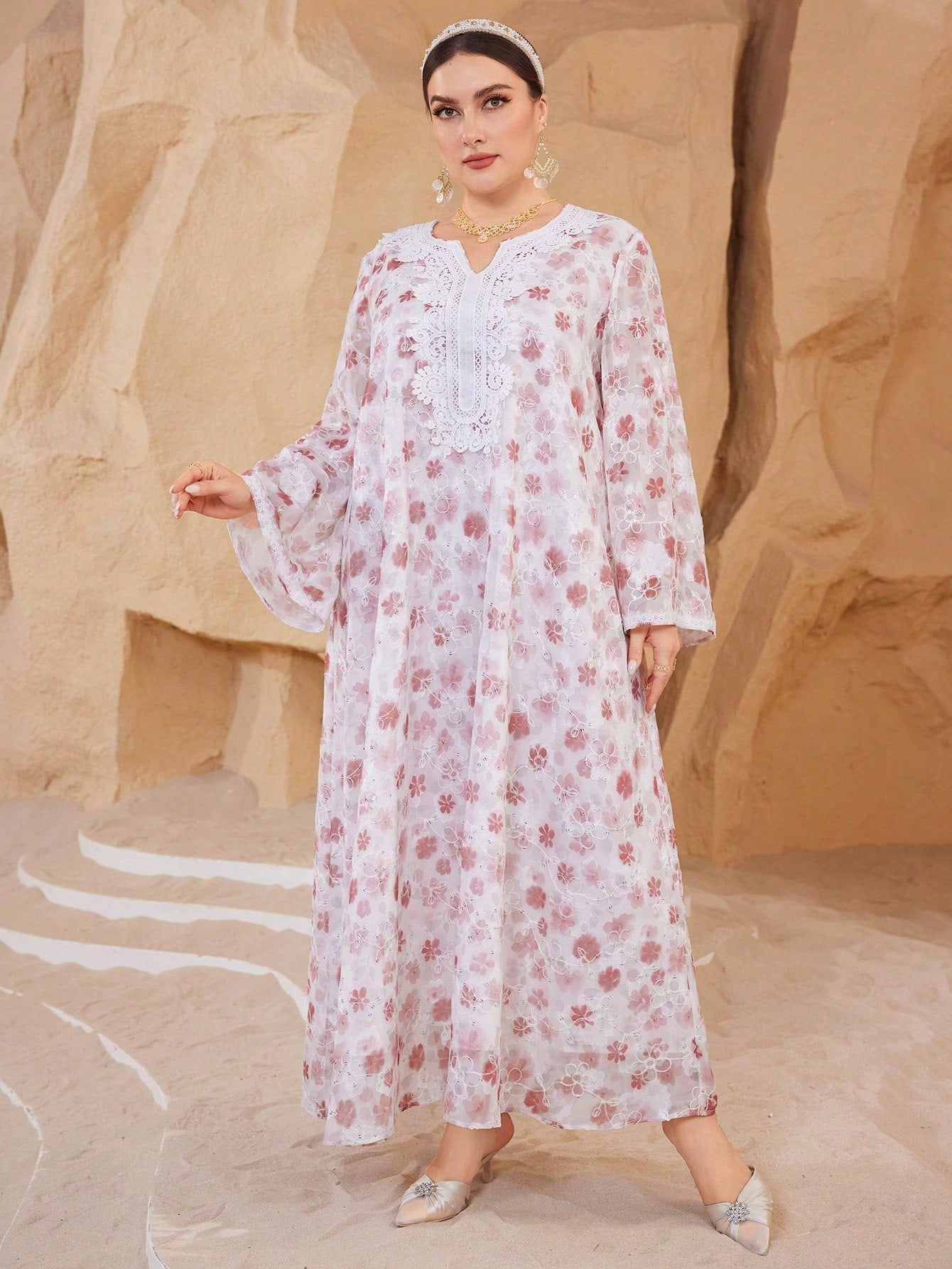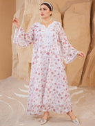 Al Najma Women's Round Neck Long Sleeve Chiffon Floral Print Cutwork Embroidery Loose Romantic Elegant Plus Size Arabic Style Dress