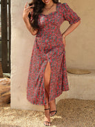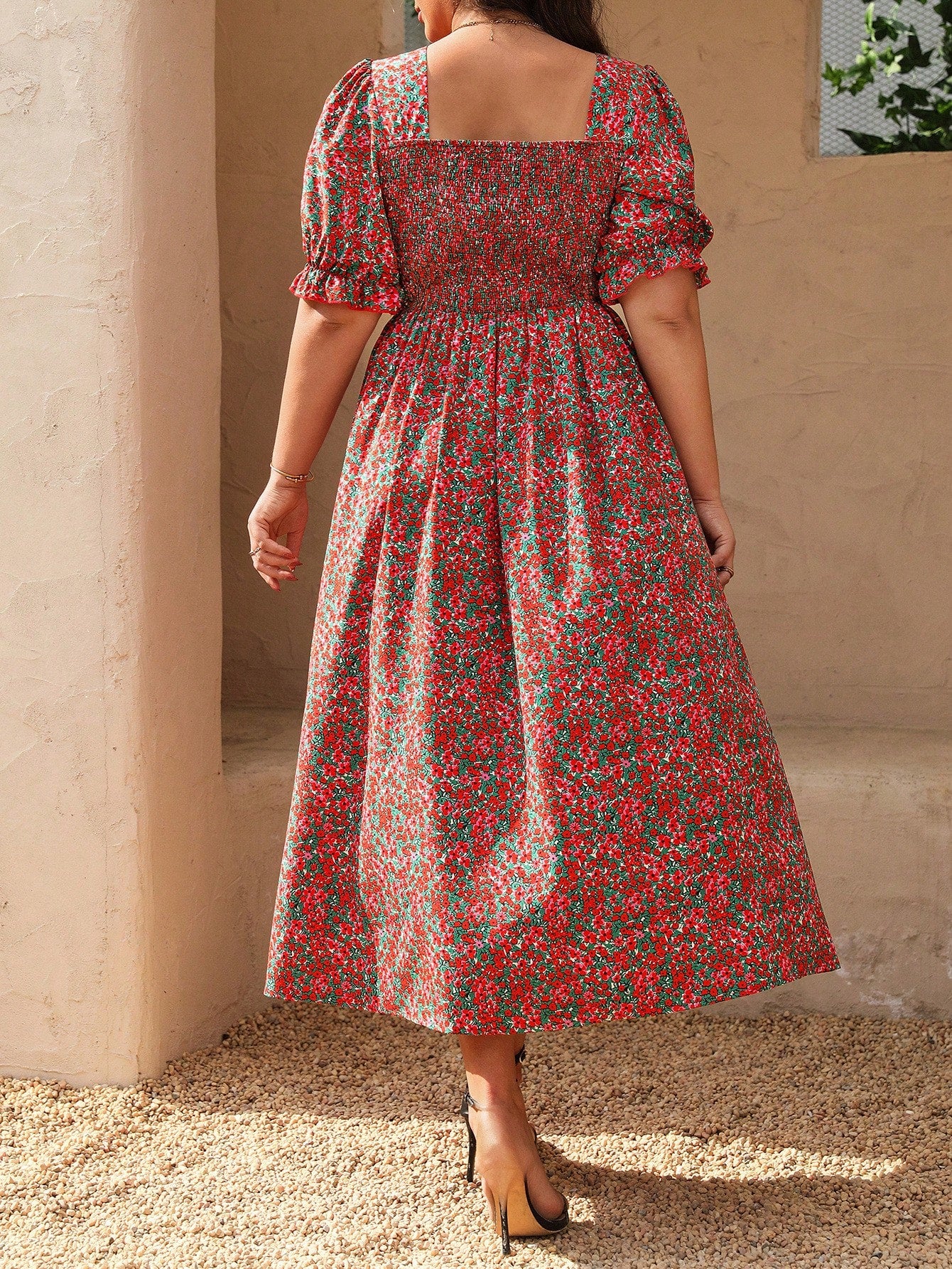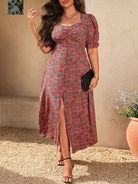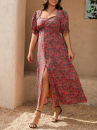 Clasi Curve Plus Size Women's Romantic Casual Daily Red Floral Sweetheart Neck Bubble Short Sleeve Waist