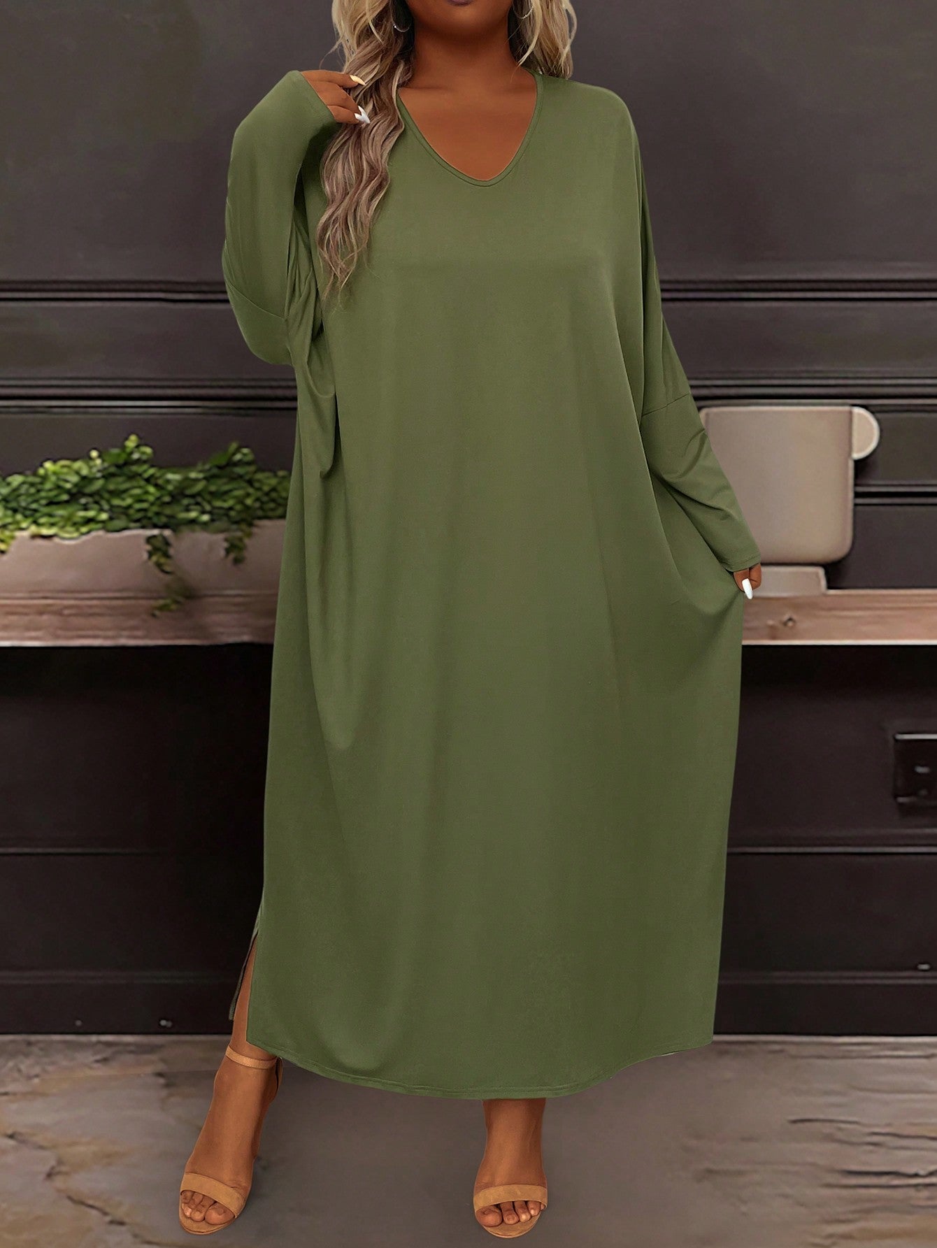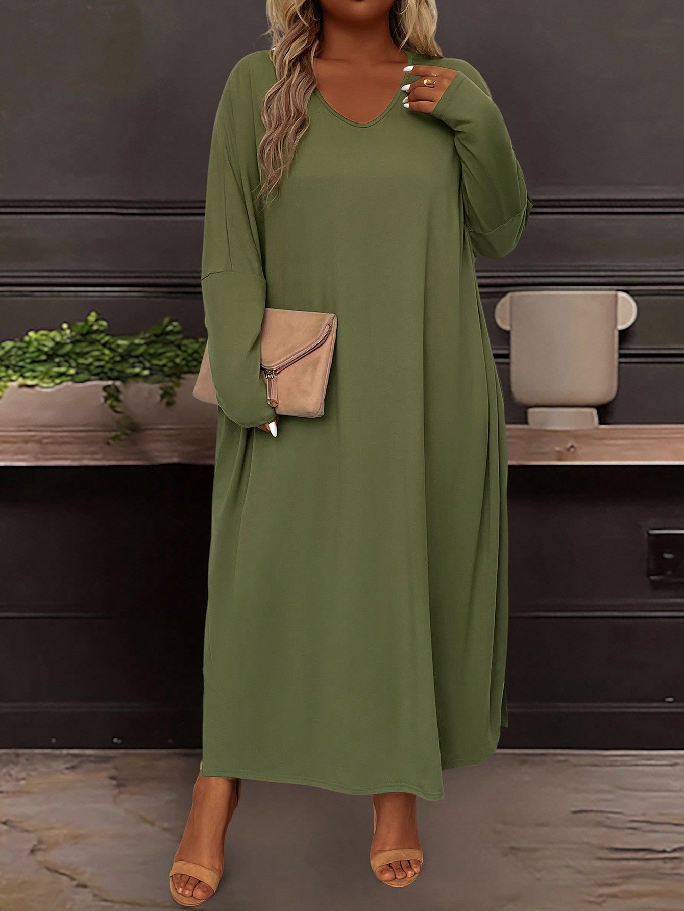 EMERY ROSE Plus Size Women's Solid V-Neck Long Sleeve Casual Loose Dress