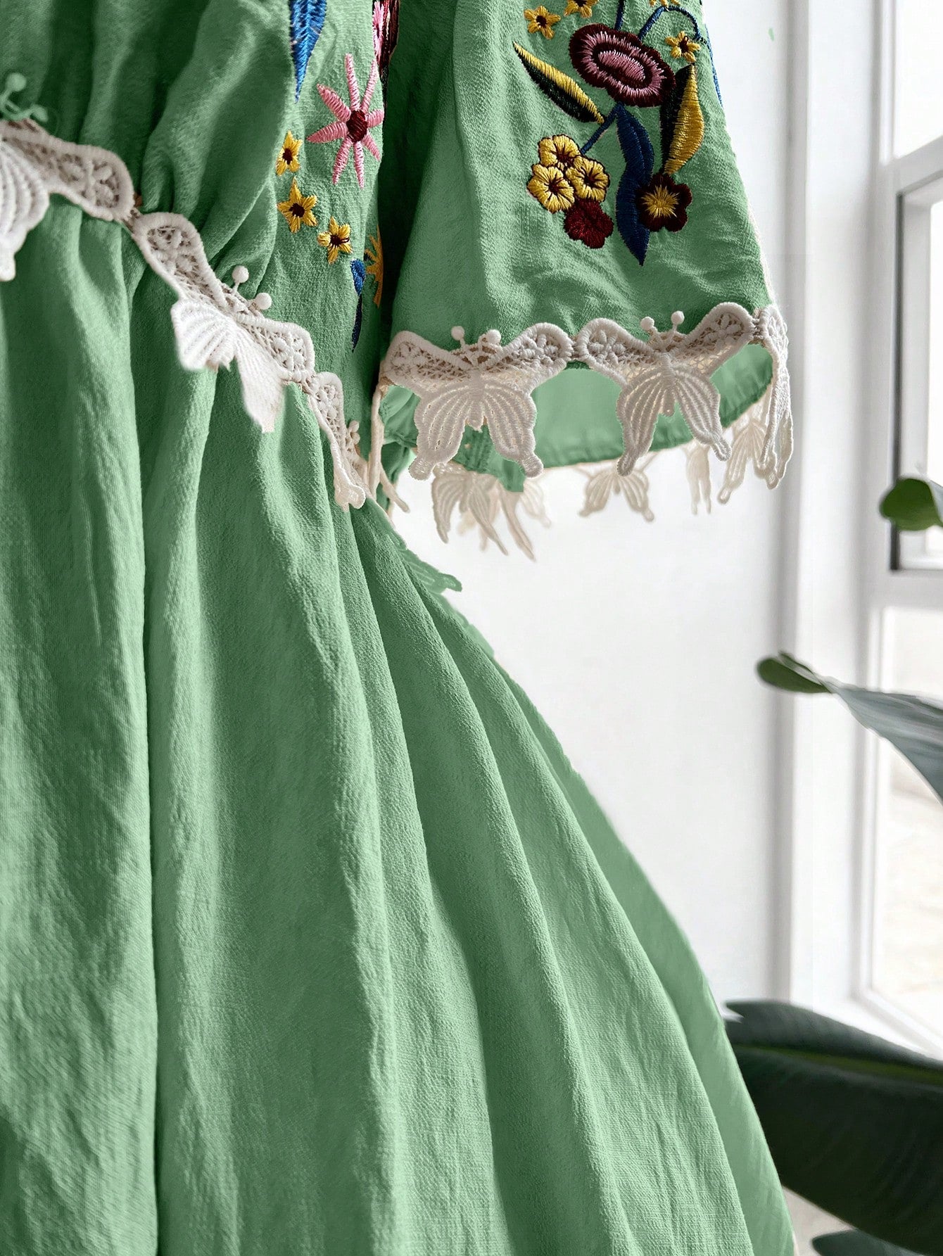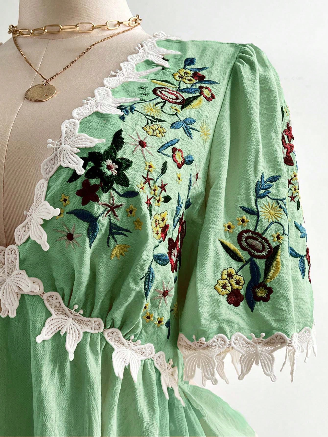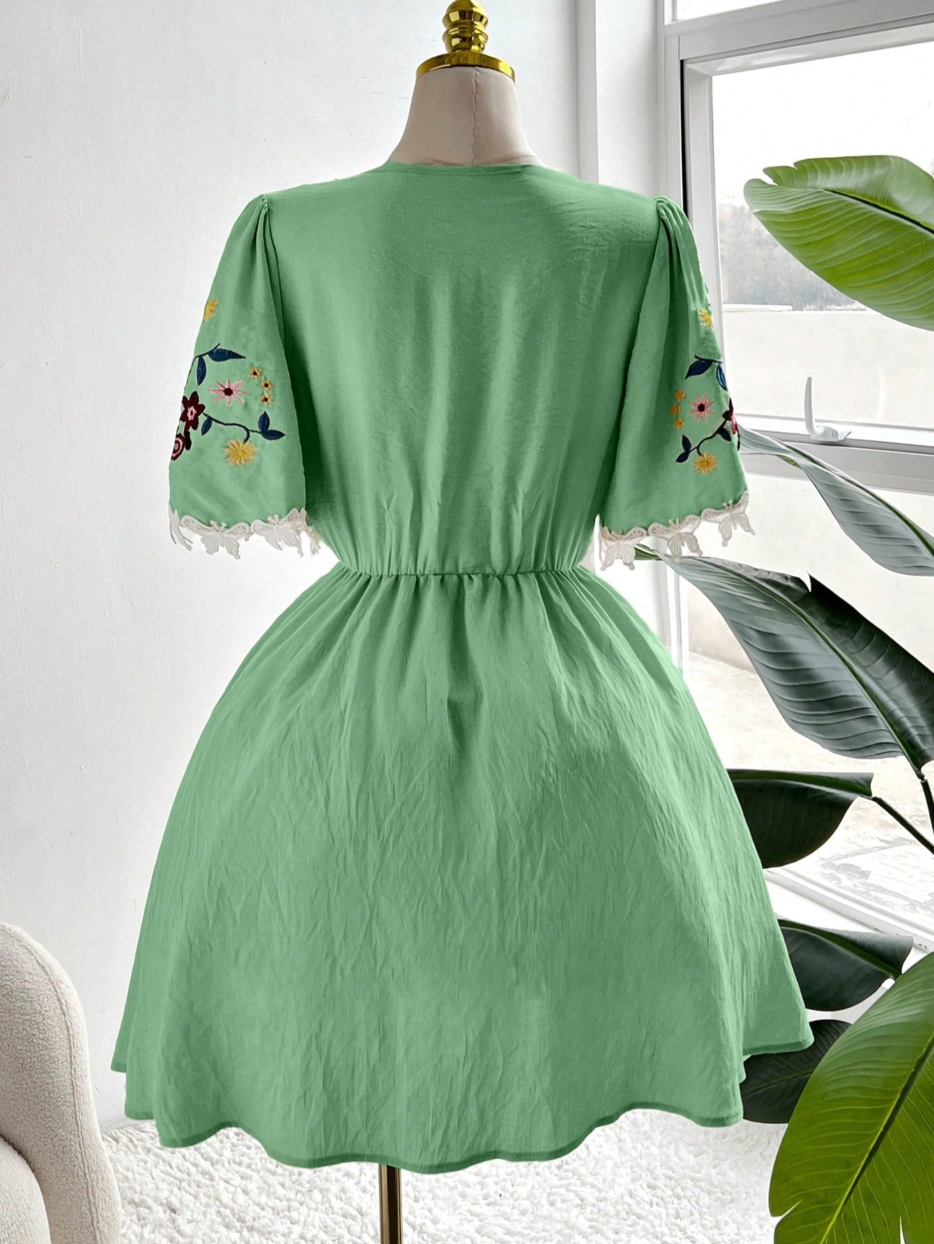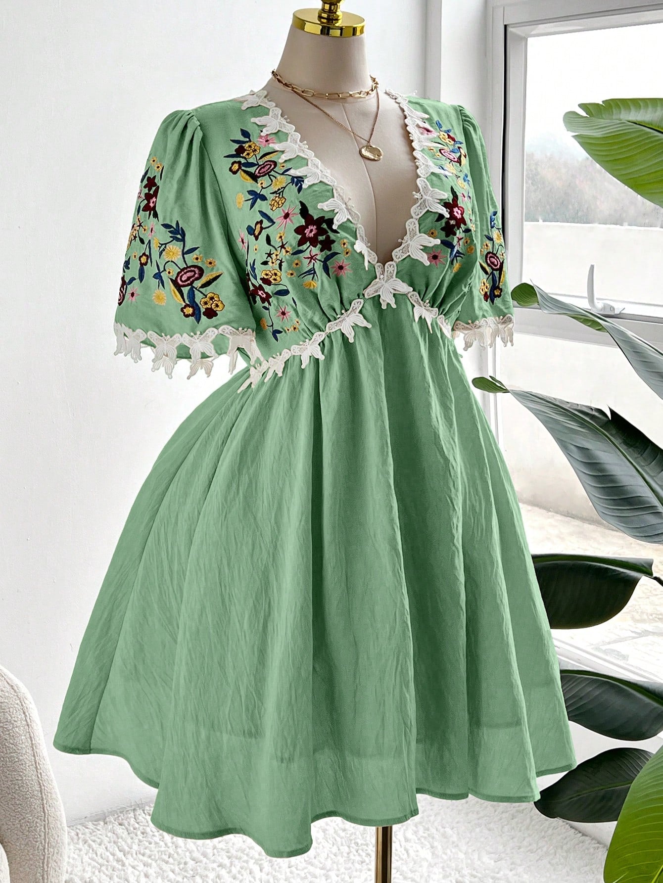 Flirla Plus Size Woven Elegant Casual Embroidered V-Neck Ruffle Hem Dress