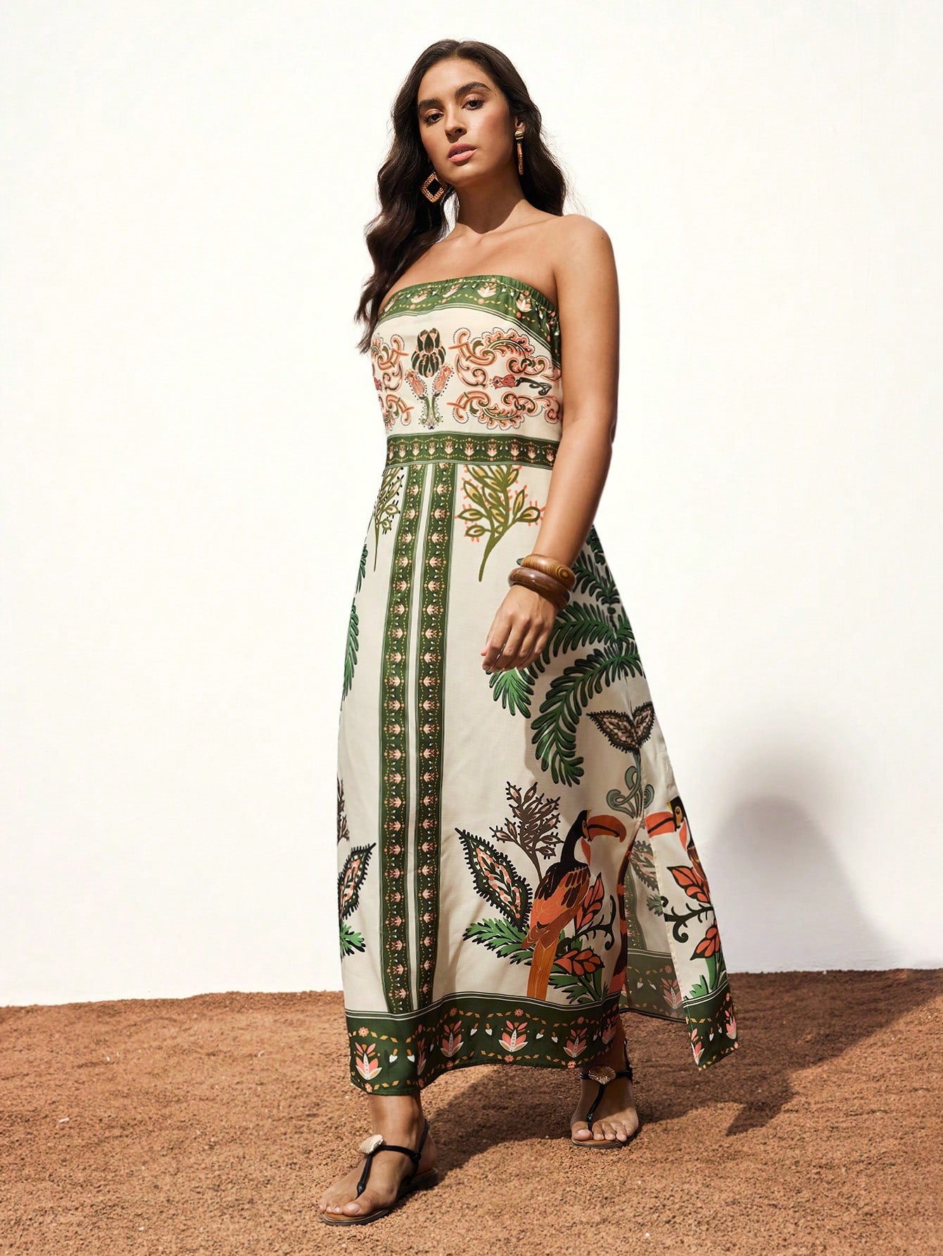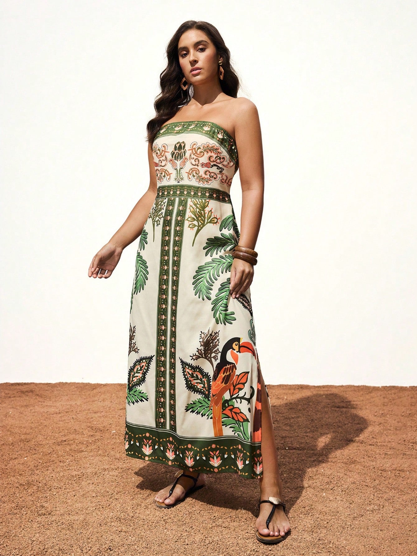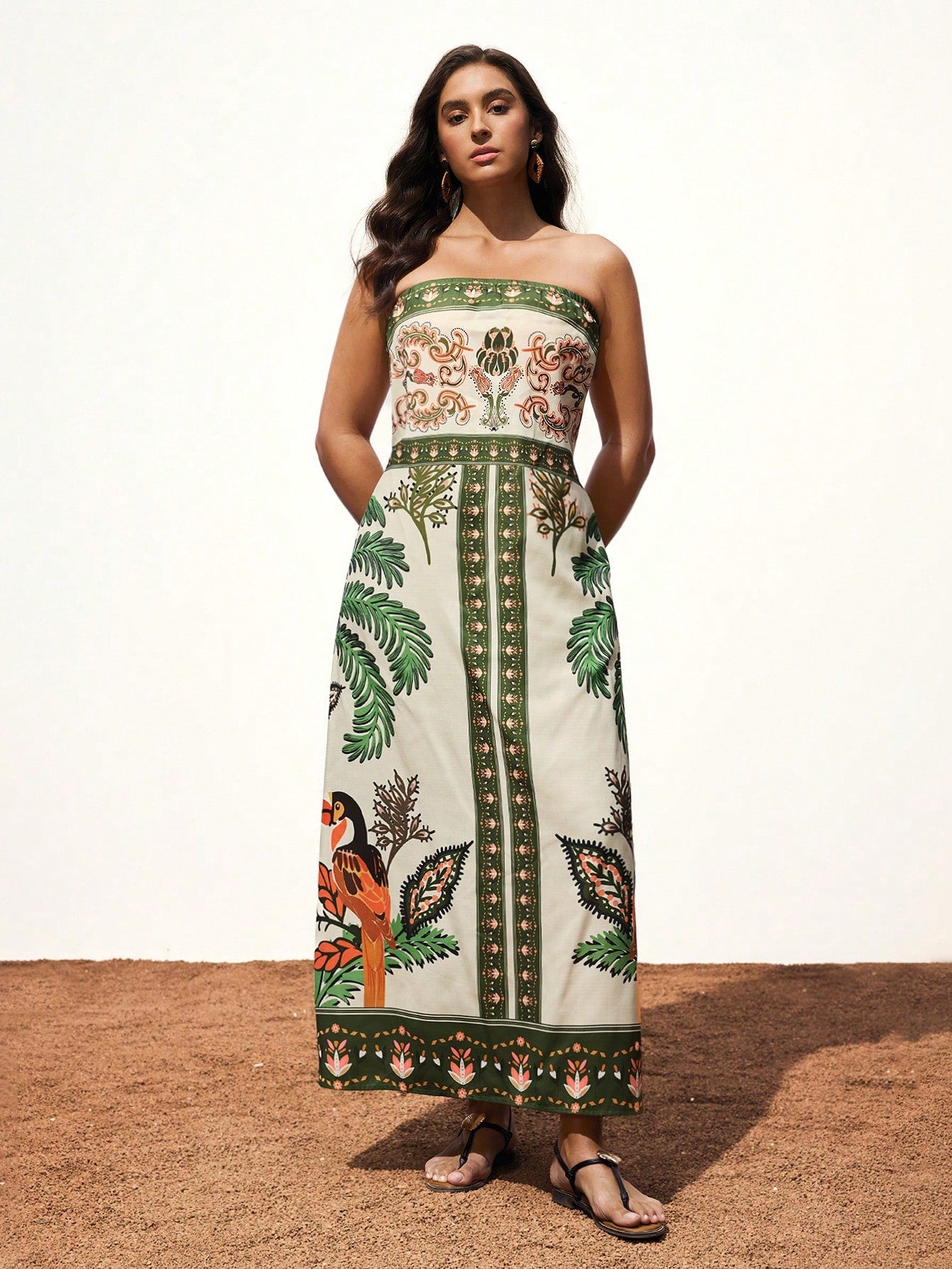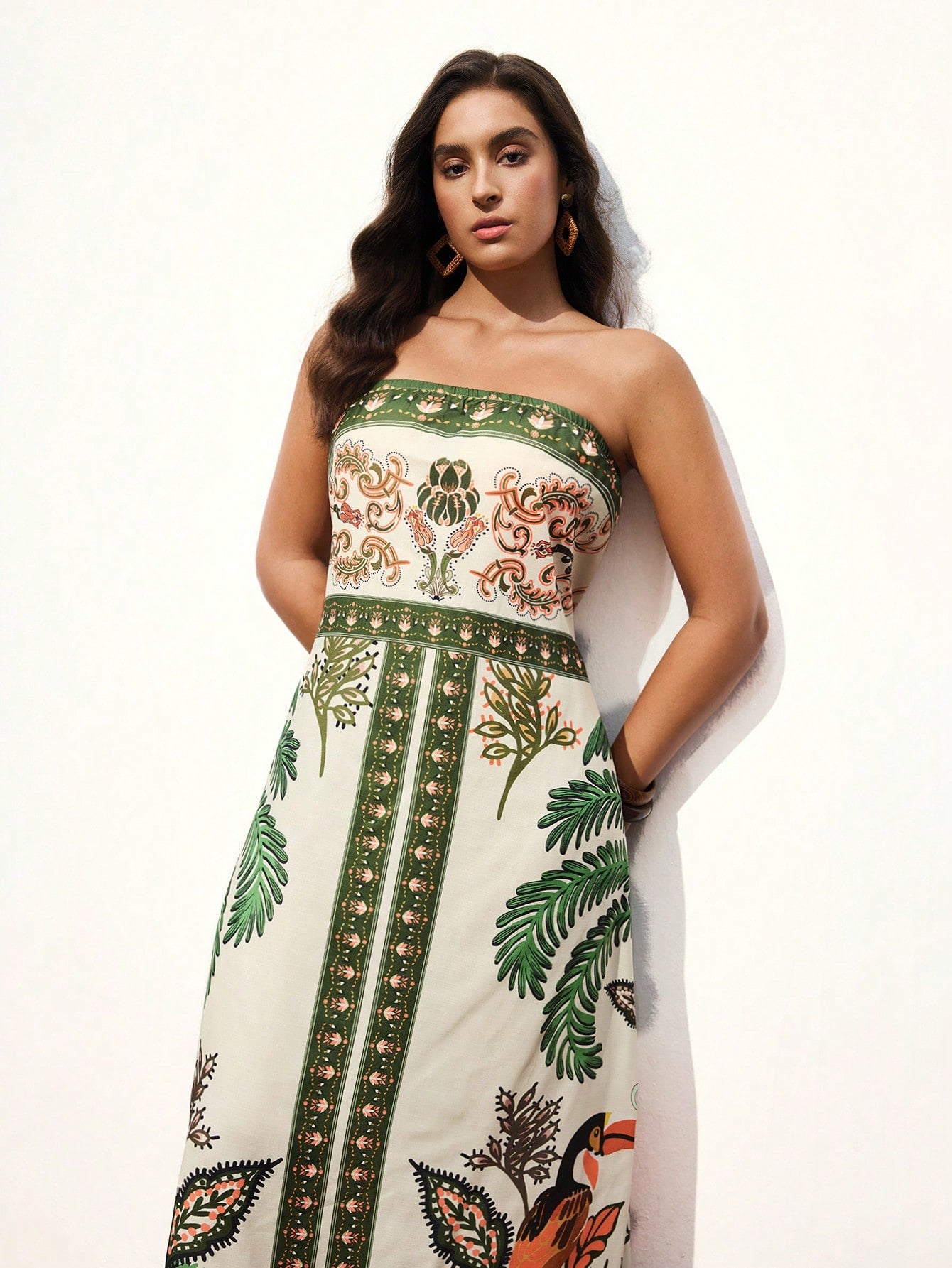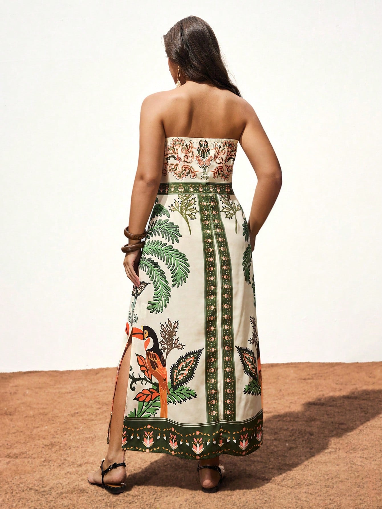 Maija Plus Size Women's Tropical Floral Print Bandeau Maxi Dress, Elegant Holiday Style