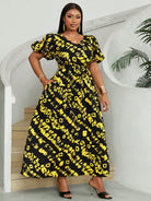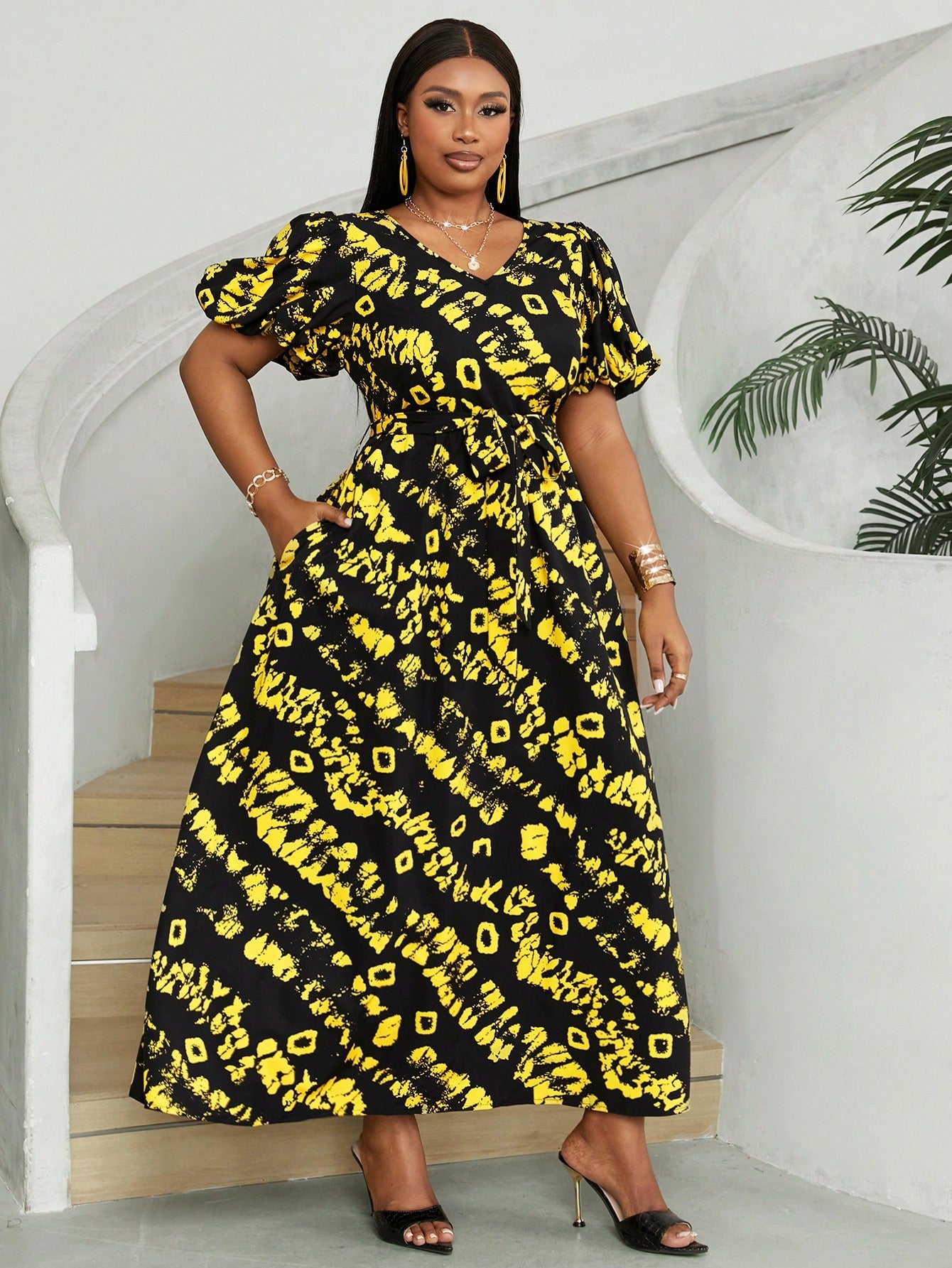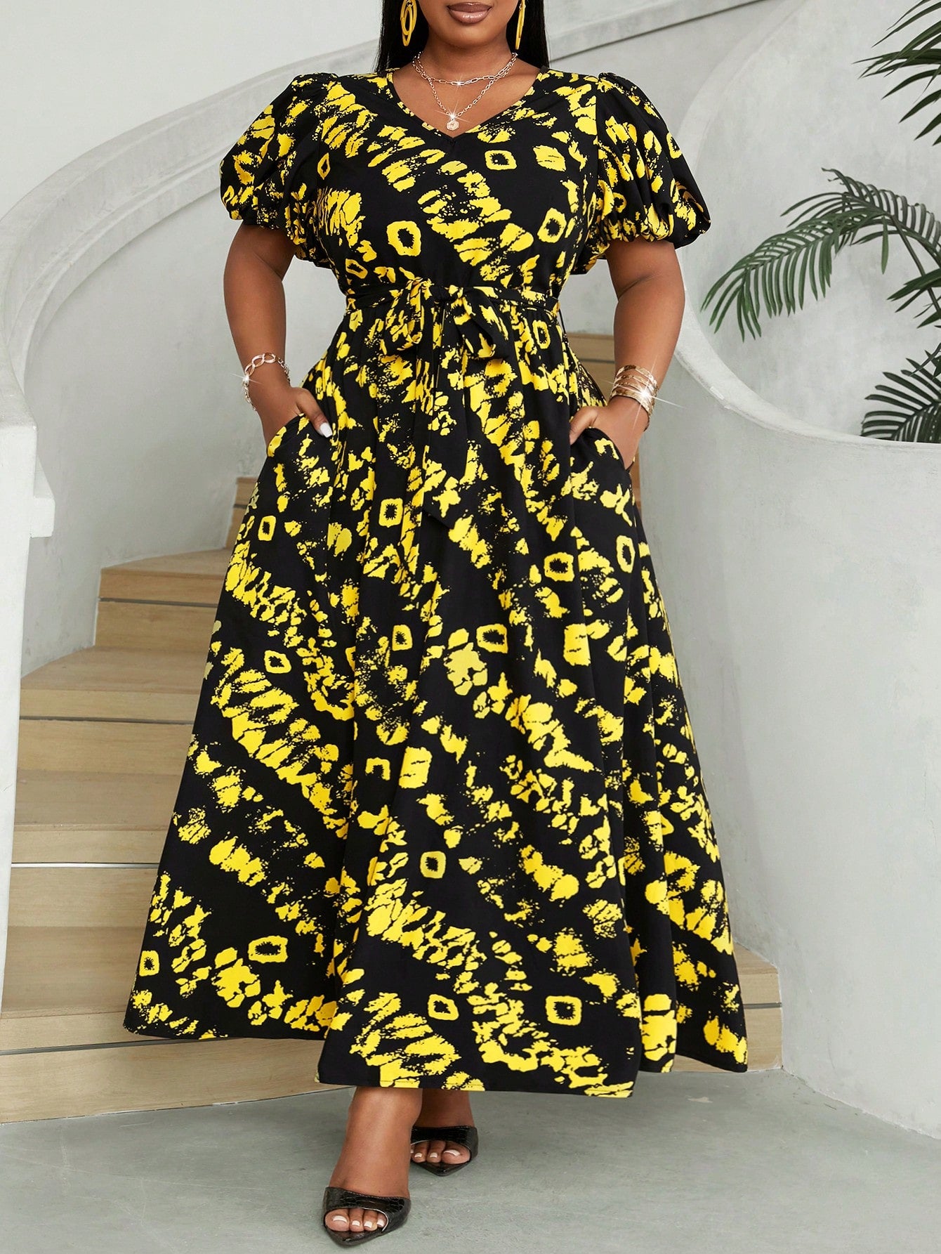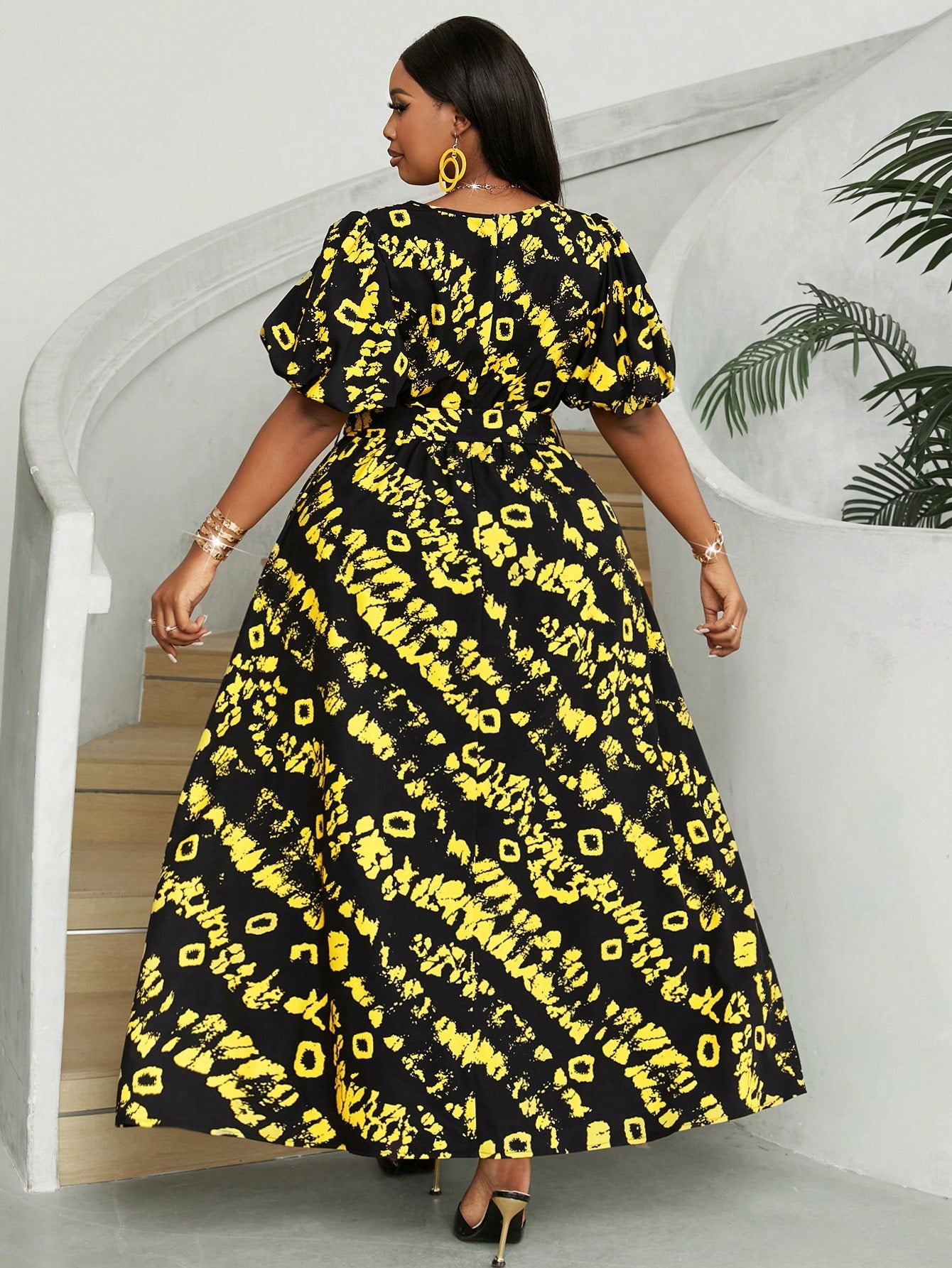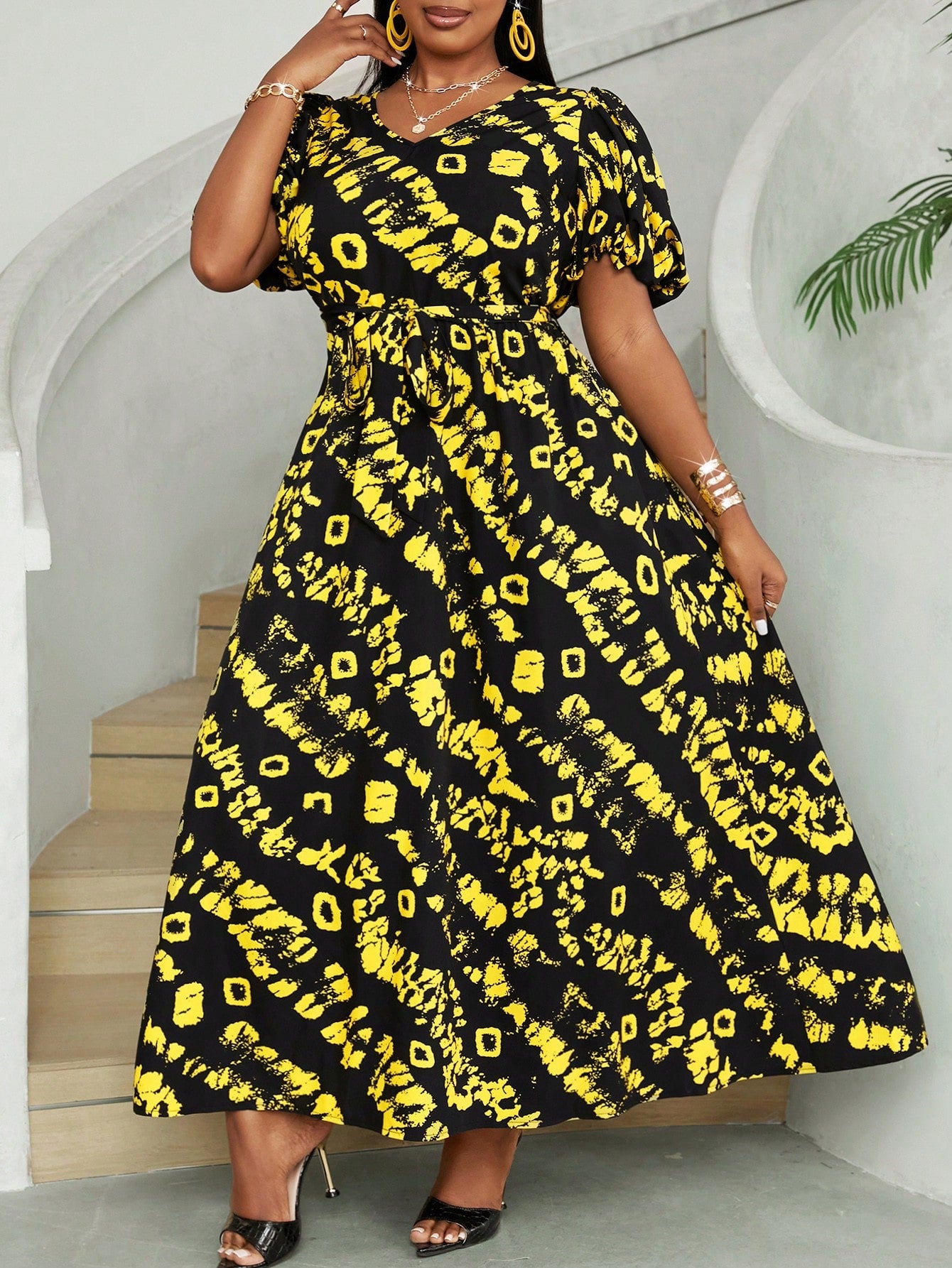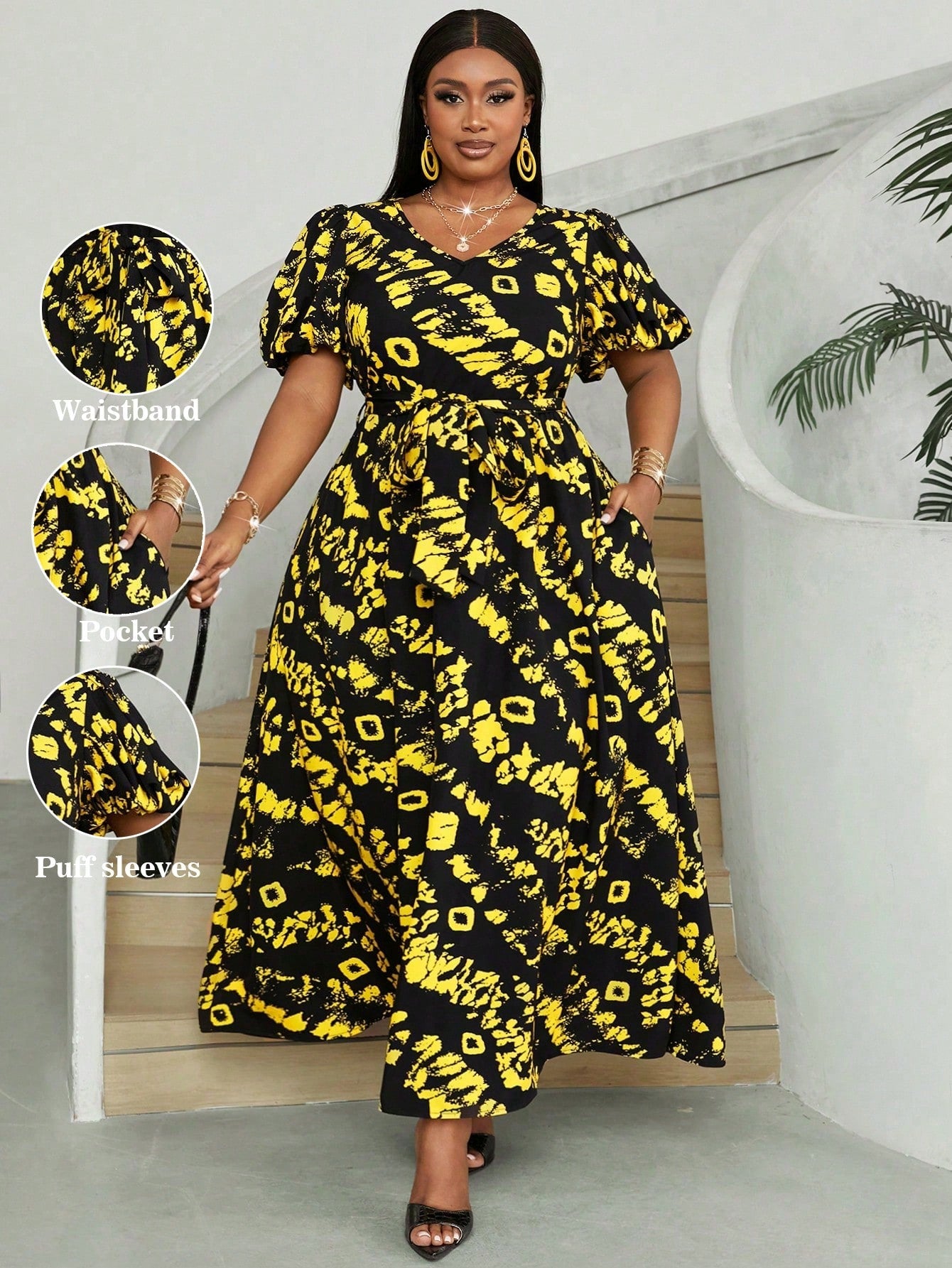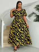 Maweii Plus Size V-Neck Short Sleeve Puff Sleeve Waist Shirring Allover Print Loose Fit Dress With Flare