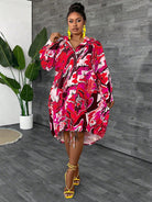 Maweii Plus Size Women's All-Over Print Drawstring Waist Button-Front Dress