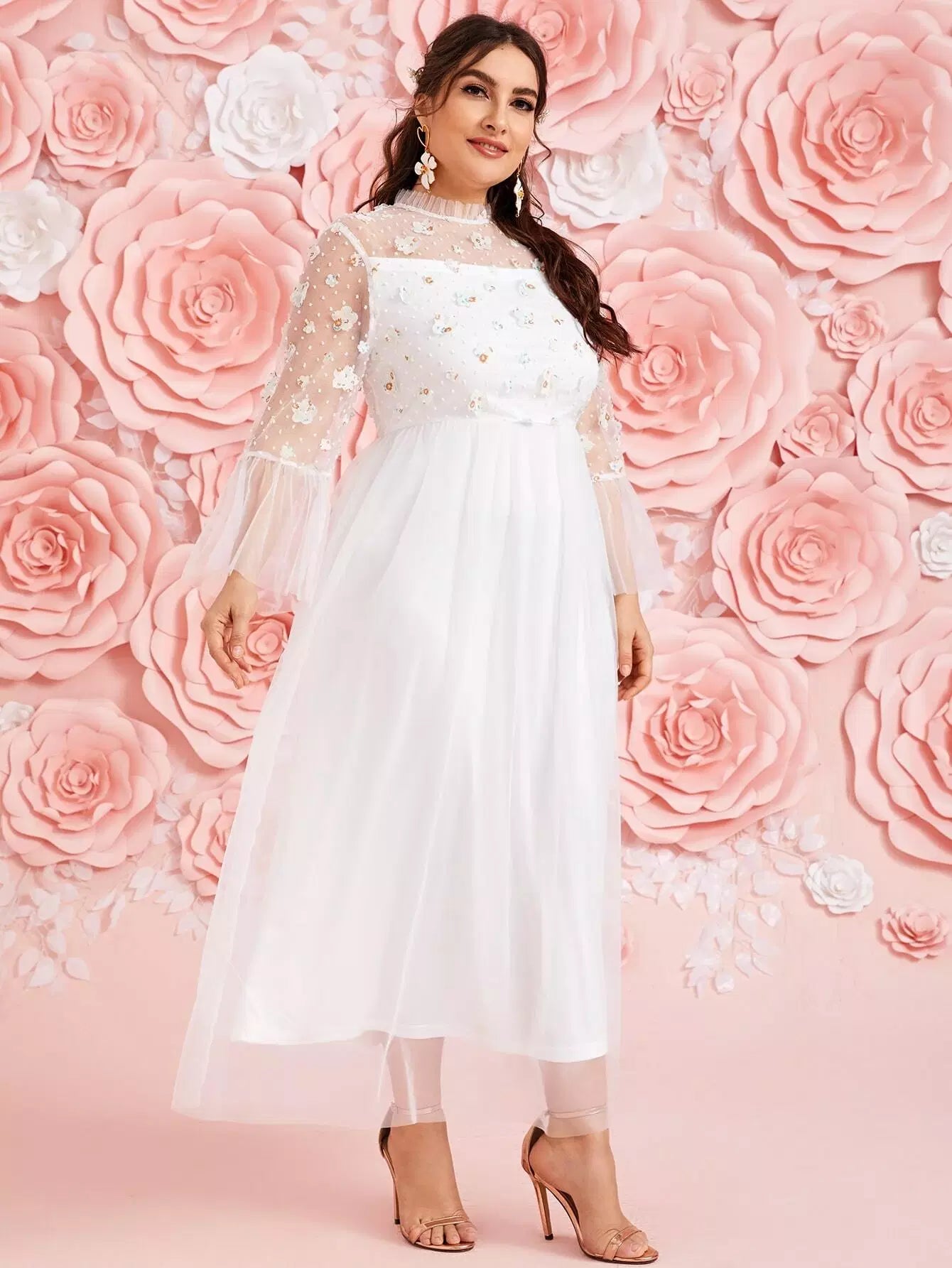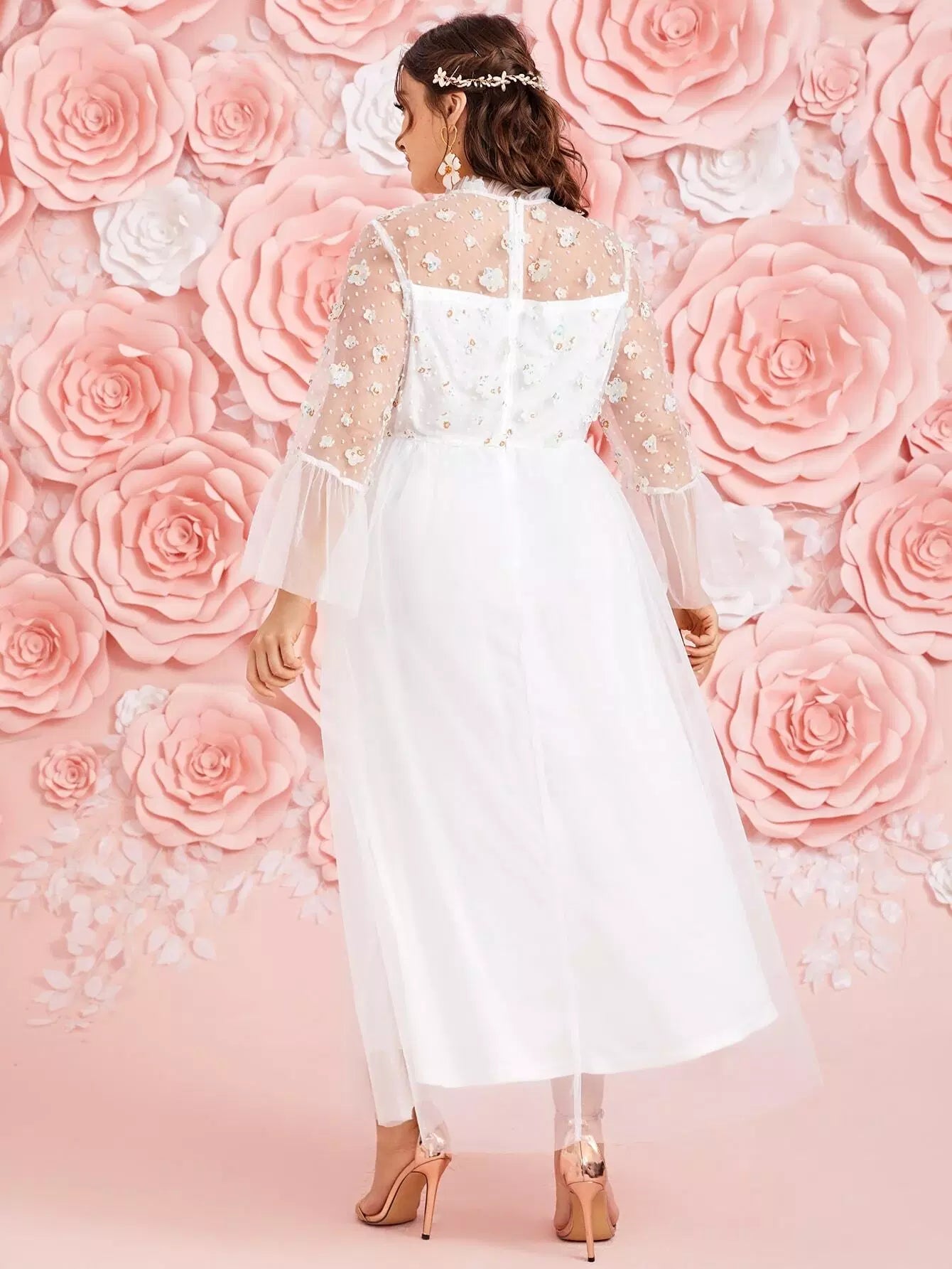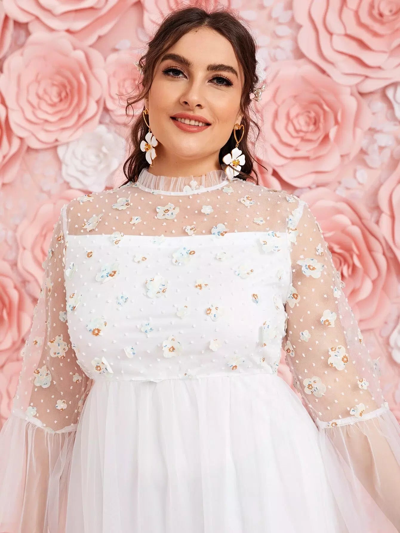 Plus 1 PC Floral Appliques Frill Neck Organza Overlay Dress